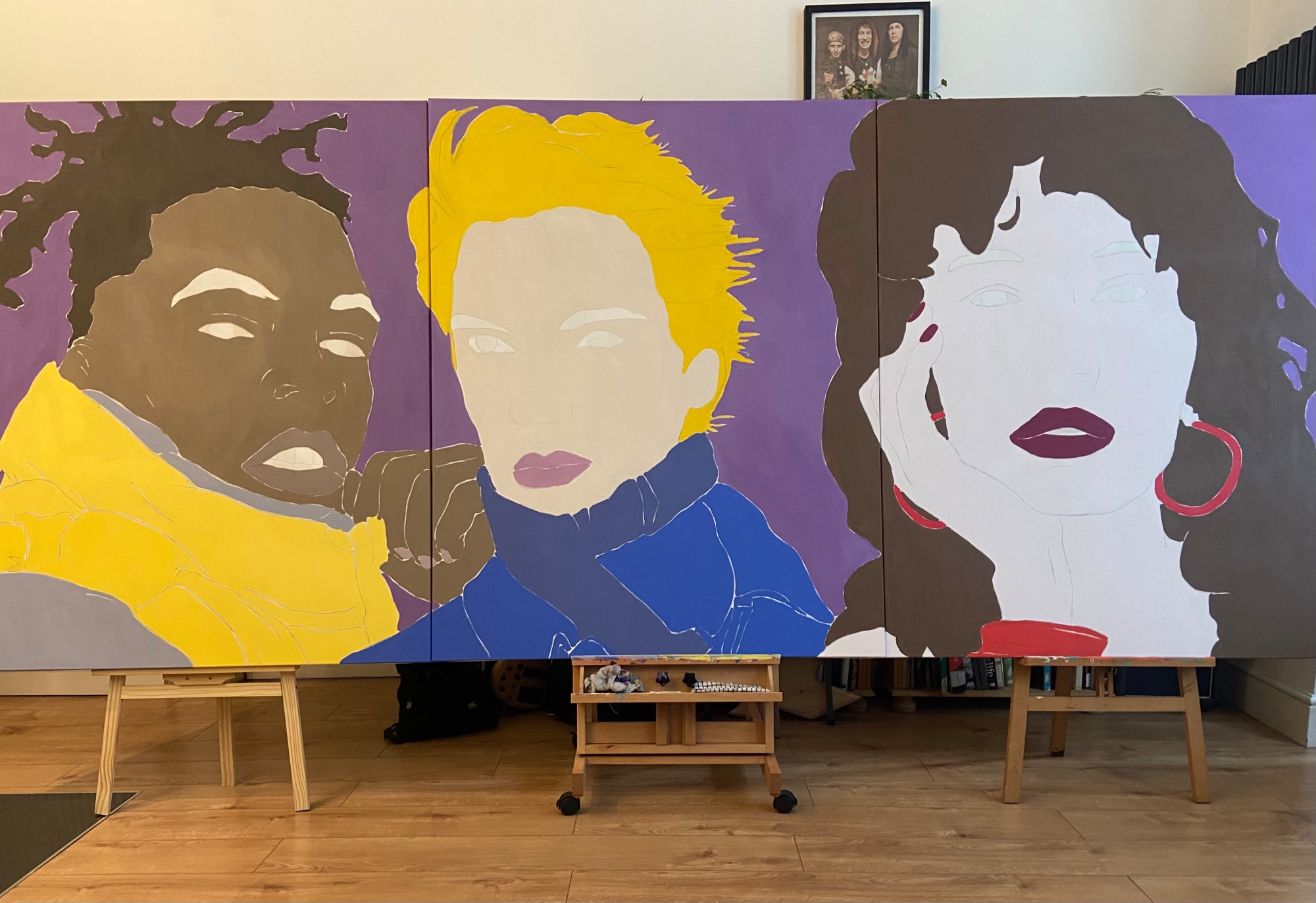 Created from a starting point of 100 preliminary drawings. Three separate canvases combined to complete the finished piece.