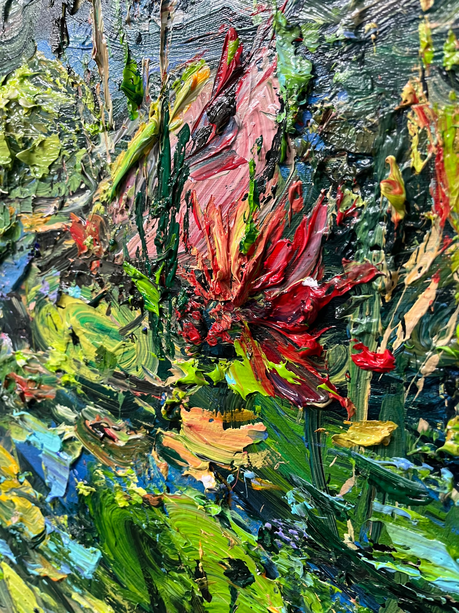 This is the result of the artist's experimentation with his previous series of Water Lilies and nature landscapes where we can notice a transformation within the form of the painting, moving more towards an expressionist and figurative aesthetics. The artist plays with complementary and vivid colors, we can notice a strong brushstroke and drawing features in the artwork .
