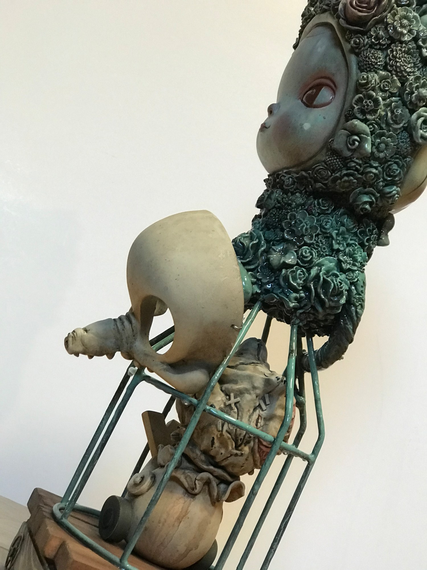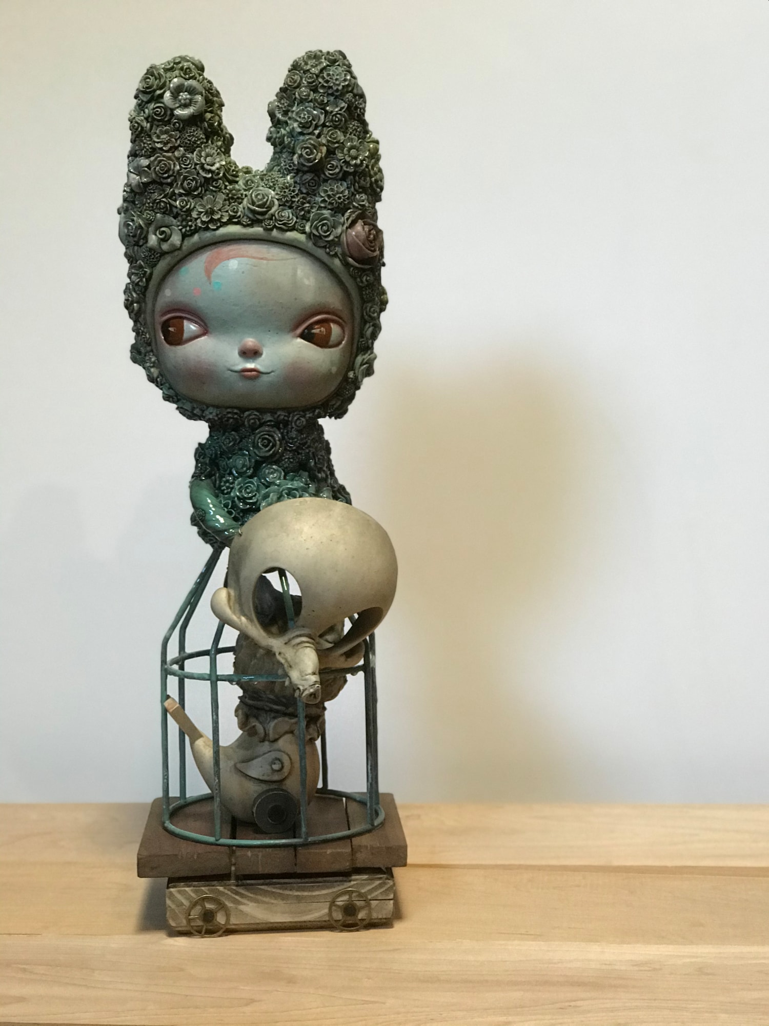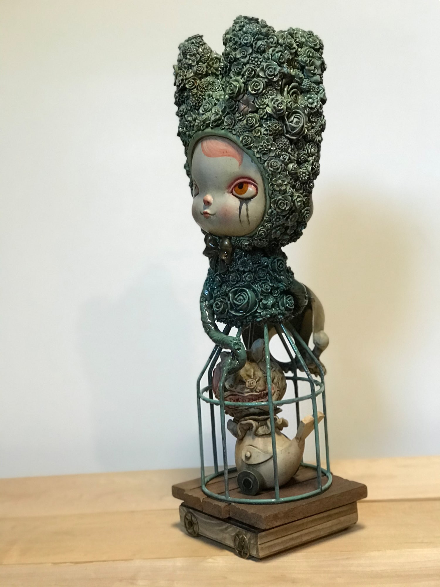 - Oil, acrylic, mixed resin media, Wood, found objects