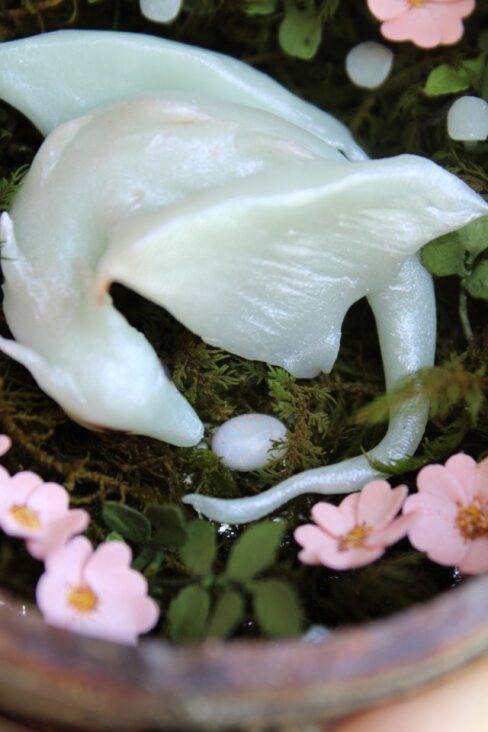• glow-in-the-dark polymer clay, acrylic paint, opal 'egg', paper flowers, glow-in-the-dark pigments, and vintage trinket box