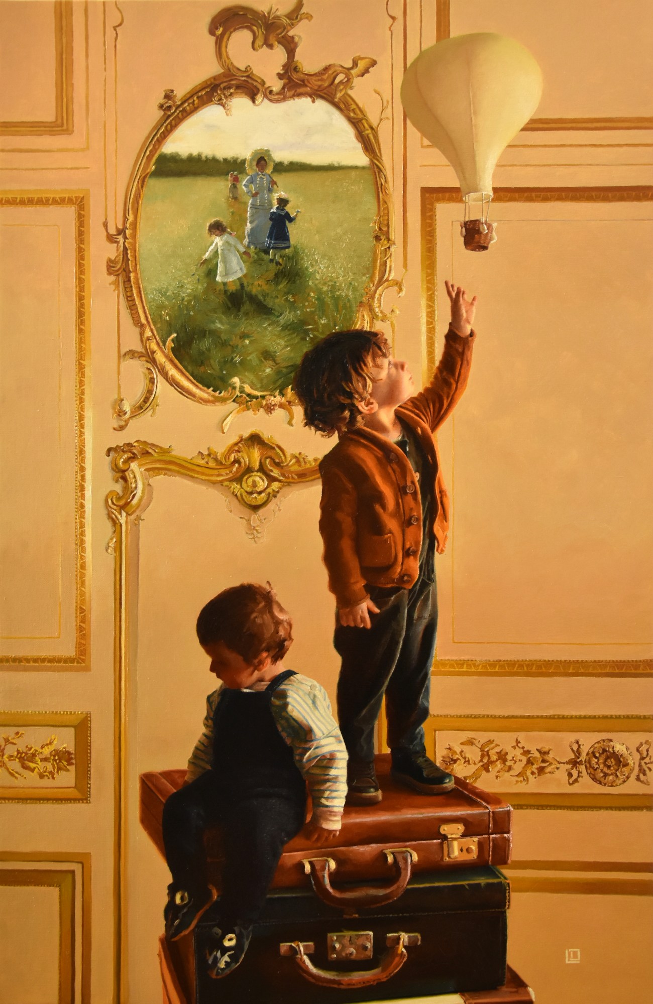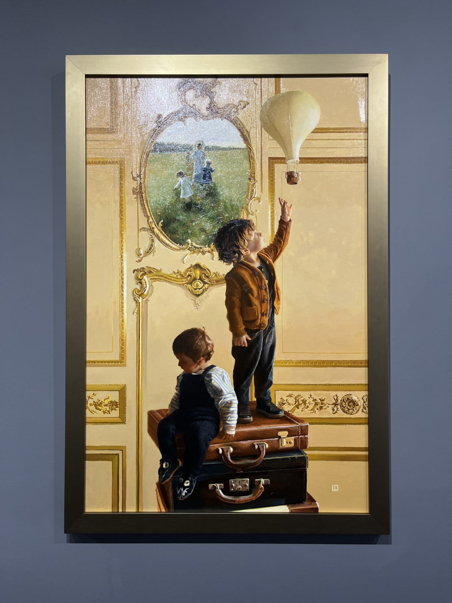 In "A Way Out," I explore the boundless power of imagination and the unwavering hope that resides within us, even in the face of challenging journeys. The young travelers in this painting are on a remarkable odyssey, each suitcase representing a step closer to their destination. Their unwavering belief in the impossible is symbolized by the balloon they hope to reach as their means of escape, despite its apparent limitations.