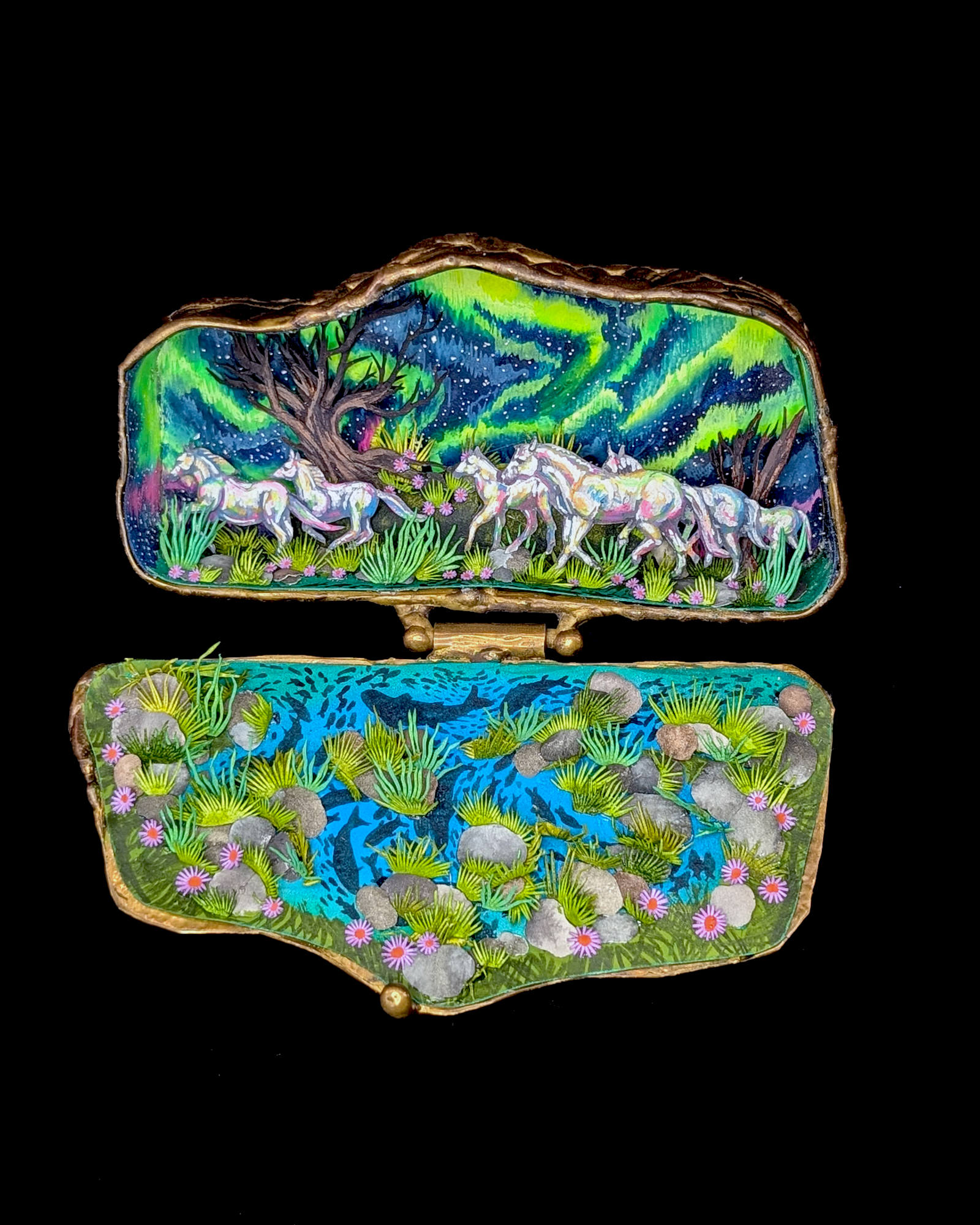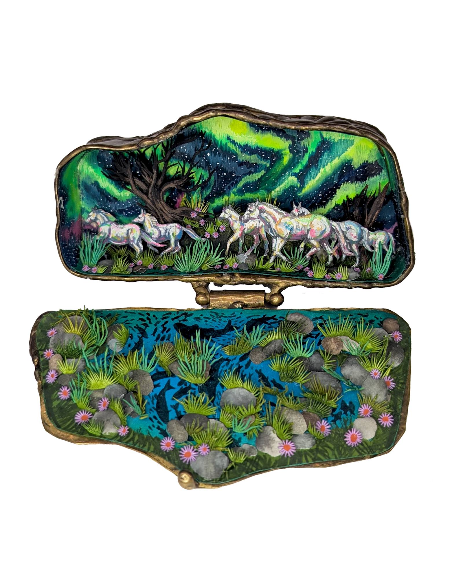 • Hand cut watercolor diorama in antique cosmetic compact