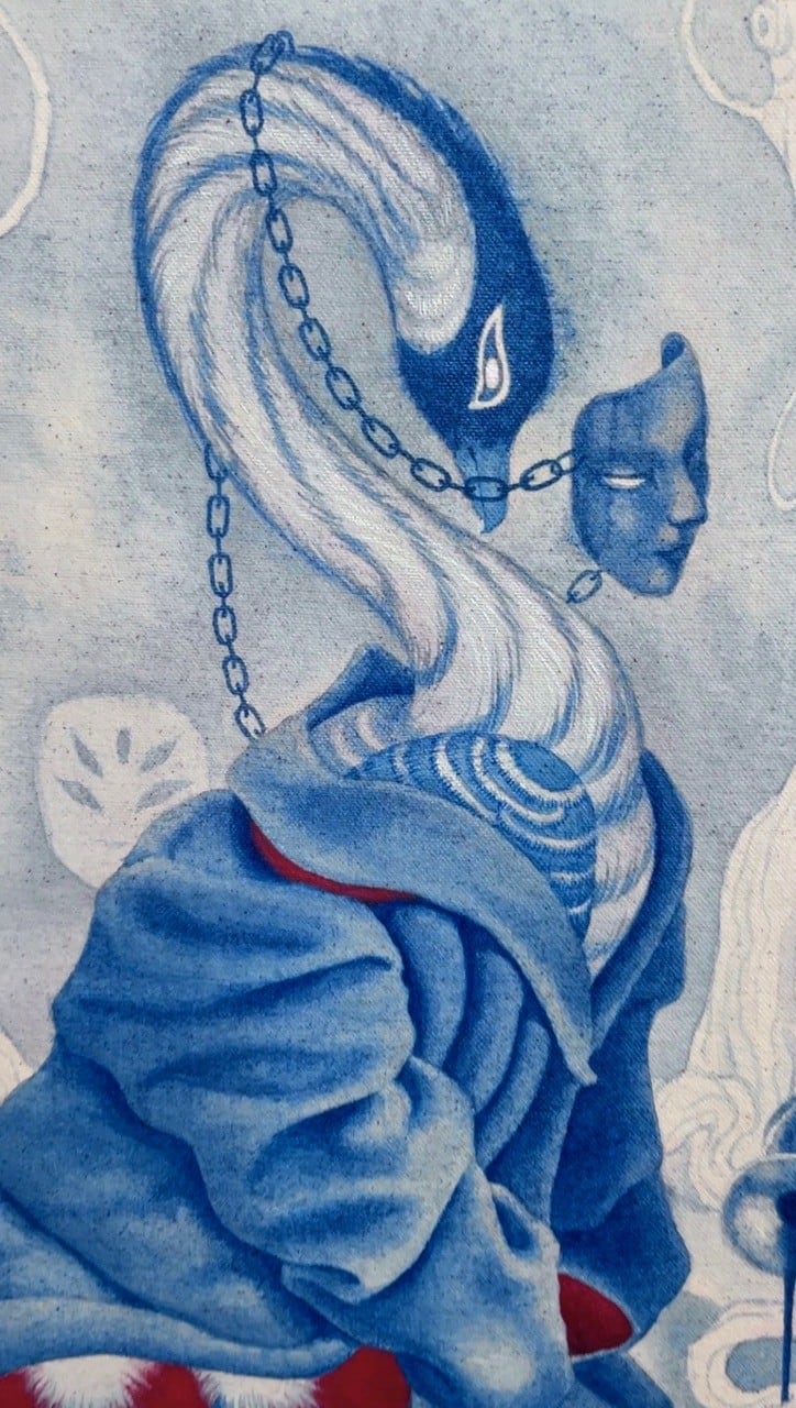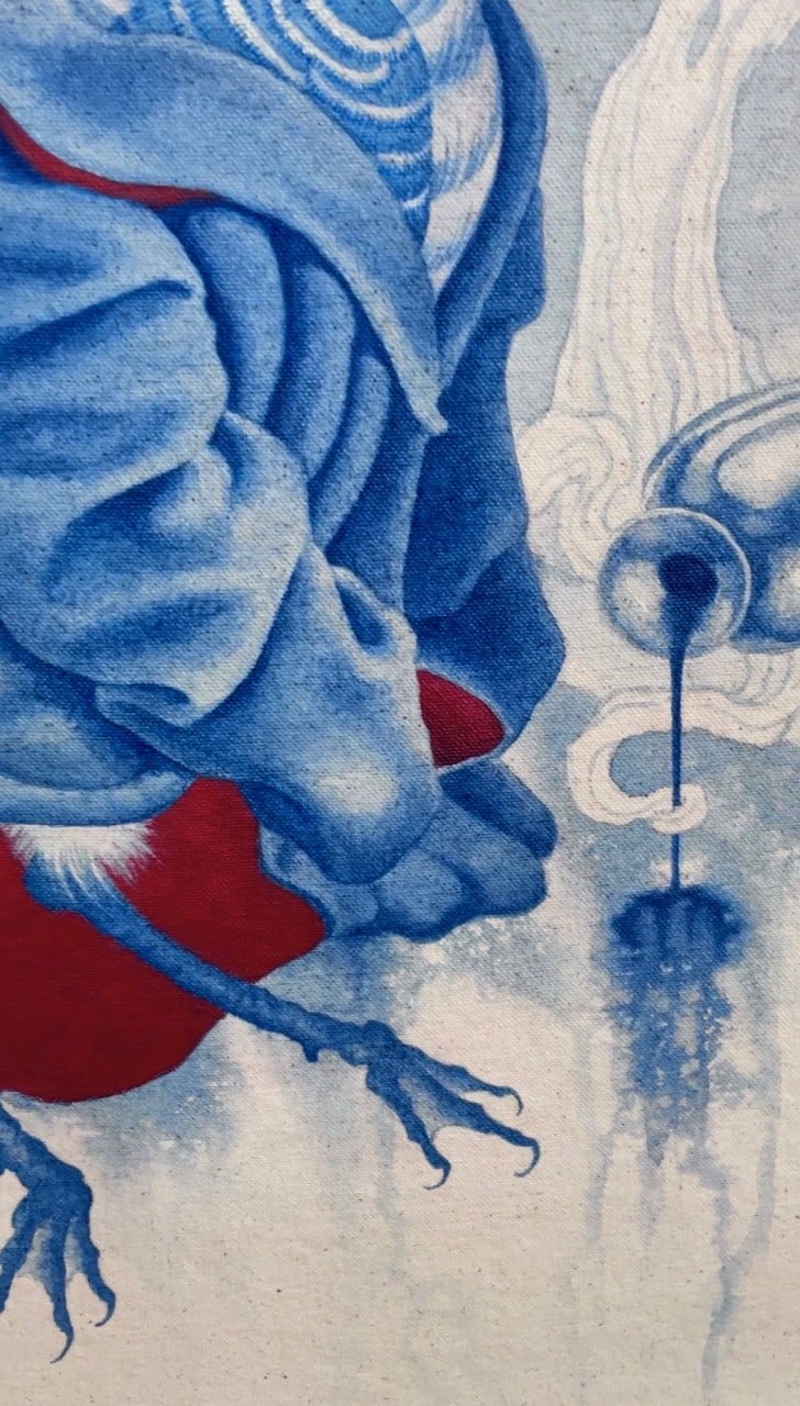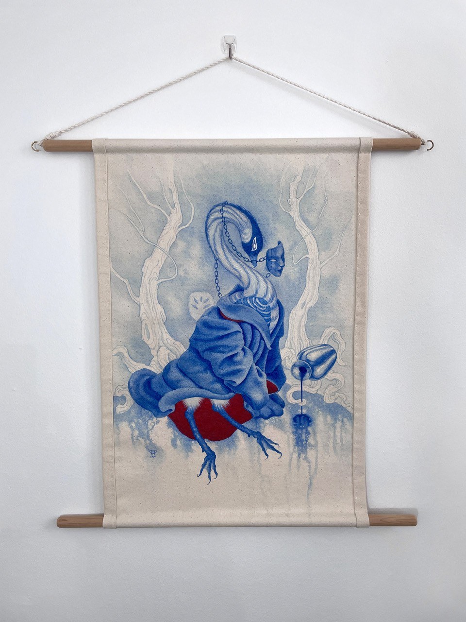 • acrylic on hand-made scroll - sealed raw canvas, wood dowel, brass hooks, cotton string