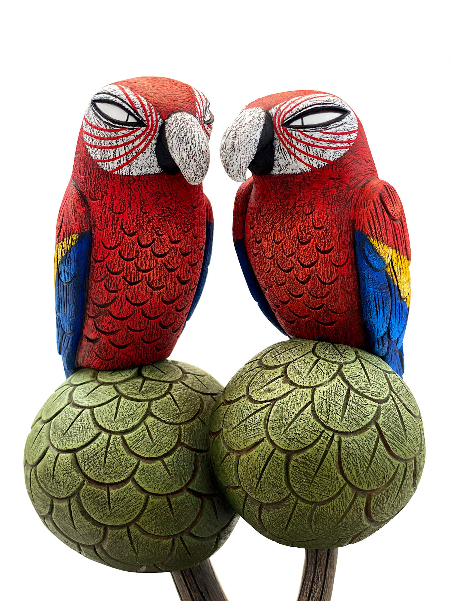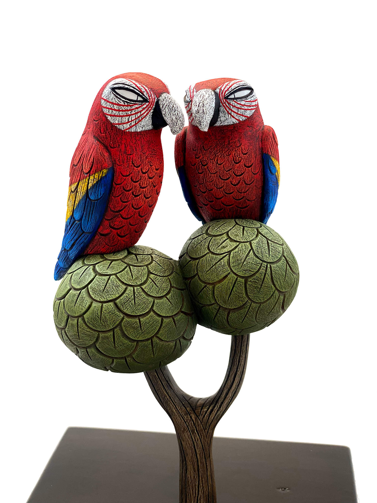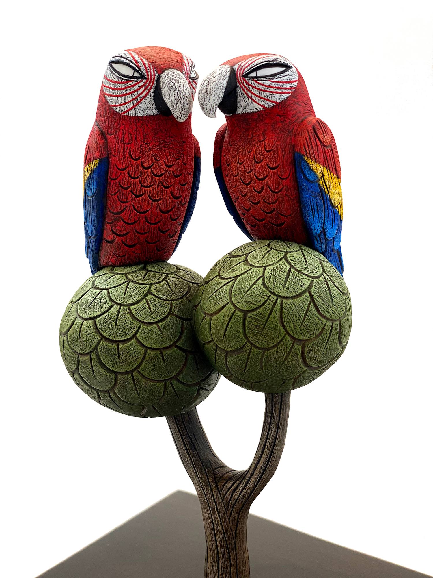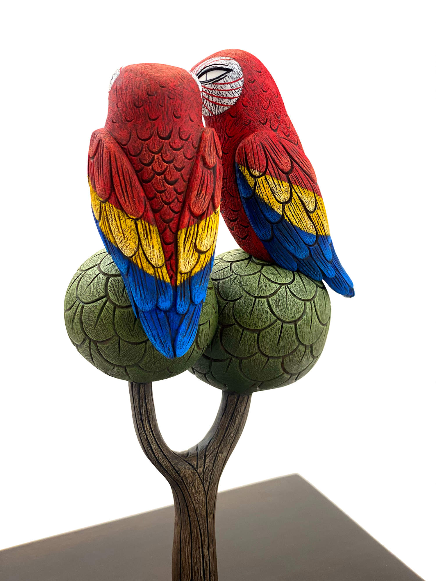 Two Scarlet Macaws perch on a tree, beaks almost touching, in deep conversation.