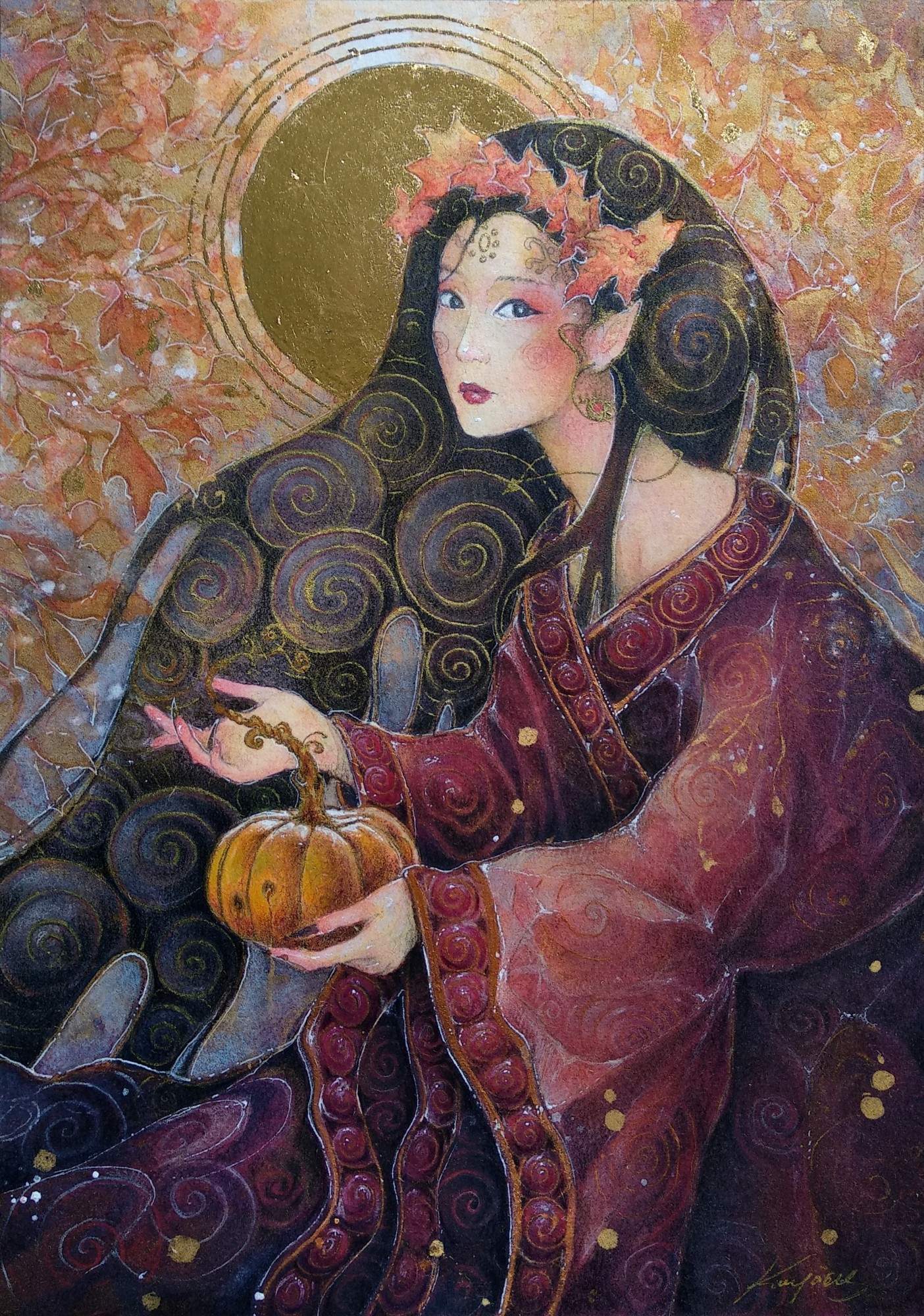 - watercolors, ink, color pencils, 24kt gold leaf & shell gold on hot pressed paper