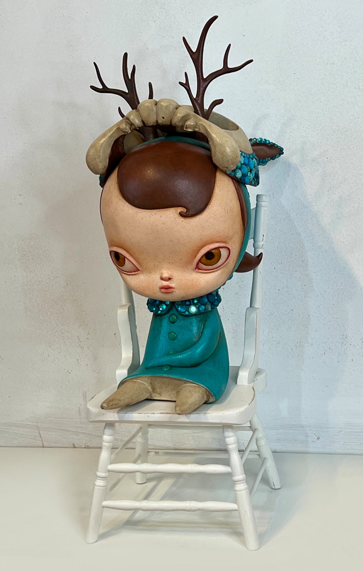 Removable mask, antlers hood the mask in place/ piece is top heavy and is secured when placed on chair.