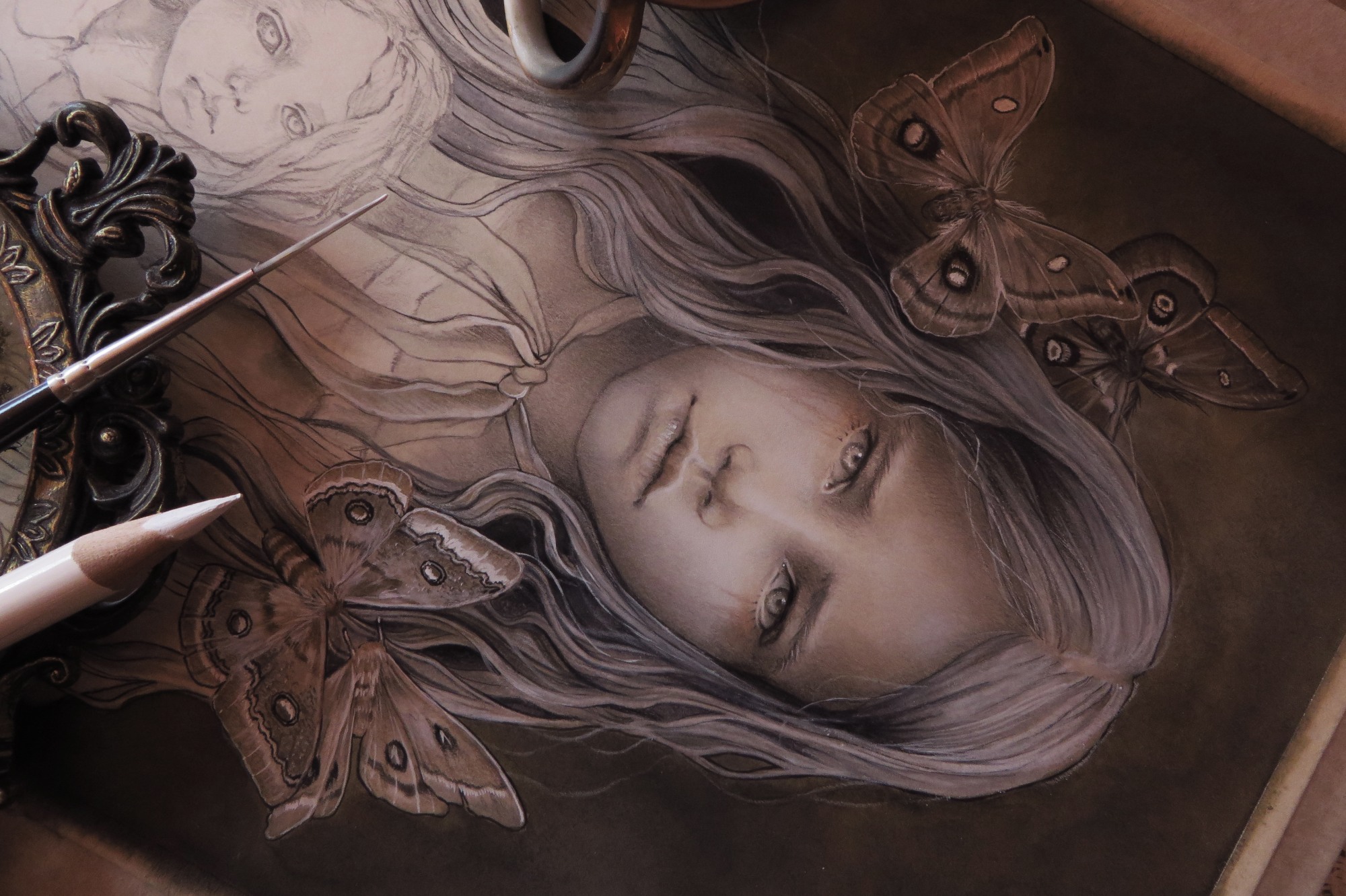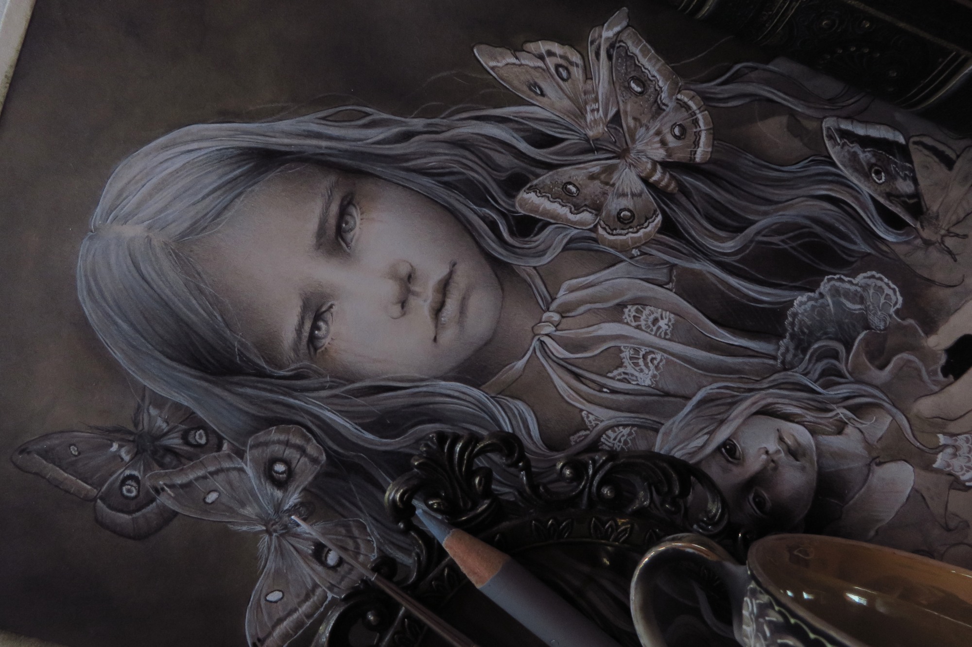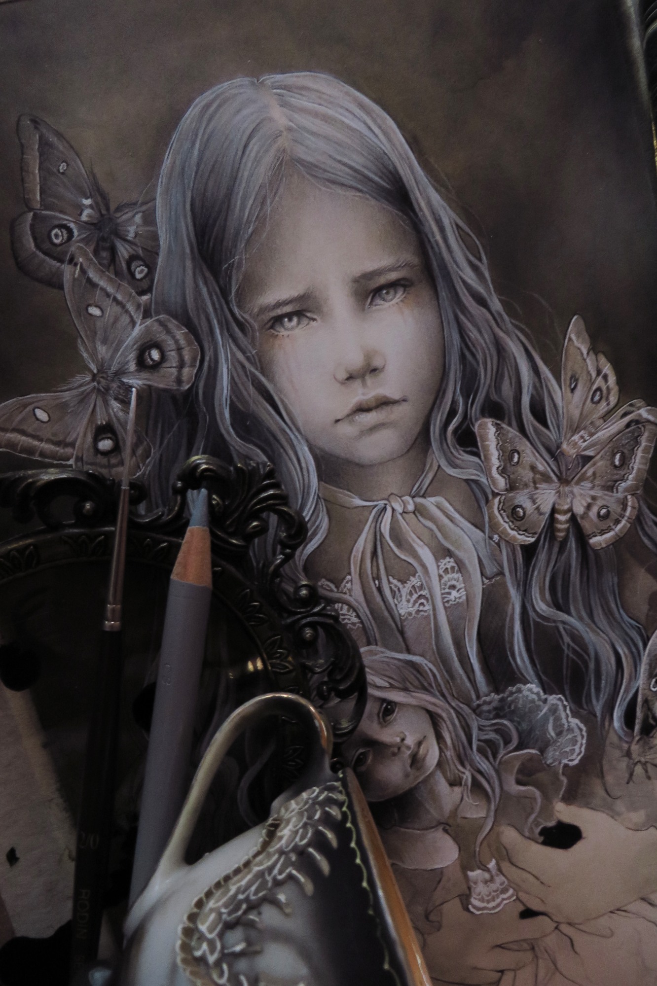 - mixed media, watercolor, gouache, inks, markers, pastel color, graphite and colored pencils on cardboard
