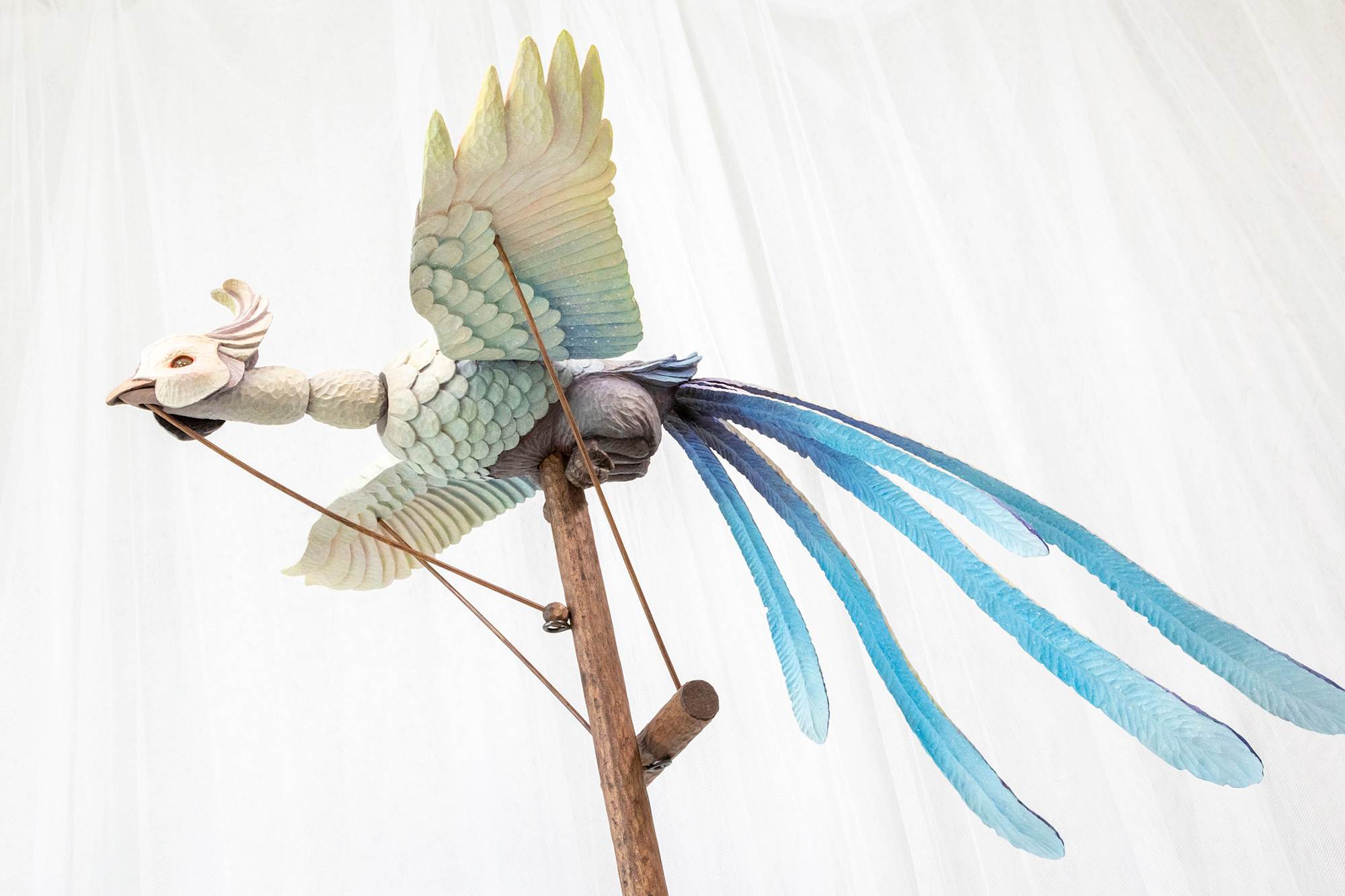 A large hand-carved wooden puppet of a white phoenix with movable wings,