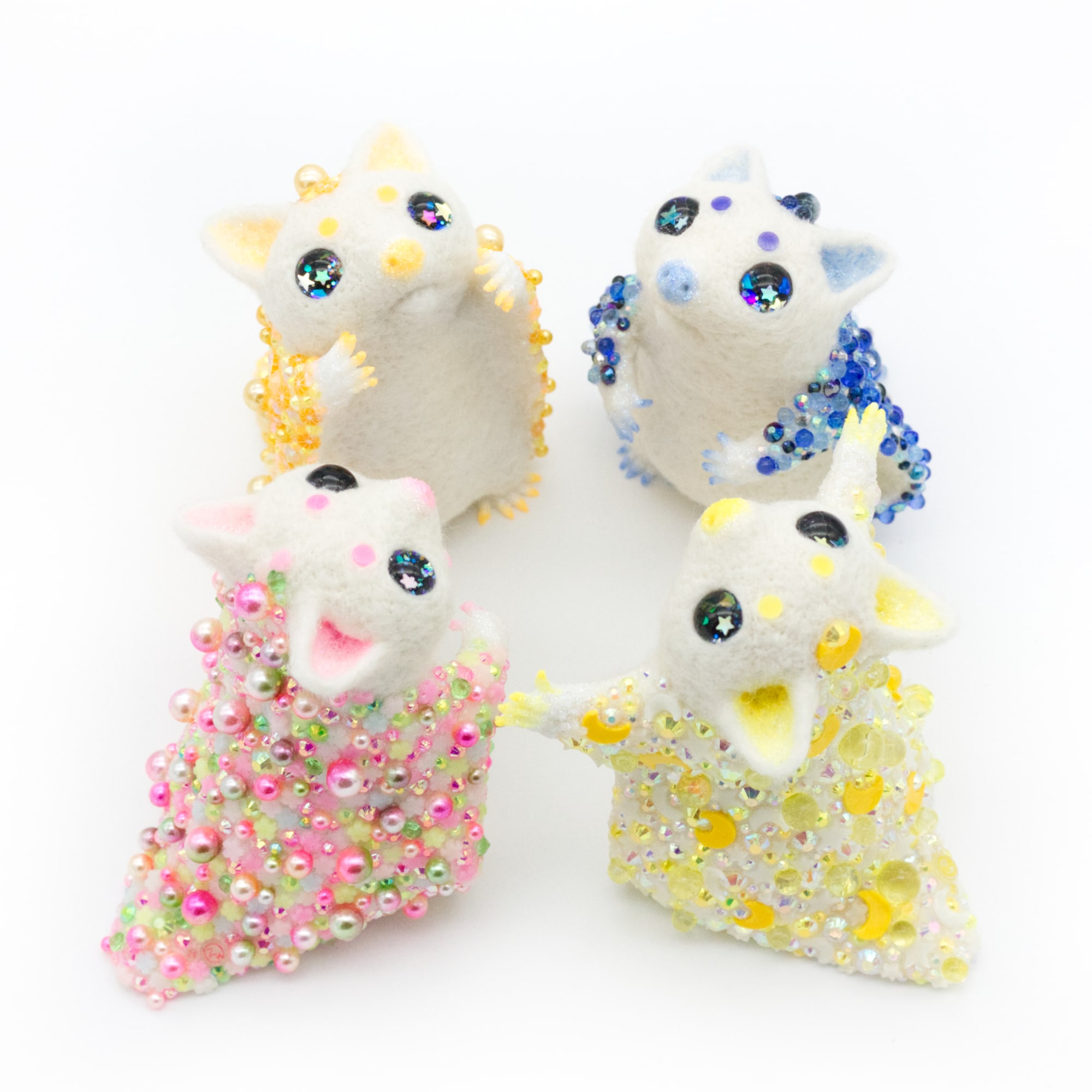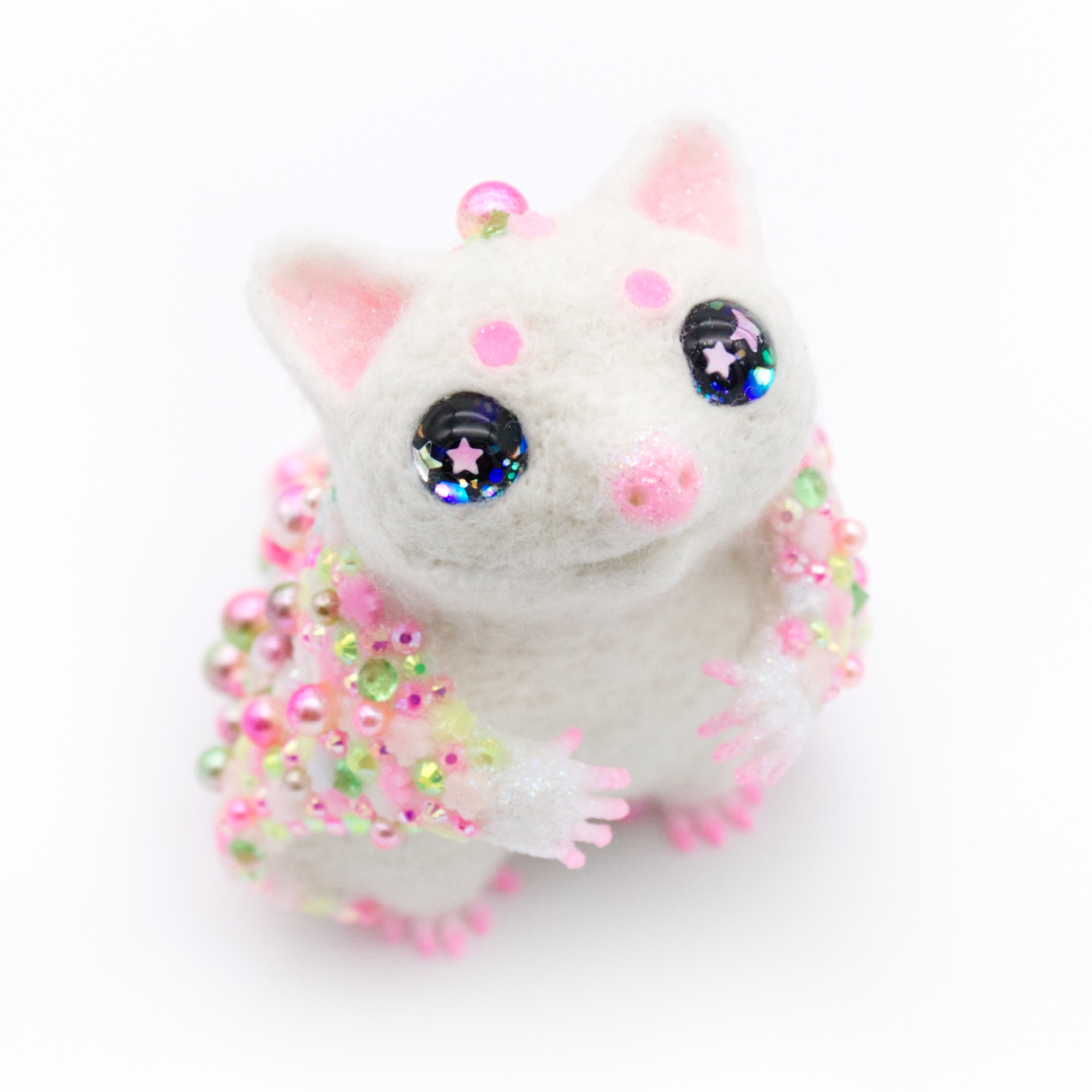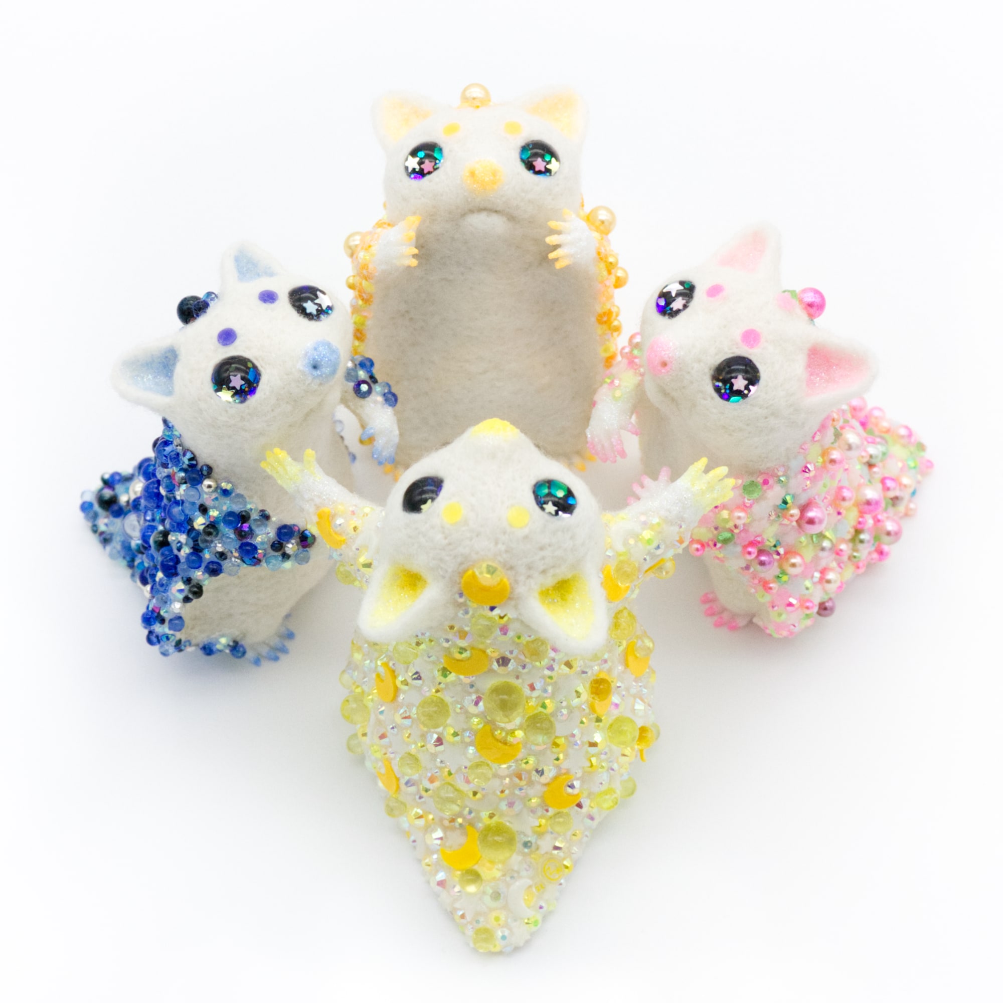- wool felt, resin, polymer clay slices, acrylic paint, rhinestones, glitter, hand painted glass eyes