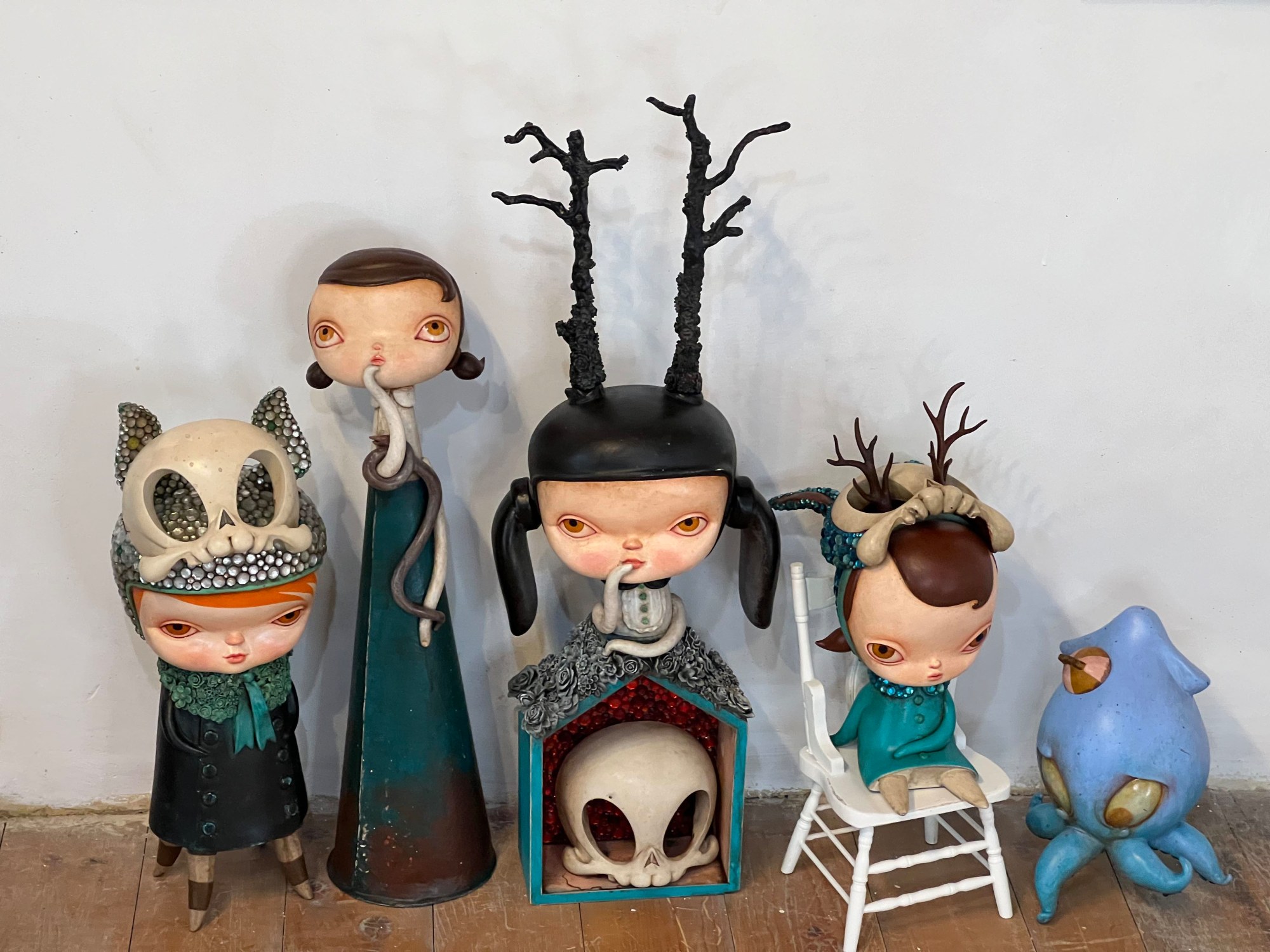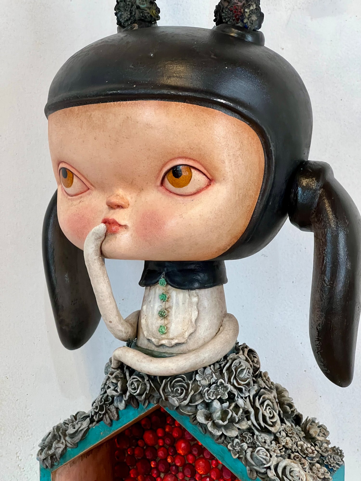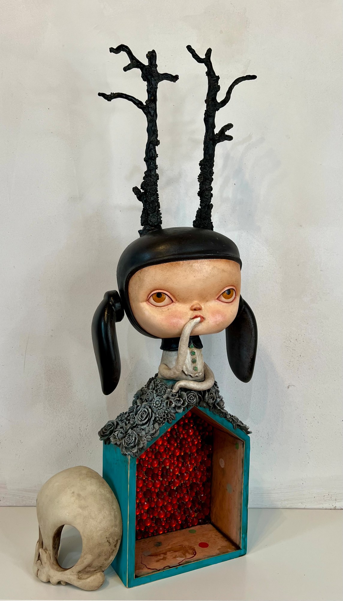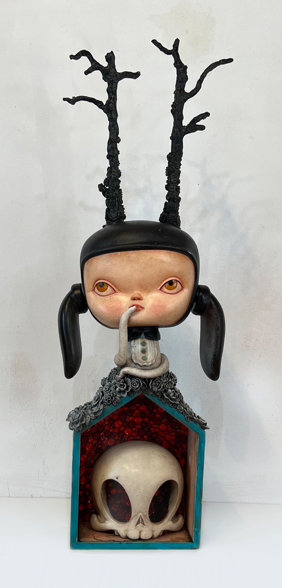 - Oil, acrylic, epoxy resin, found objects on cast resin, wood