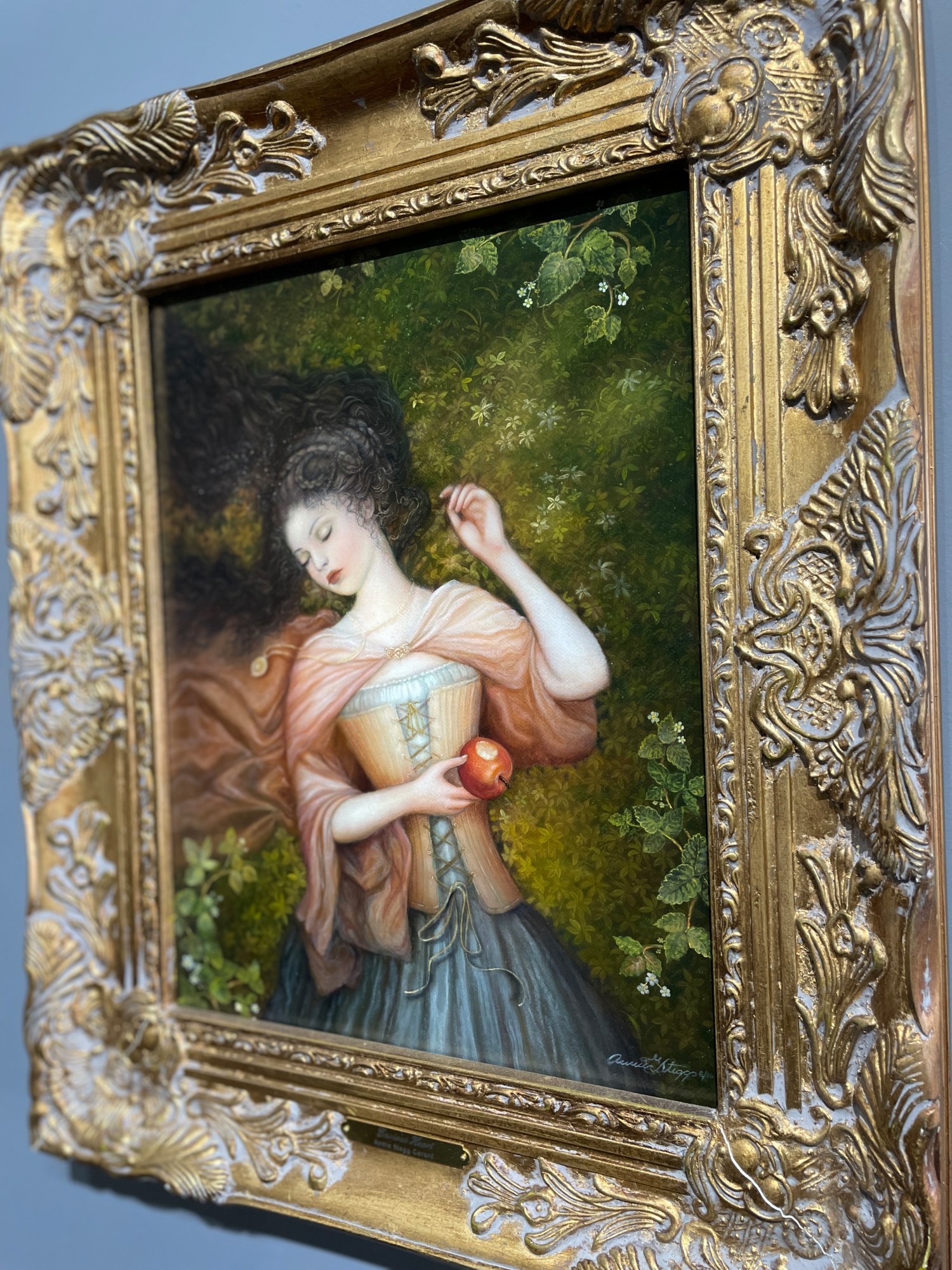 "Snow-White longed for the beautiful apple, and when she saw that the peasant woman was eating part of it she could no longer resist, and she stuck her hand out and took the poisoned half. She barely had a bite in her mouth when she fell to the ground dead."