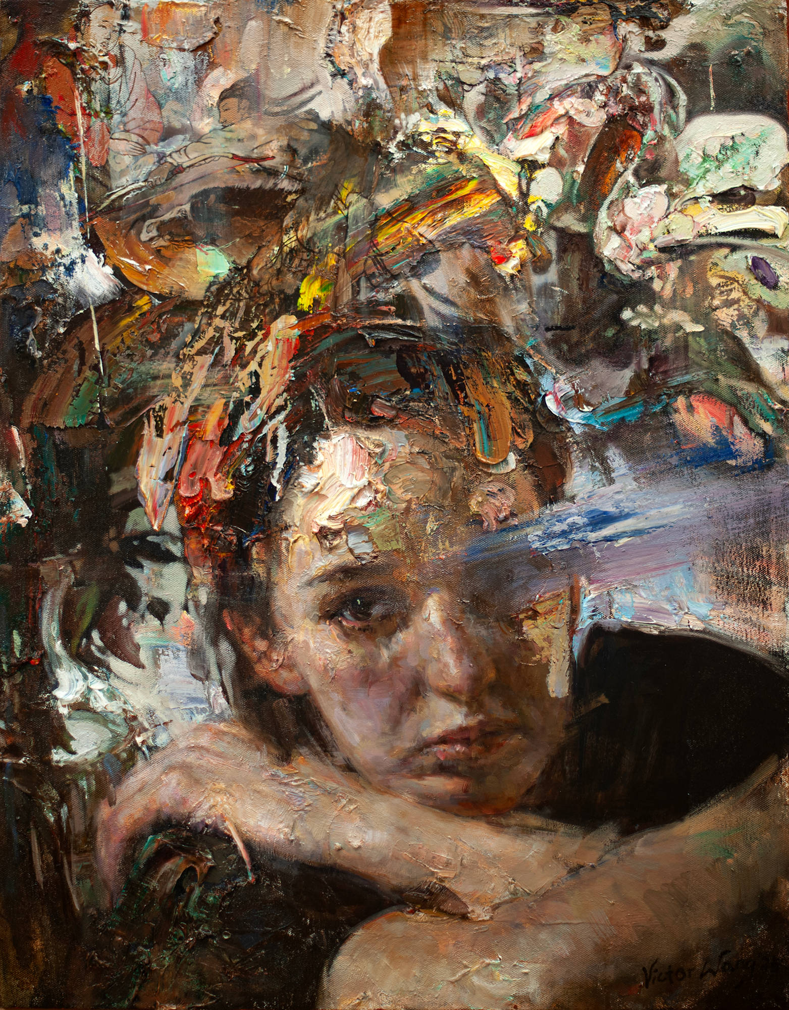 Victor Wang’s painting has explored the emotional weights of memory, migration and identity. The vibrant, thickly applied paint and energetic, hyperactive brushwork found in Wang’s paintings are immediately engaging and fascinating to the viewers. His timeless female figures coax, taunt, and intrigue while a dense narrative of joy and pain unfolds in his brilliantly layered, narrative works. Utilizing elements of collage of Chinese figures from Tang dynasty on his canvases not only express the artist’s Chinese heritage but also create a multi-layered background for the depiction of the beauty of Western women. Victor Wang’s haunting and bold canvases have become the visual equivalent of “East Meets West.”
