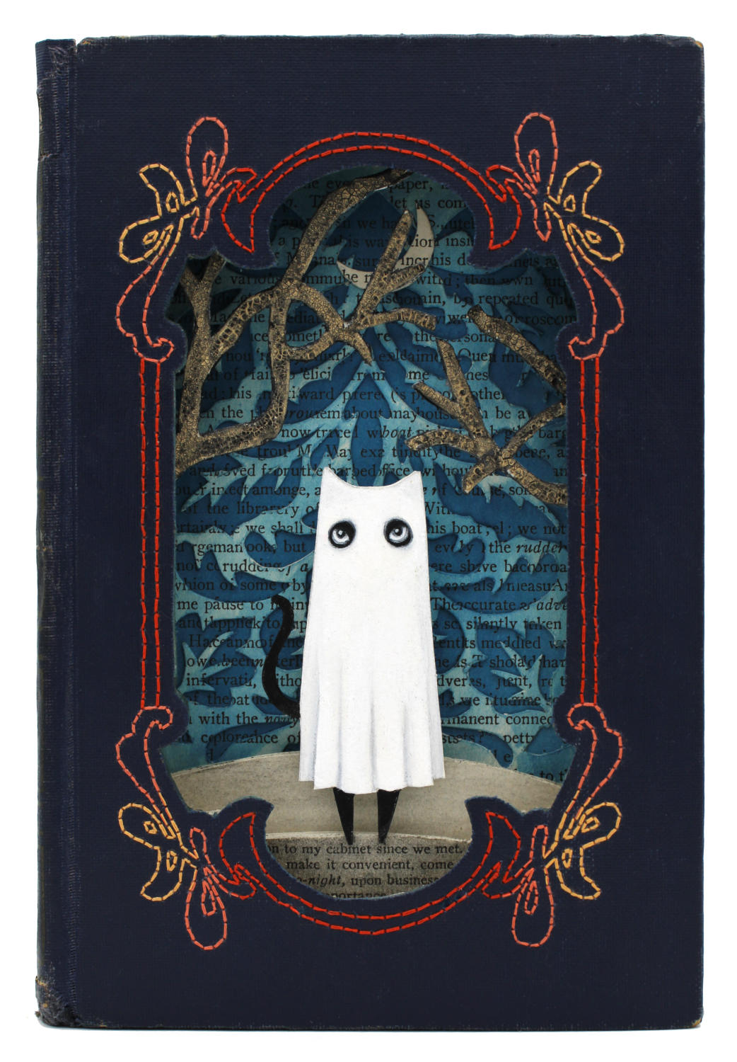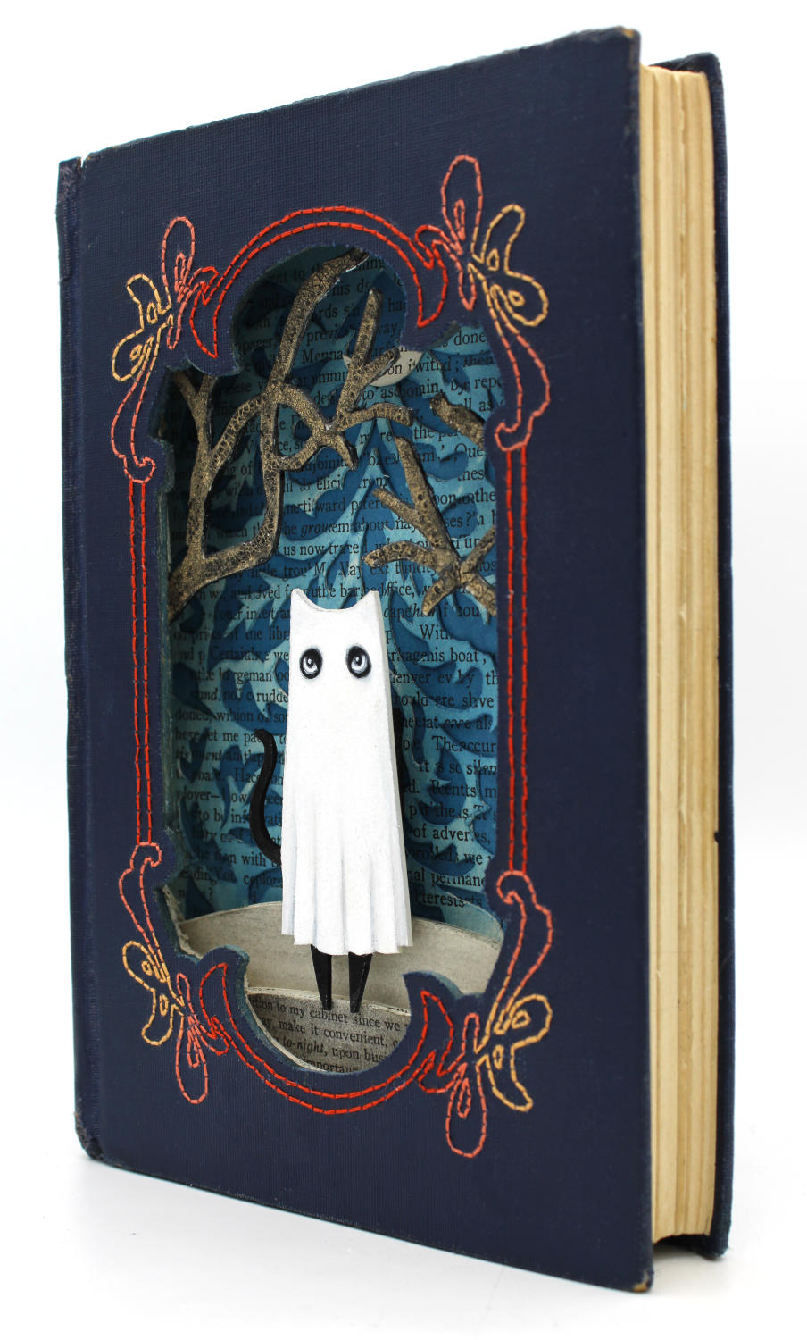 - Hand cut altered book, acryla gouache, stain, acrylic, vintage thread