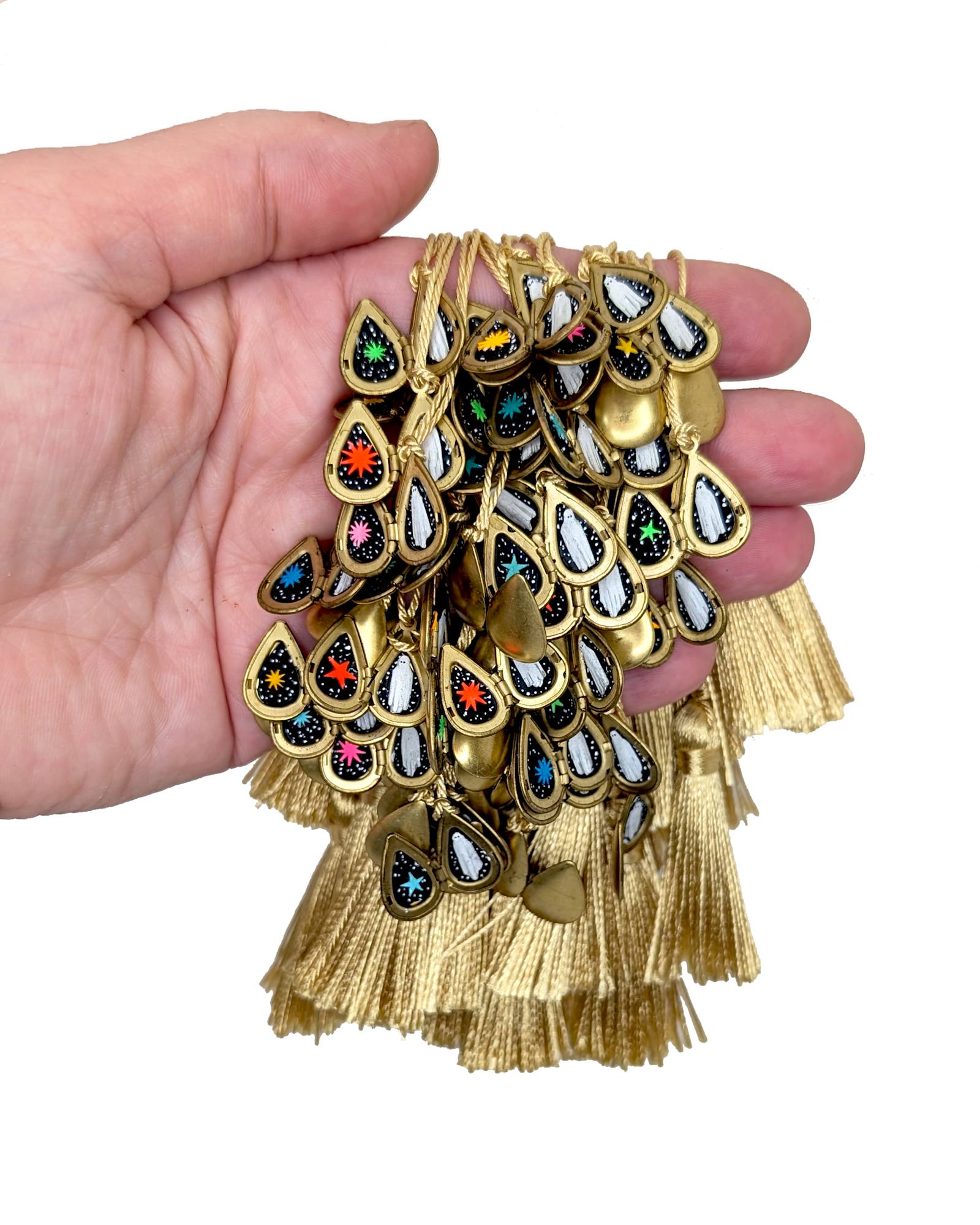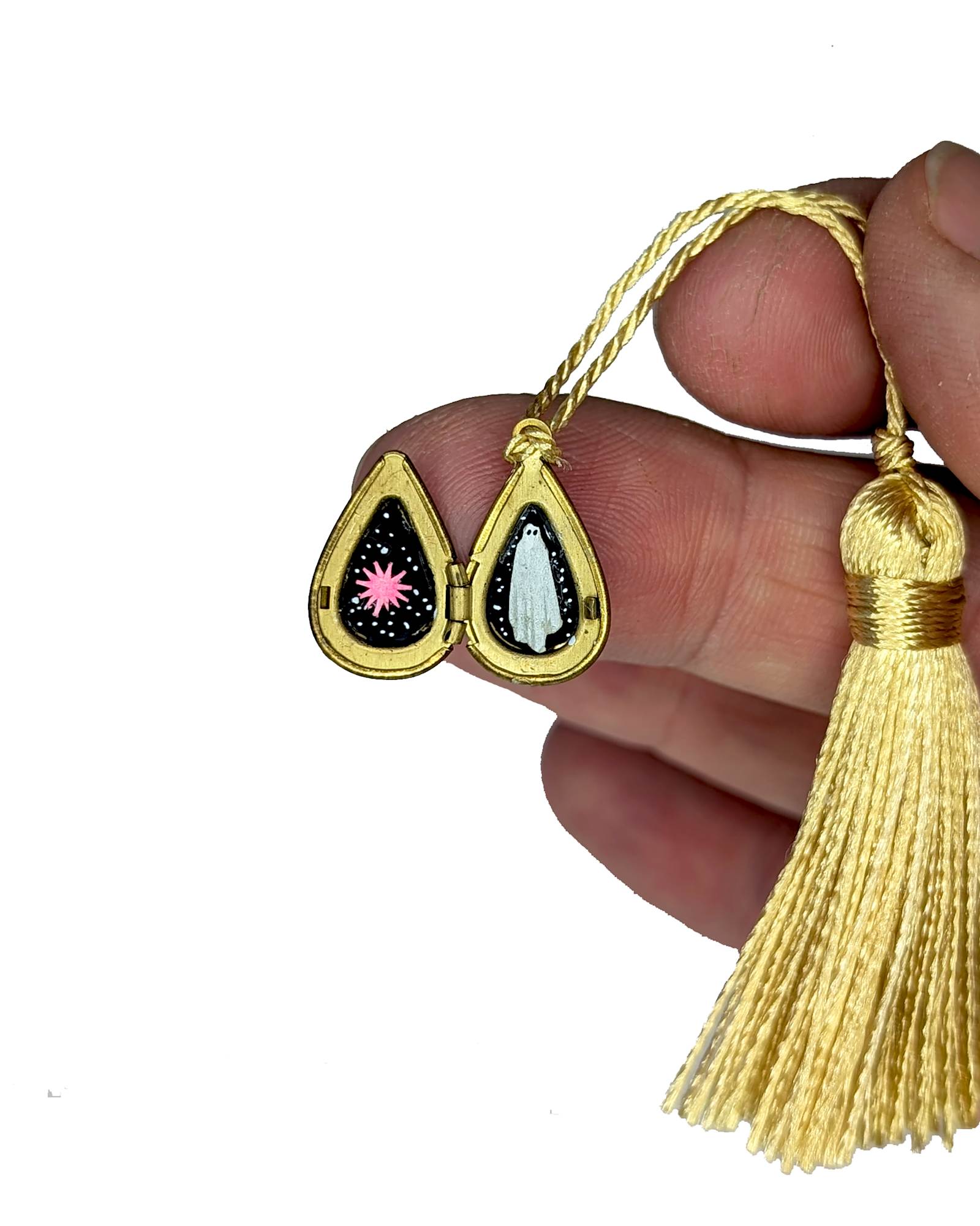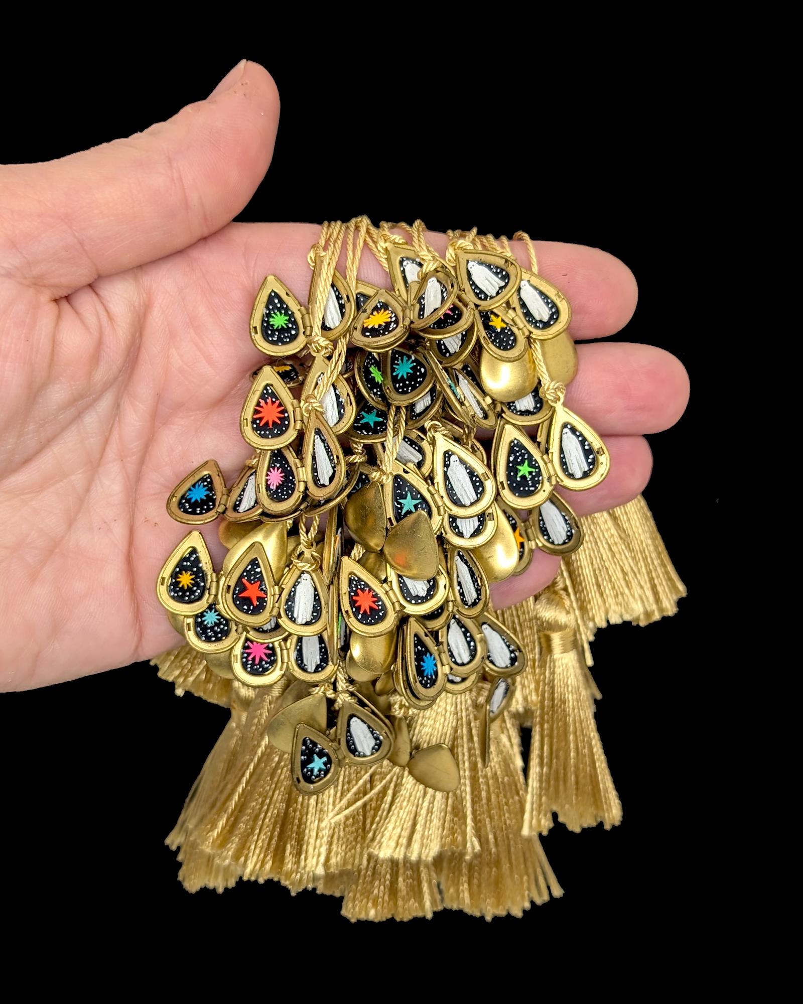 - Hand cut watercolor diorama in miniature brass locket with tassel