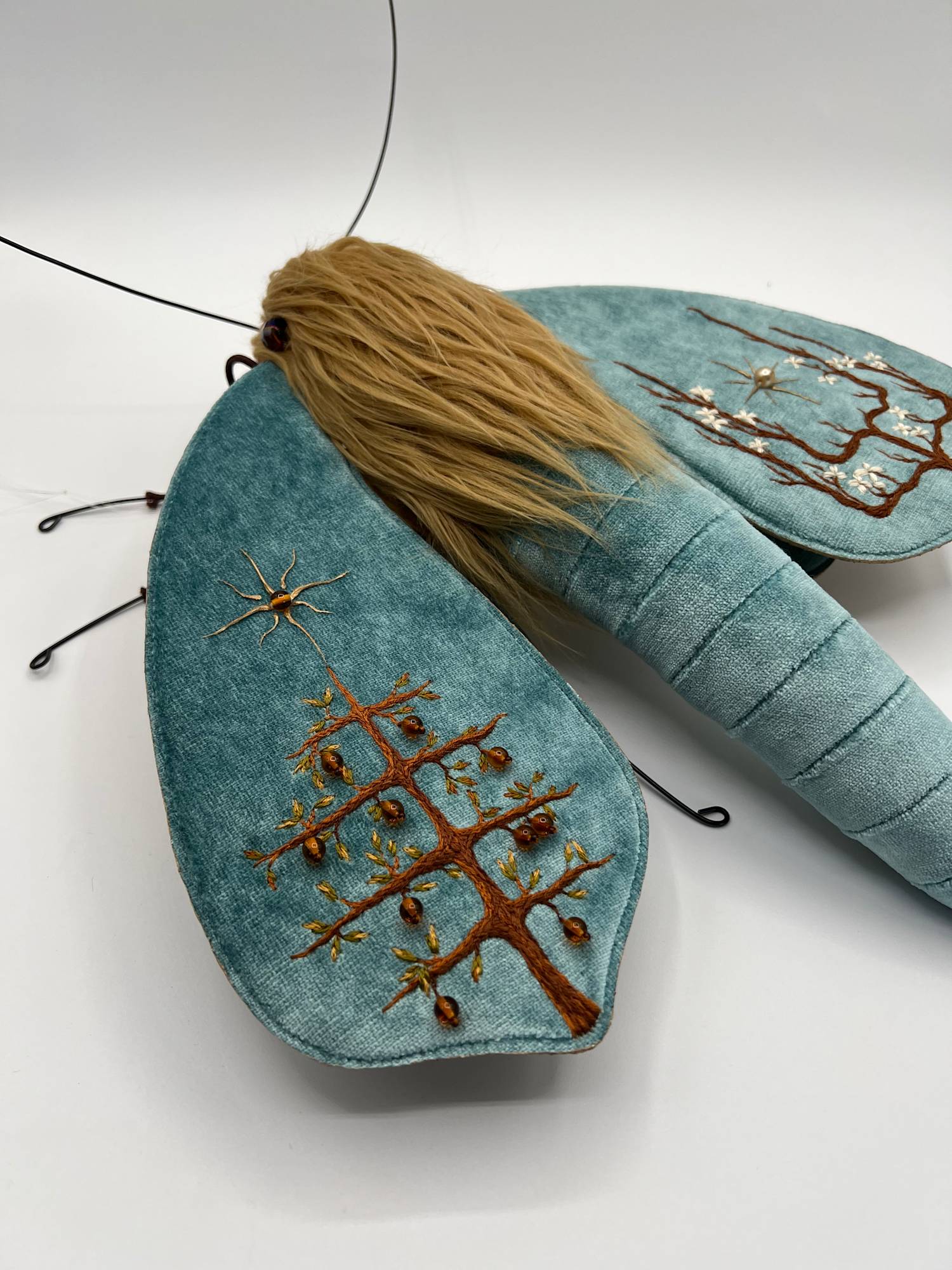 - Hand embroidery and beading on cotton velvet with elements of antique textile, Belgian linen, steel wire, mixed media