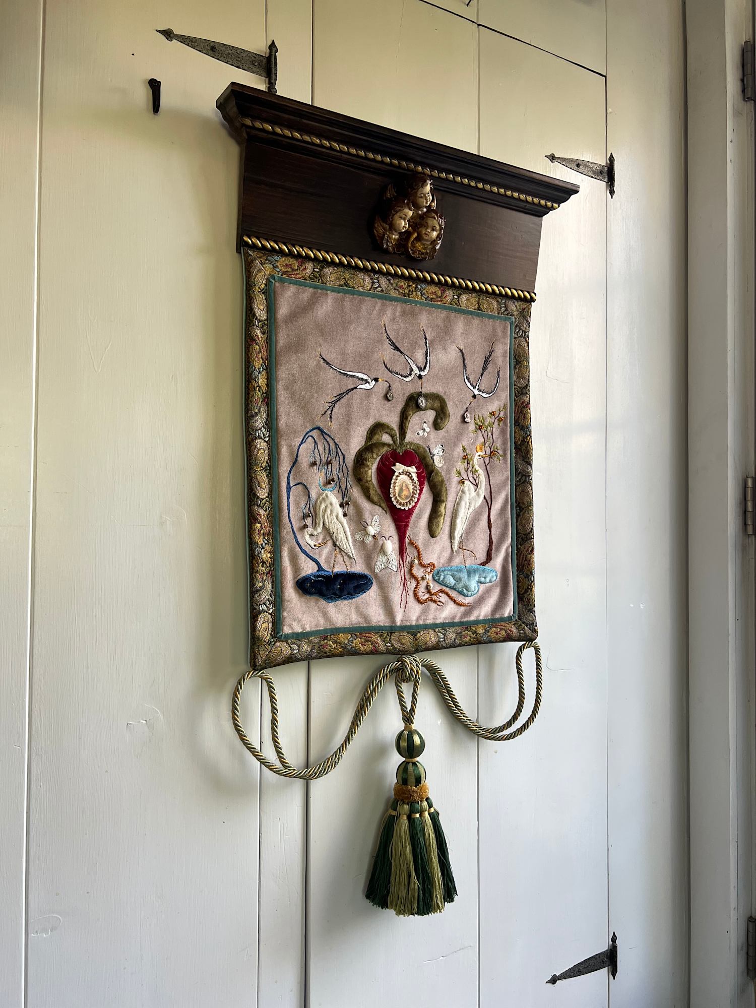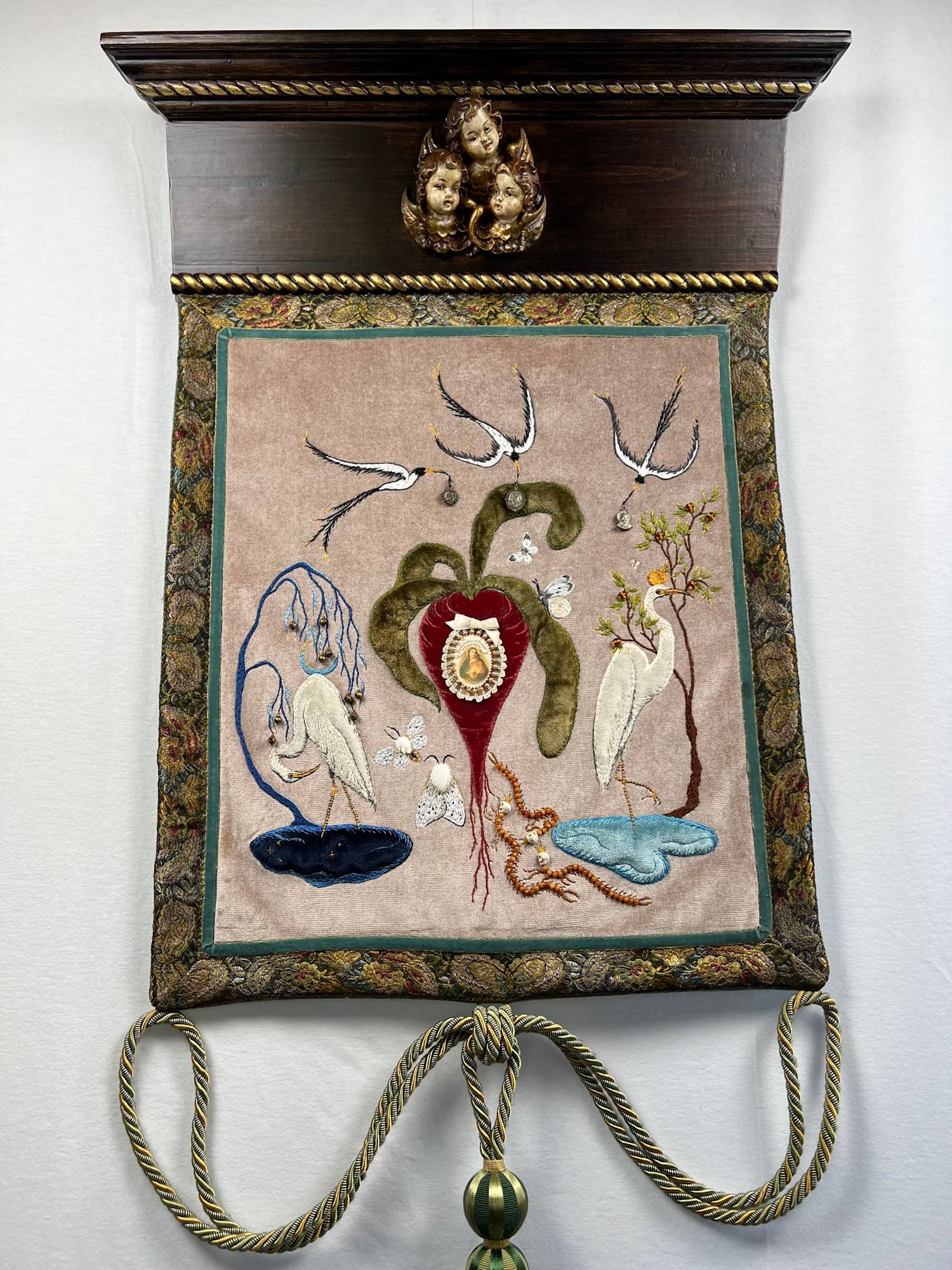 - Hand embroidery and beading on cotton velvet with elements of antique textile and antique devotional medallions