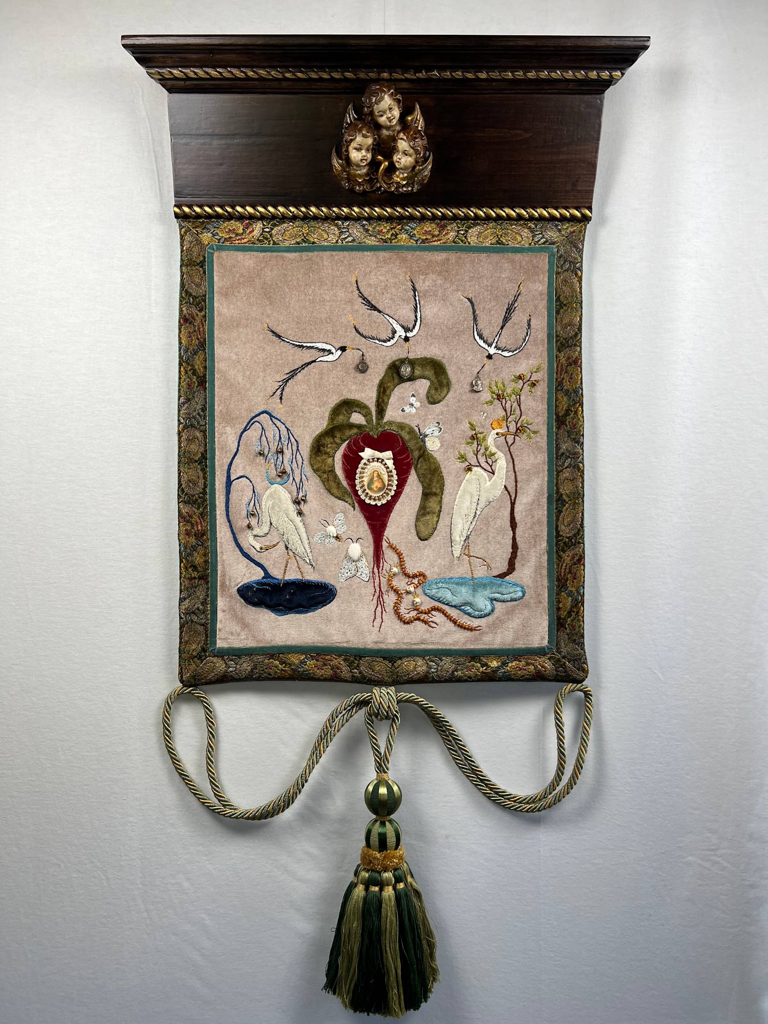 - Hand embroidery and beading on cotton velvet with elements of antique textile and antique devotional medallions
