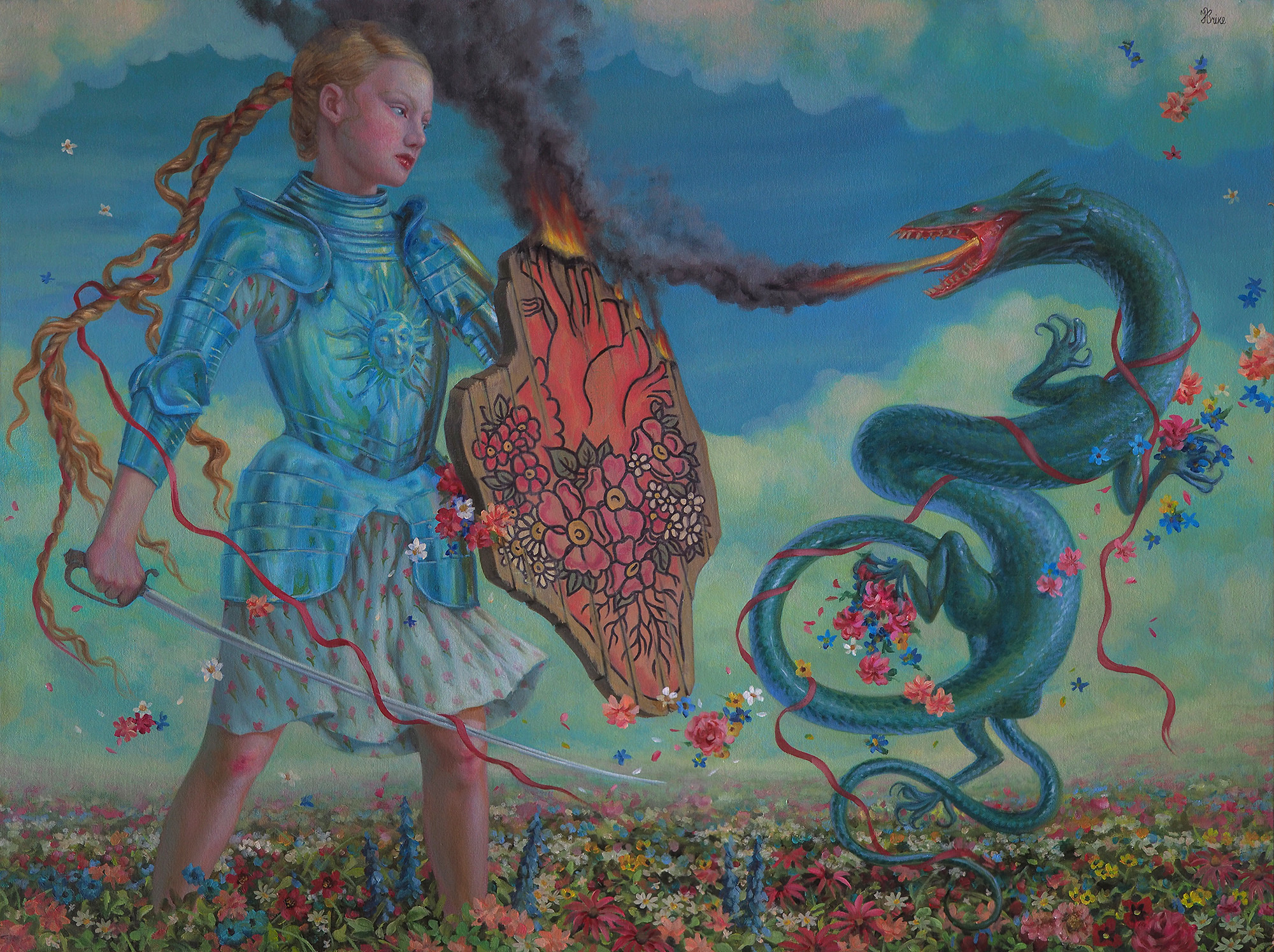 The artwork is a play on the classical motif of a lady in distress and the dragon. It of course represents the world where the lady herself is to be reckoned with - a force in her own right - and doesn’t need an outsider to race for her rescue. She makes her own decisions and fights for her own destiny and she comes with her own territory, she fiercely protects her own inner sacred space.