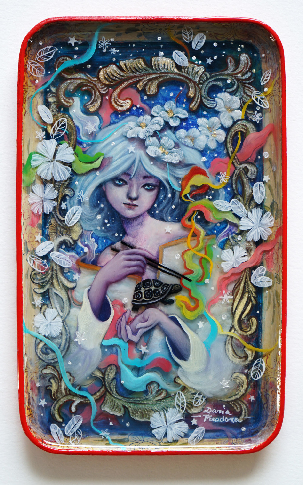 • mixed media (oil, acryla gouache, 24k gold) between resin layers on vintage tray