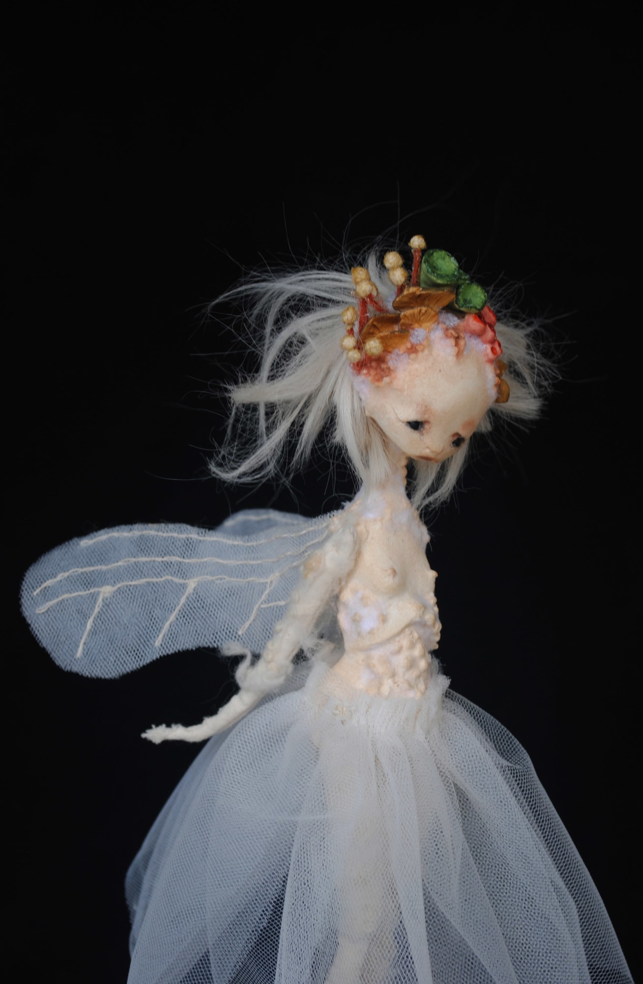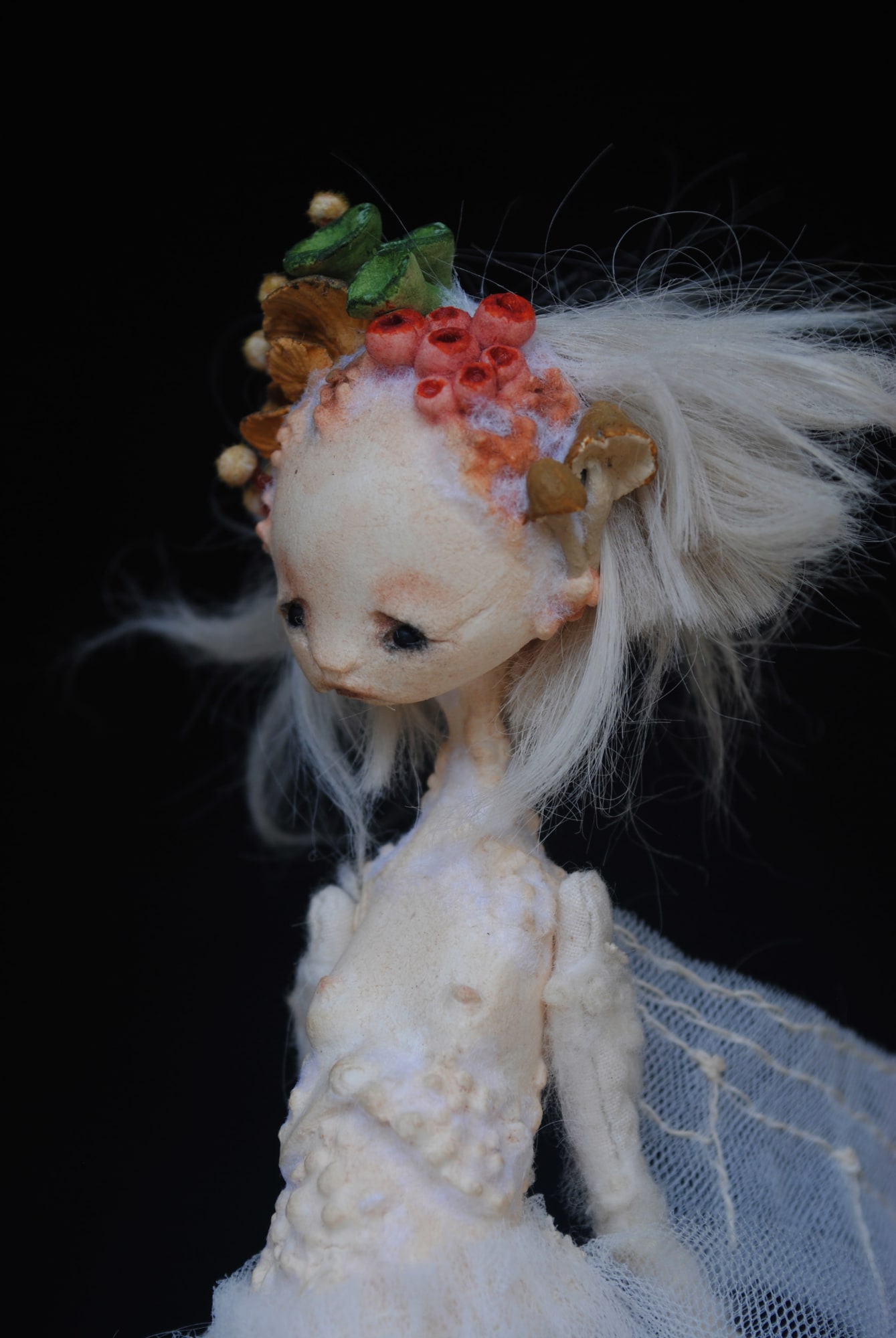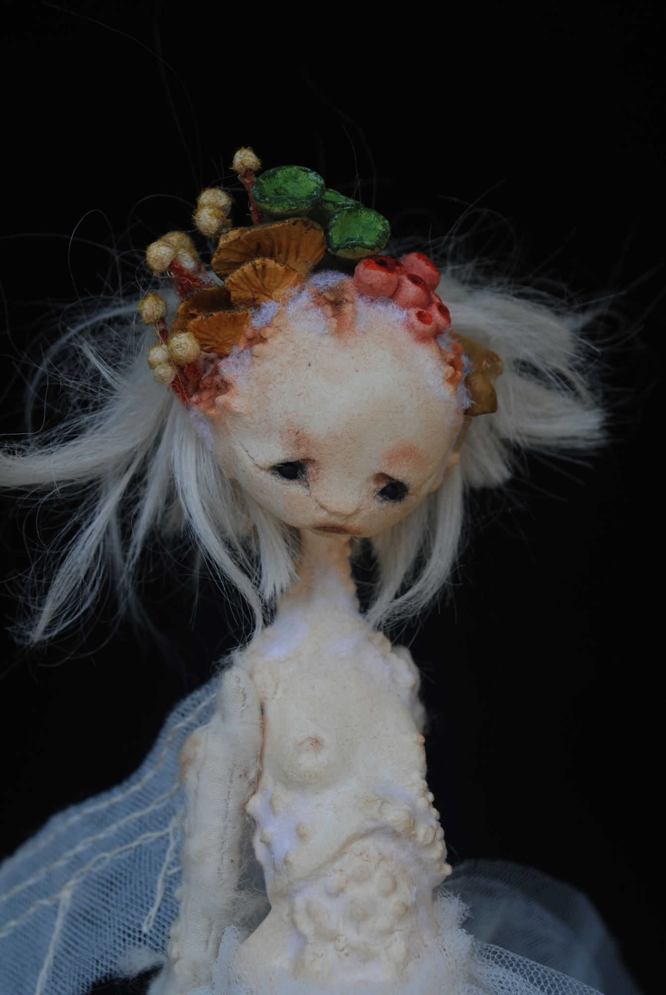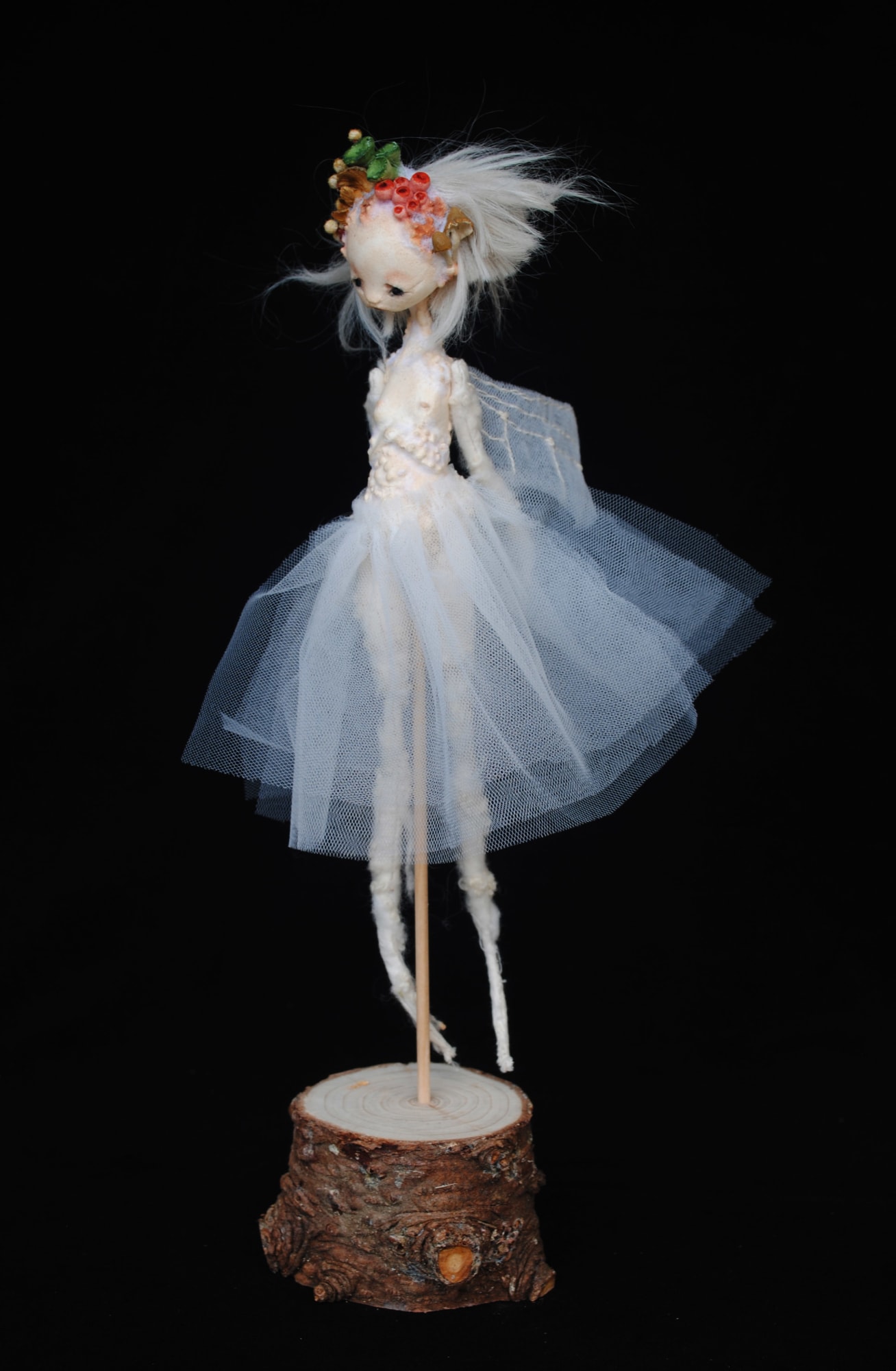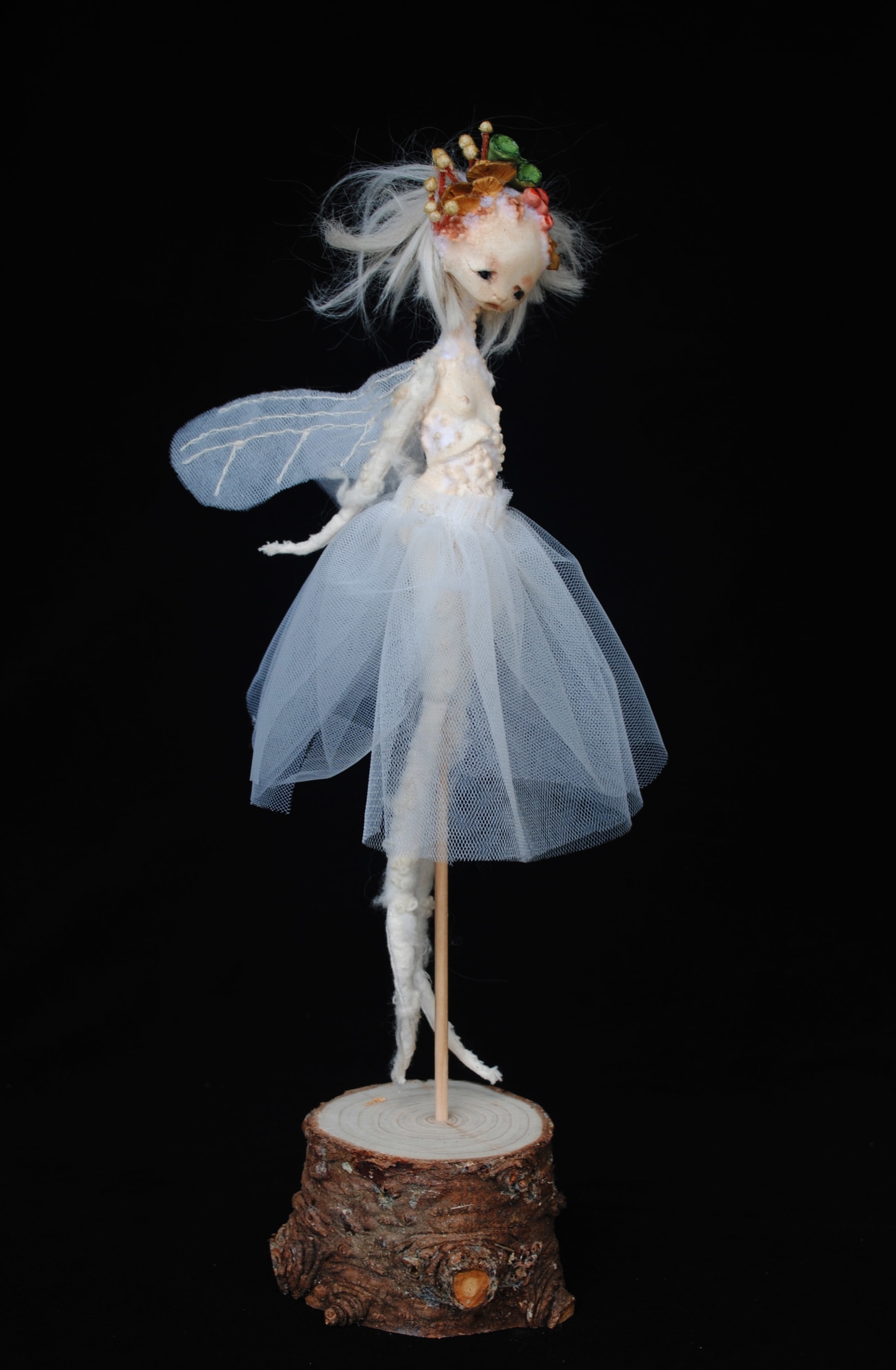 - Stone clay, alpaca fiber, muslin and tulle, fir base