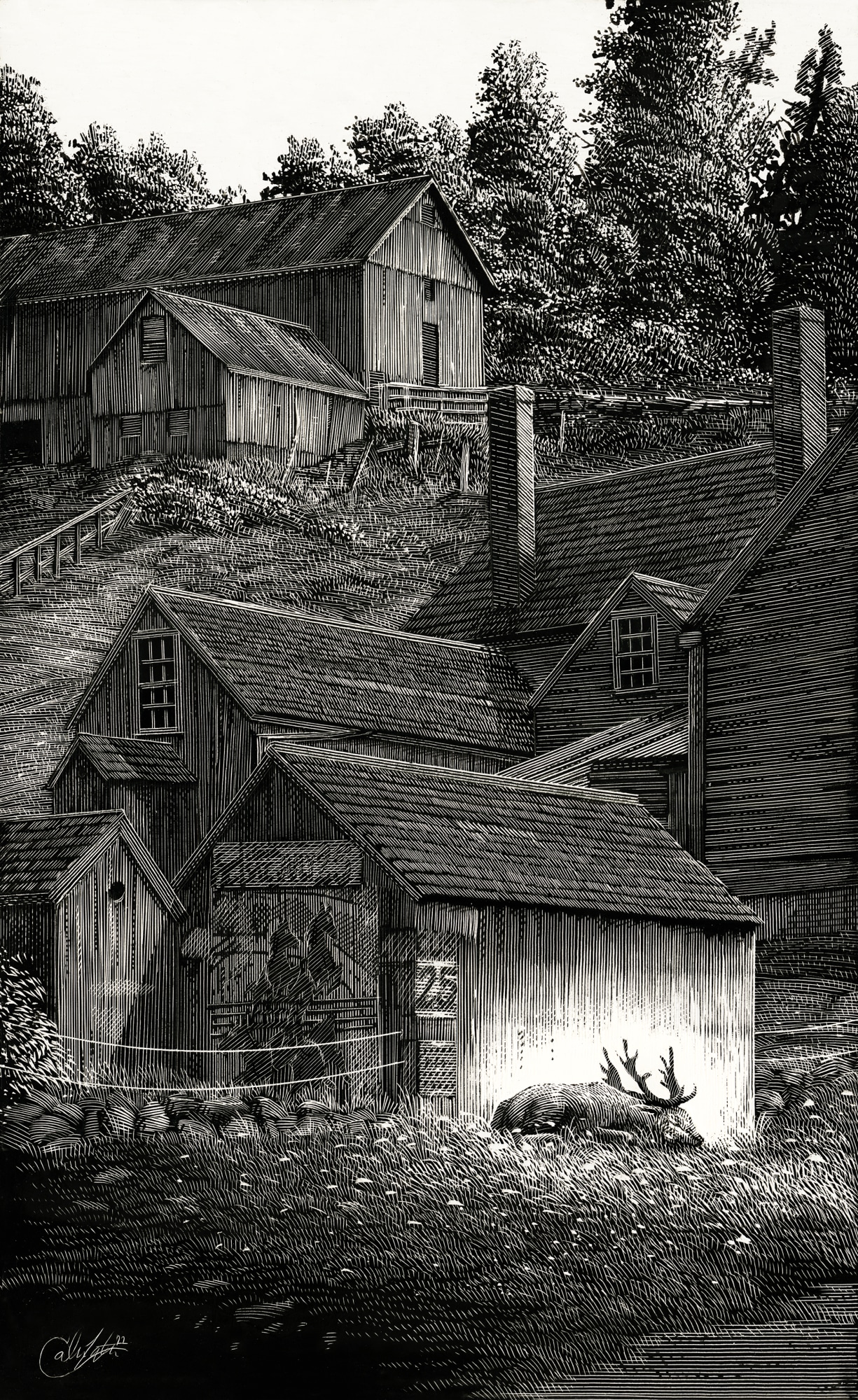 - Archival ink and engraving on clayboard surface with 1/8″ hardboard backing