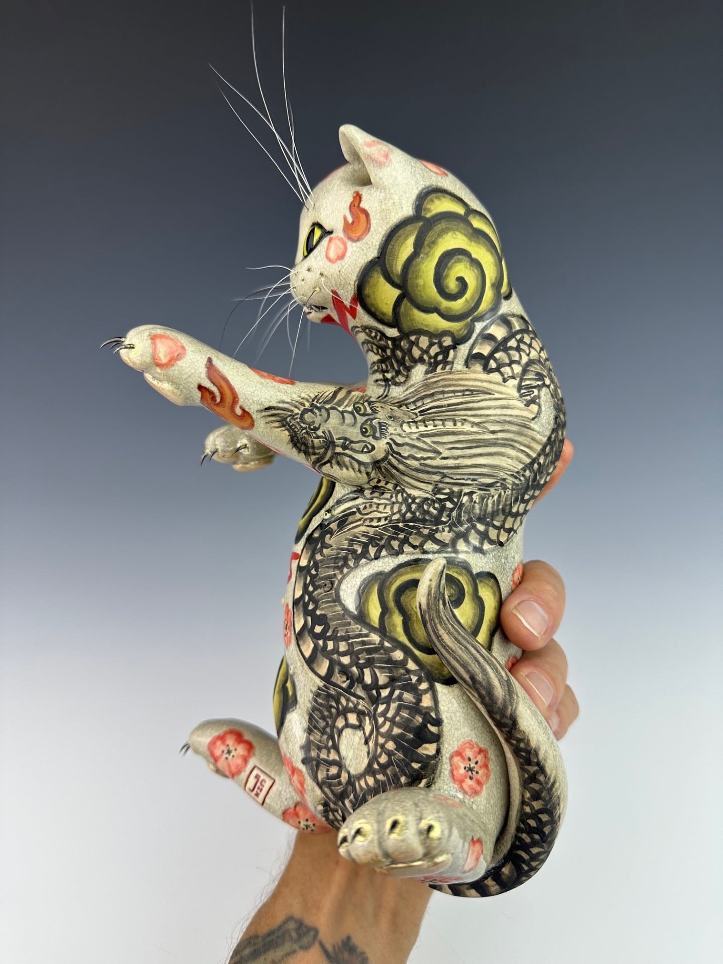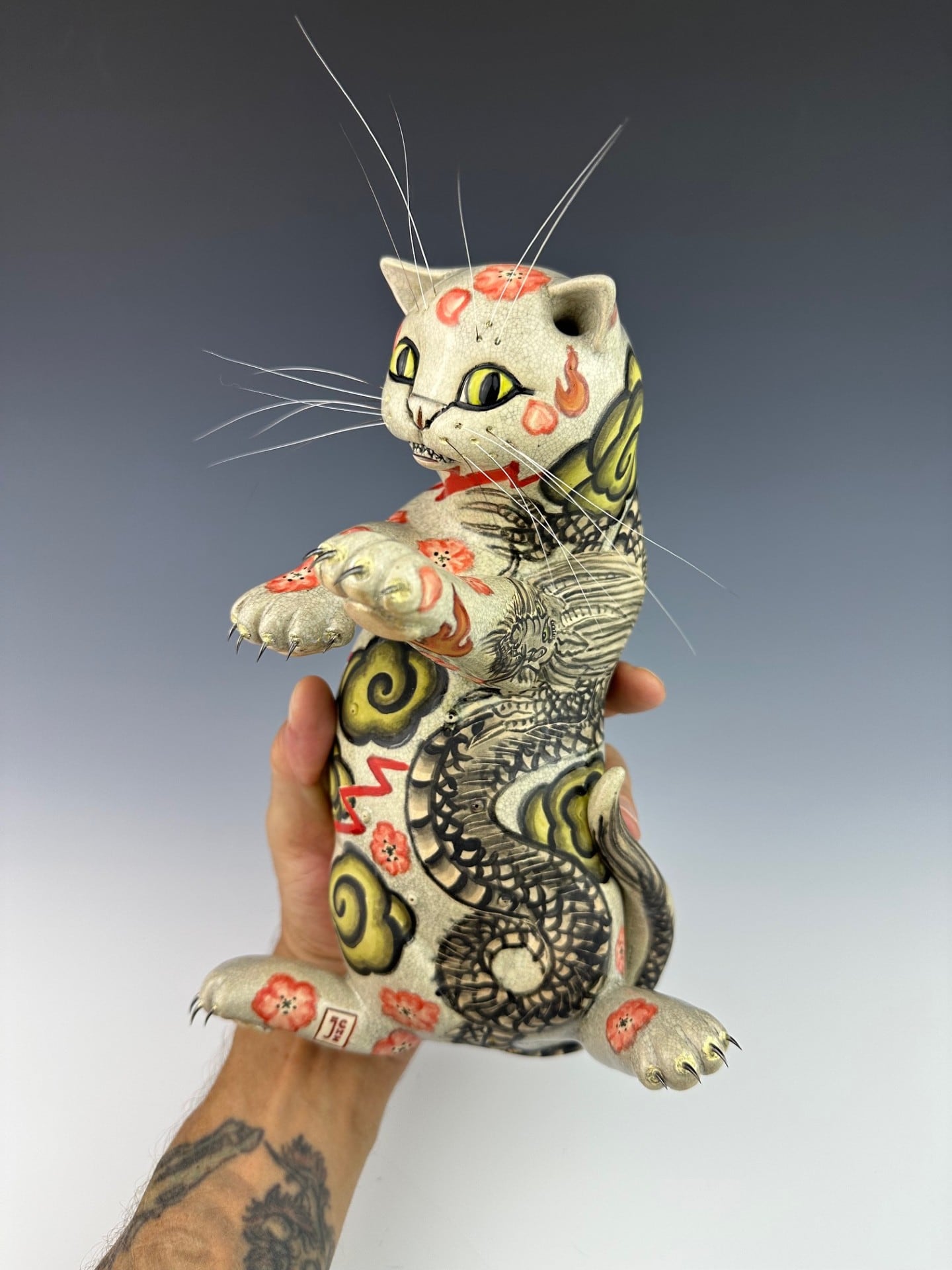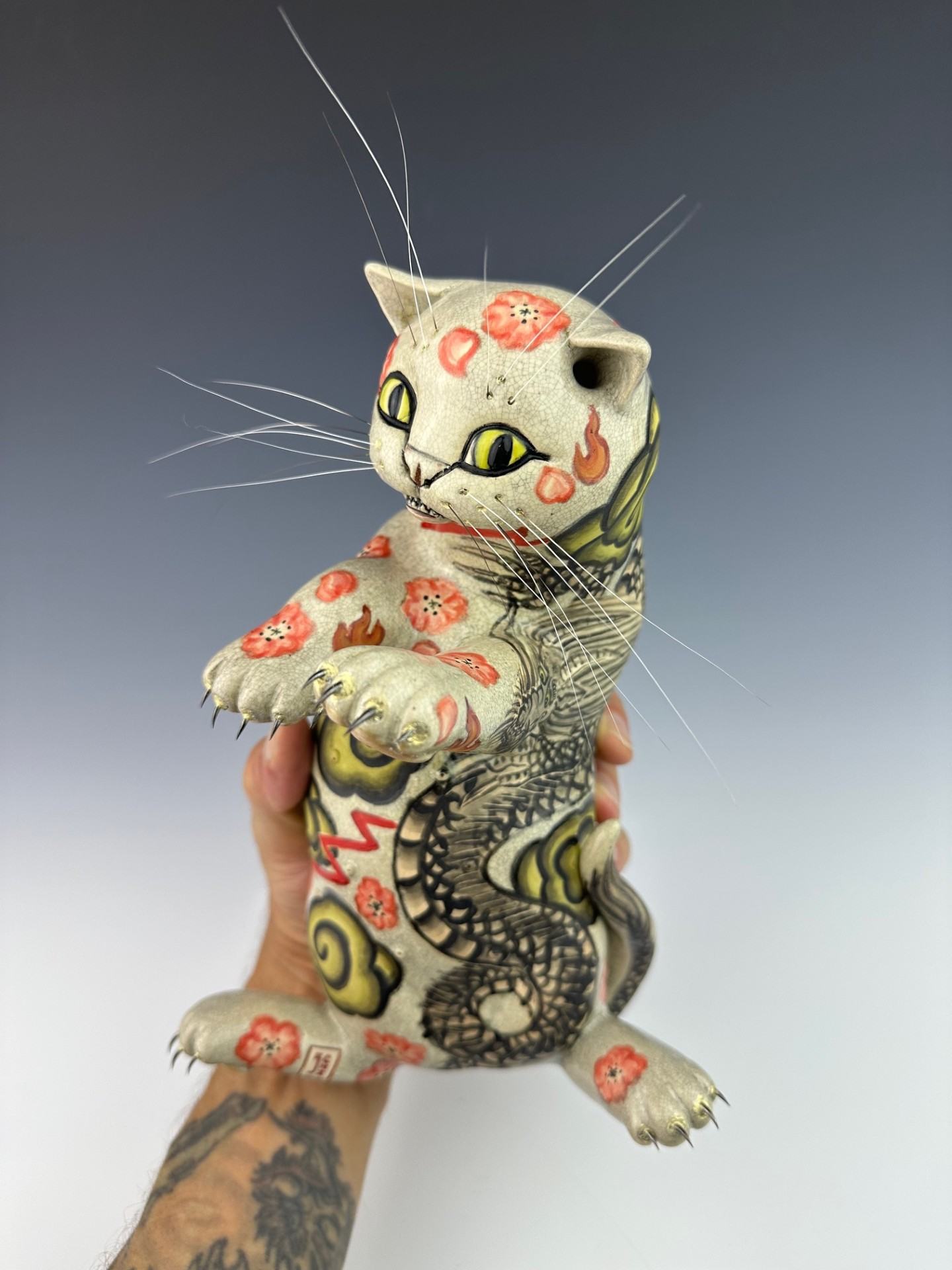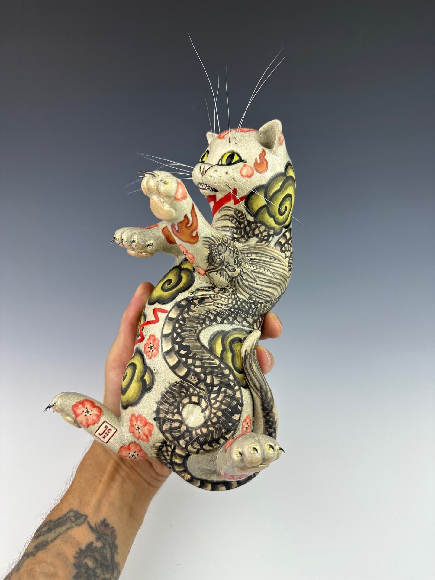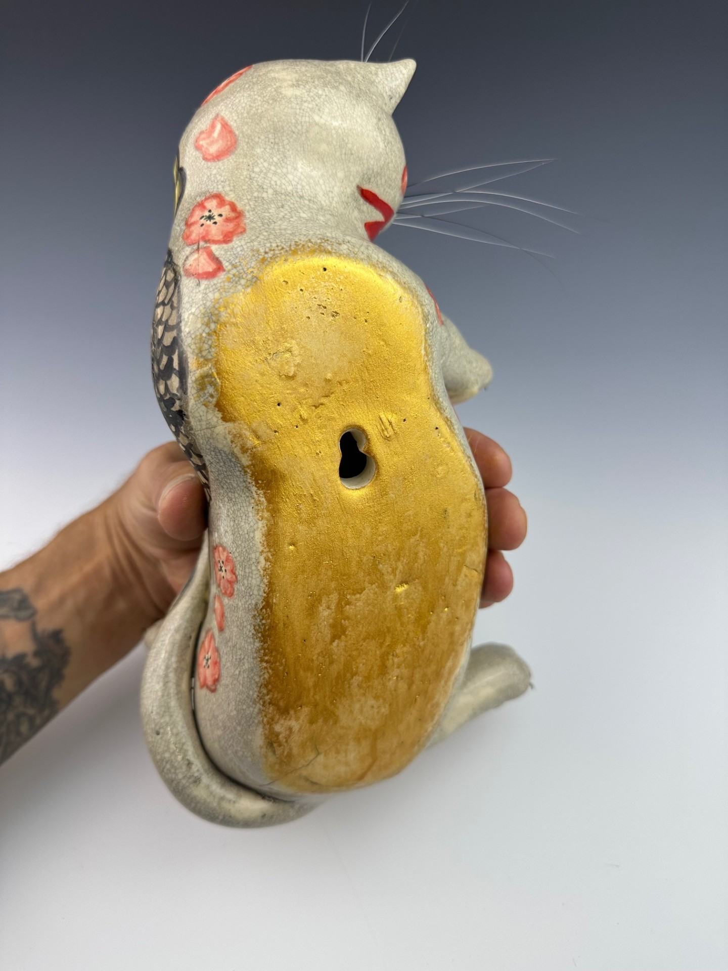- stoneware, underglazes, glazes, gold pigments, steel and cat whiskers