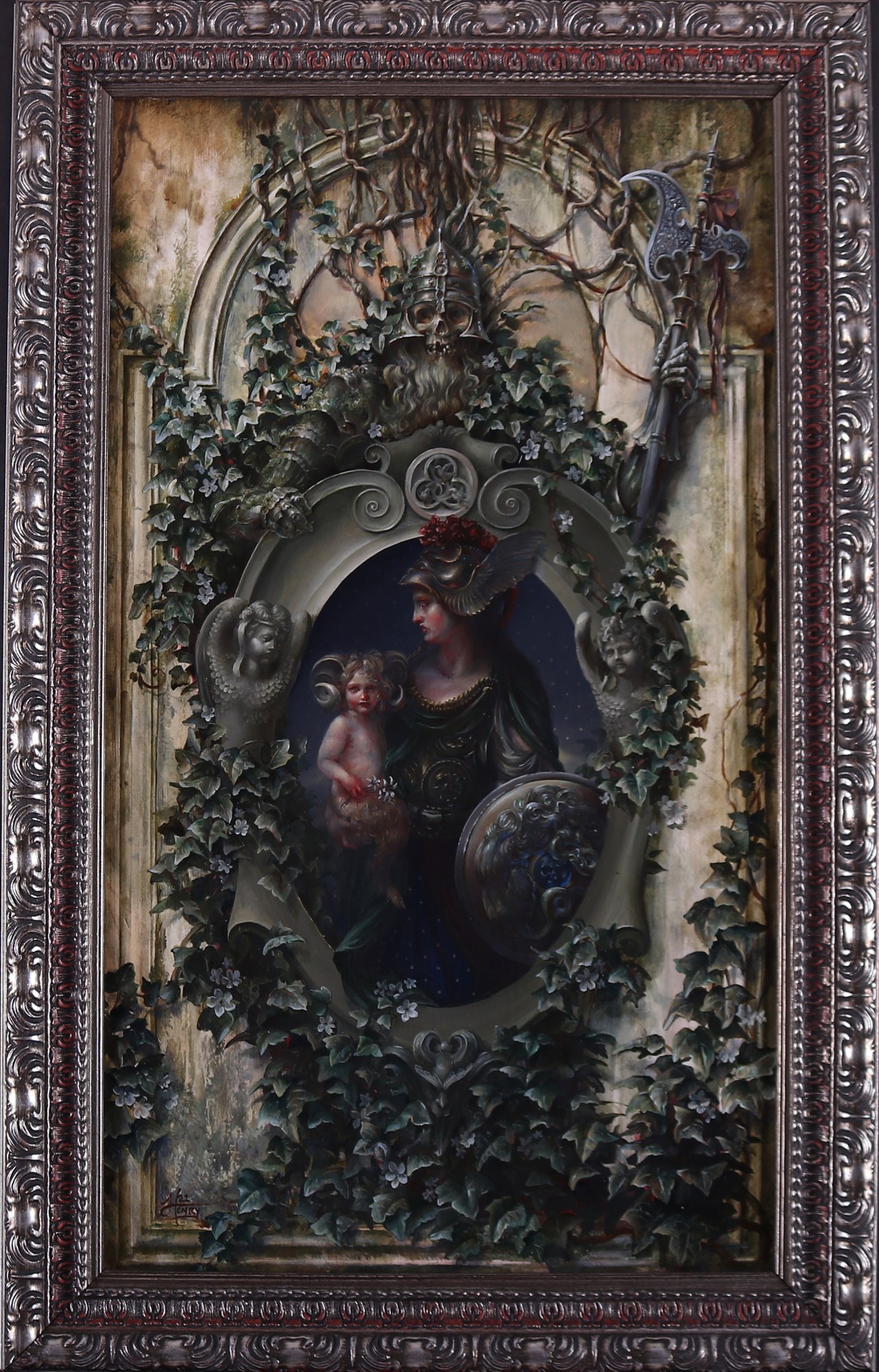 - Subject Matter: Figure, female, fantasy, trompe l'oeil, memento mori