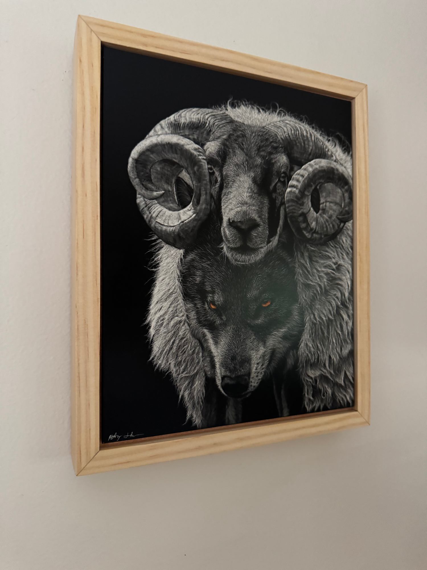Scratchboard is a subtractive medium and a form of direct engraving. I use Ampersand Scratchbords which have a smooth, absorbent kaolin clay ground that is evenly coated with black India ink. I use a variety of tools ranging from an X-acto knife to various different microblading tattoo needles, fiberglass brushes, and single tattoo needles to scratch off the ink and reveal the white clay beneath. I use forms of stippling, hatching, and cross hatching to create highly detailed photorealistic work. I first create a base layer, followed by gradually adding in more and more light, then finally I go over the piece with a single tattoo needle or scalpel to add in details and fine lines and highlights. This gradual process of layering scratch marks is what gives each work such depth.