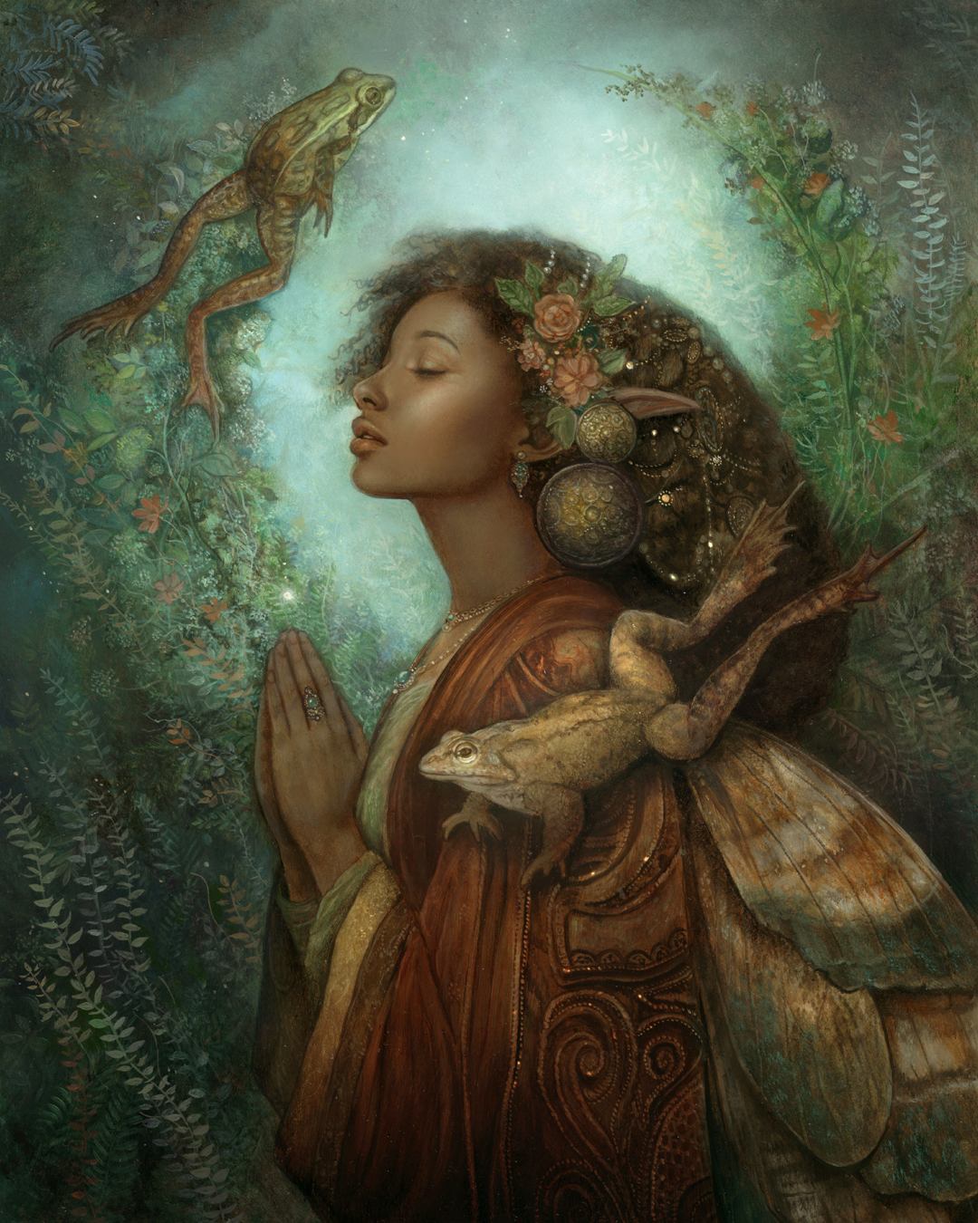 A woman surrounded by frogs