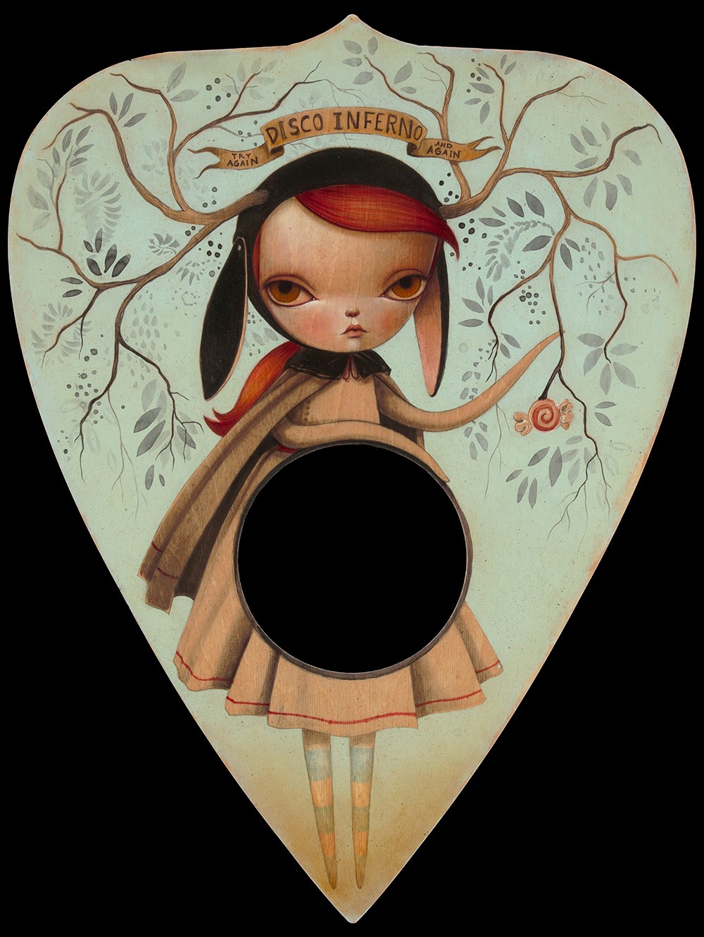 Calliope Jackelope on a planchette shaped woodcut.