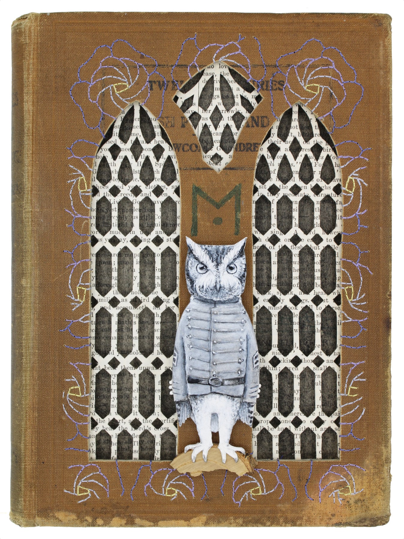 Created from: Twelve Centuries of English Poetry and Prose, published 1910. This book belonged to a young man that attended Blackstone Military Academy in Virginia from 1923 – 1925. There are a lot of notes in this books and this young man, who has written his name as John or Jack Franklin Moore, obvious very much enjoyed the poetry inside. I chose an owl for the familiar because they are commonly used to represent wisdom as well as change, transformation, intuitive development and self-actualization. Being at the academy, John surely would transform from a boy to a man and also embrace the beauty of life through poetry. The flowers sewn on cover represent the tenderness of poetry and the cut outs mimic the grant style of old academia. He is the perfect balance of soft and tough, wise and playful, romantic and stoic.
