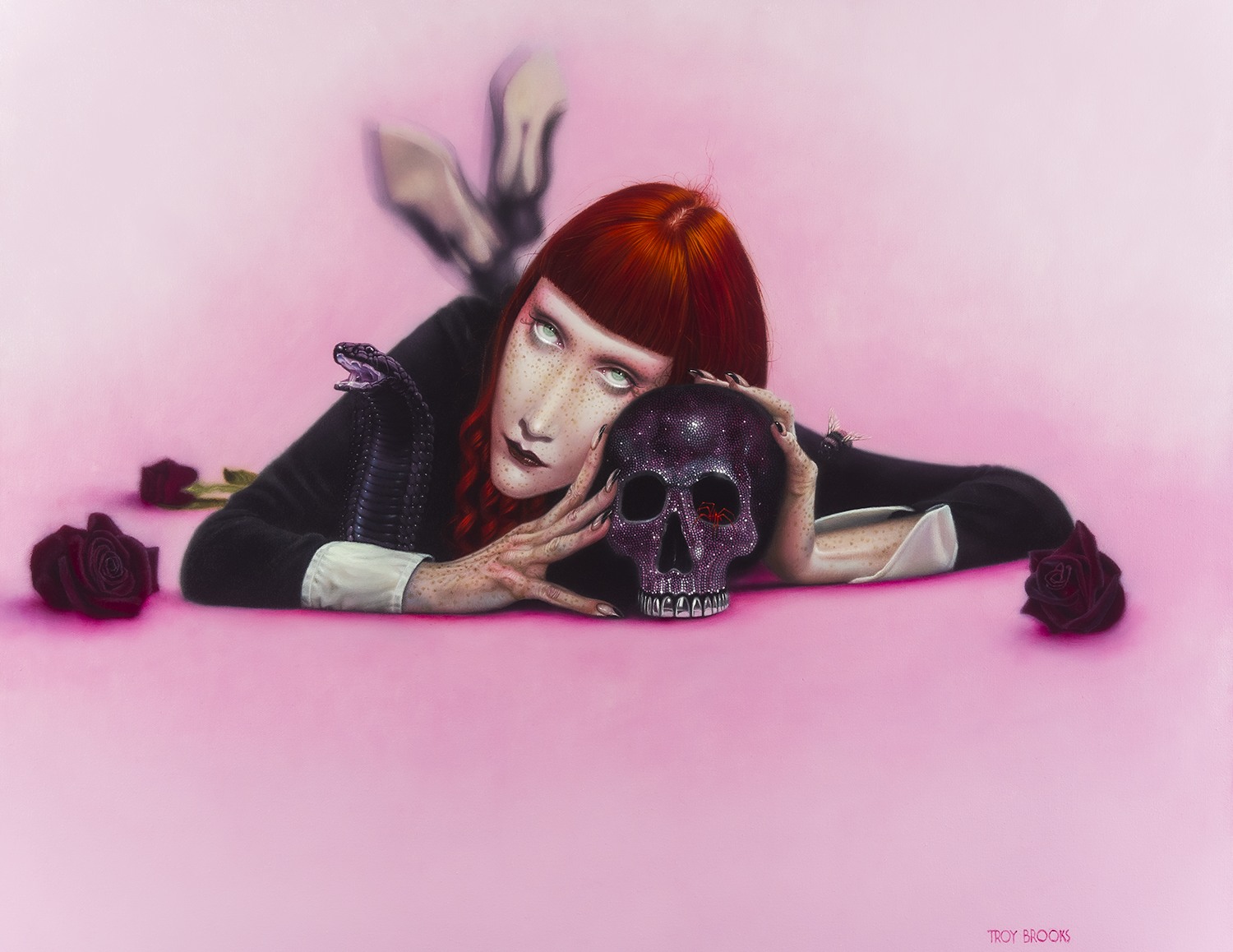 Serendipity is a happy occurrence that takes place unexpectedly. The irony of this piece, and so much of my work is that, although I’m playing with imagery that explores certain fascinations with dark themes, the result is often a joyous act of reflection and rumination. In this image, my fear of death is the catalyst for a burst of imagination. Death is expressed here with a youthful face mirroring a Stygian skull. When the painting is observed more closely however, the skull becomes a landscape for hundreds of glittering gem stones. This illustrates a process of using one’s creative powers to transform disturbing thoughts into creative meditations. The act of doing this is, in and of itself, serendipitous. Nyctophilia refers to a psychological disorder in which an individual finds intense relief in the darkness. The relief that I find, as an artist, is in using darkness as a creative stimulus rather than a deterrent. A power of agency is indicated by the red spider crawling out from one of the eye sockets. I once read in a book of dream interpretations that if a woman dreams of a red spider it means she will overcome every obstacle and be a powerful matriarch in her future. a