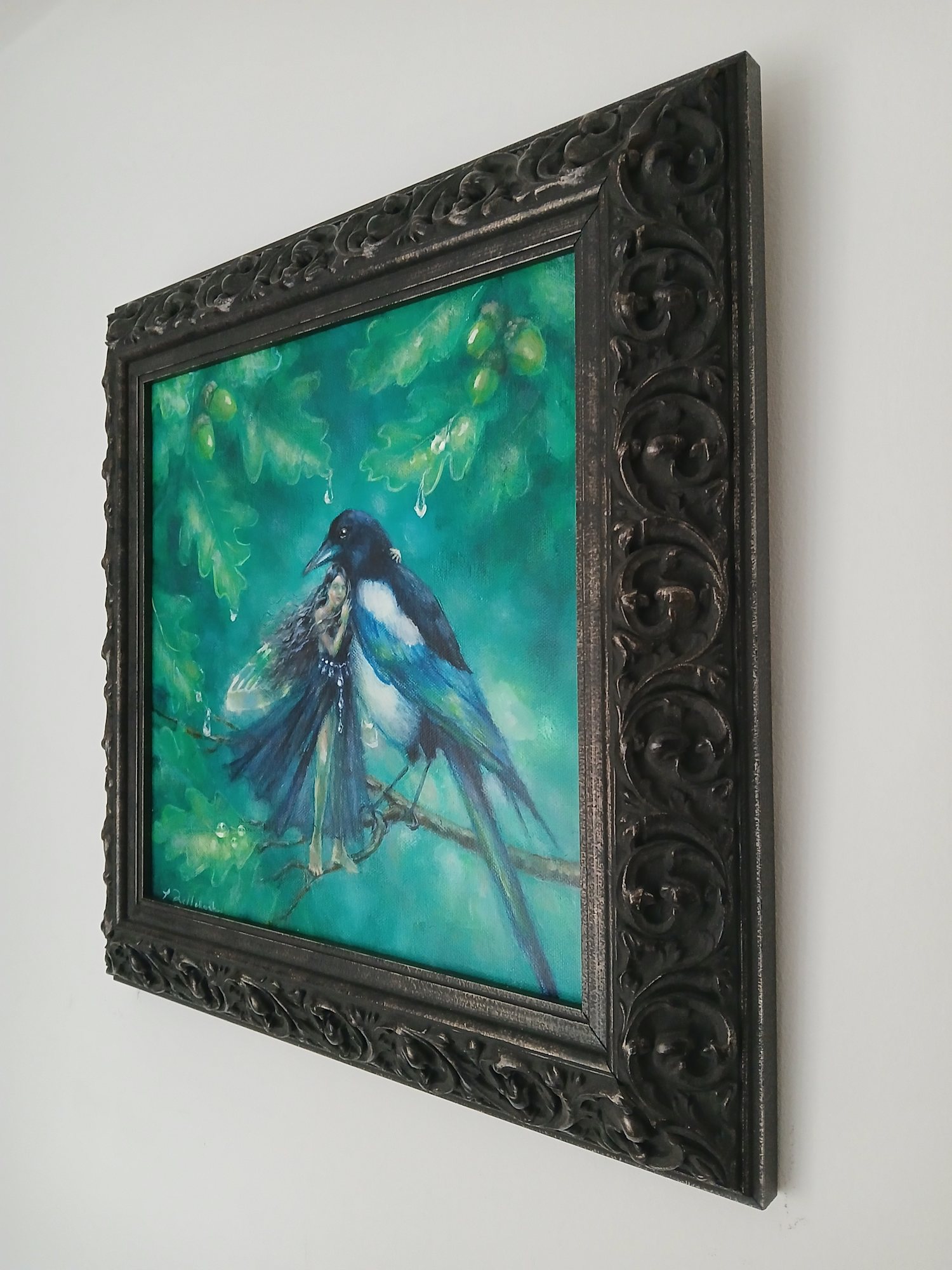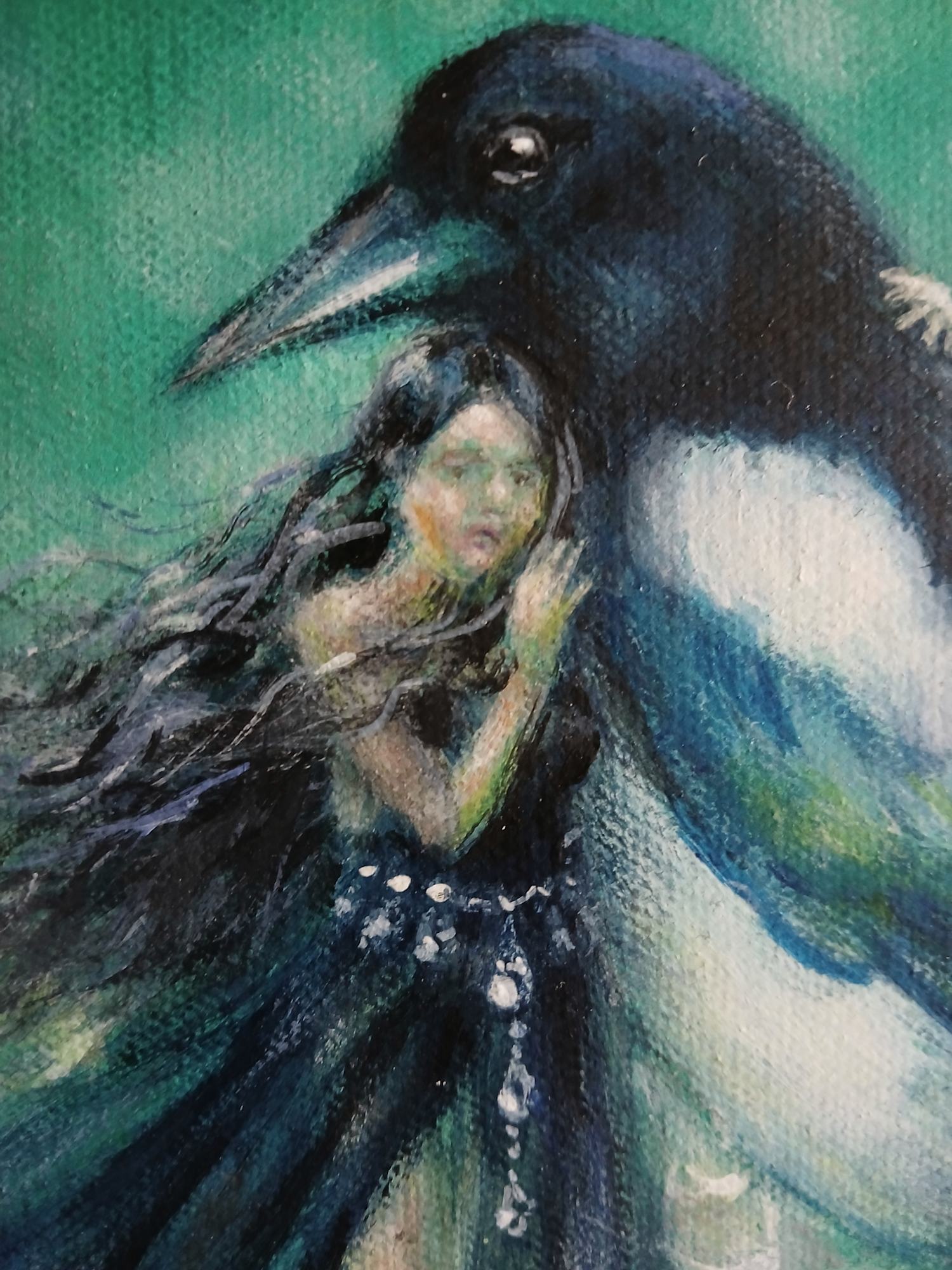 Magpies mate for life. This lone magpie has lost their mate and is comforted by an empathetic fairy