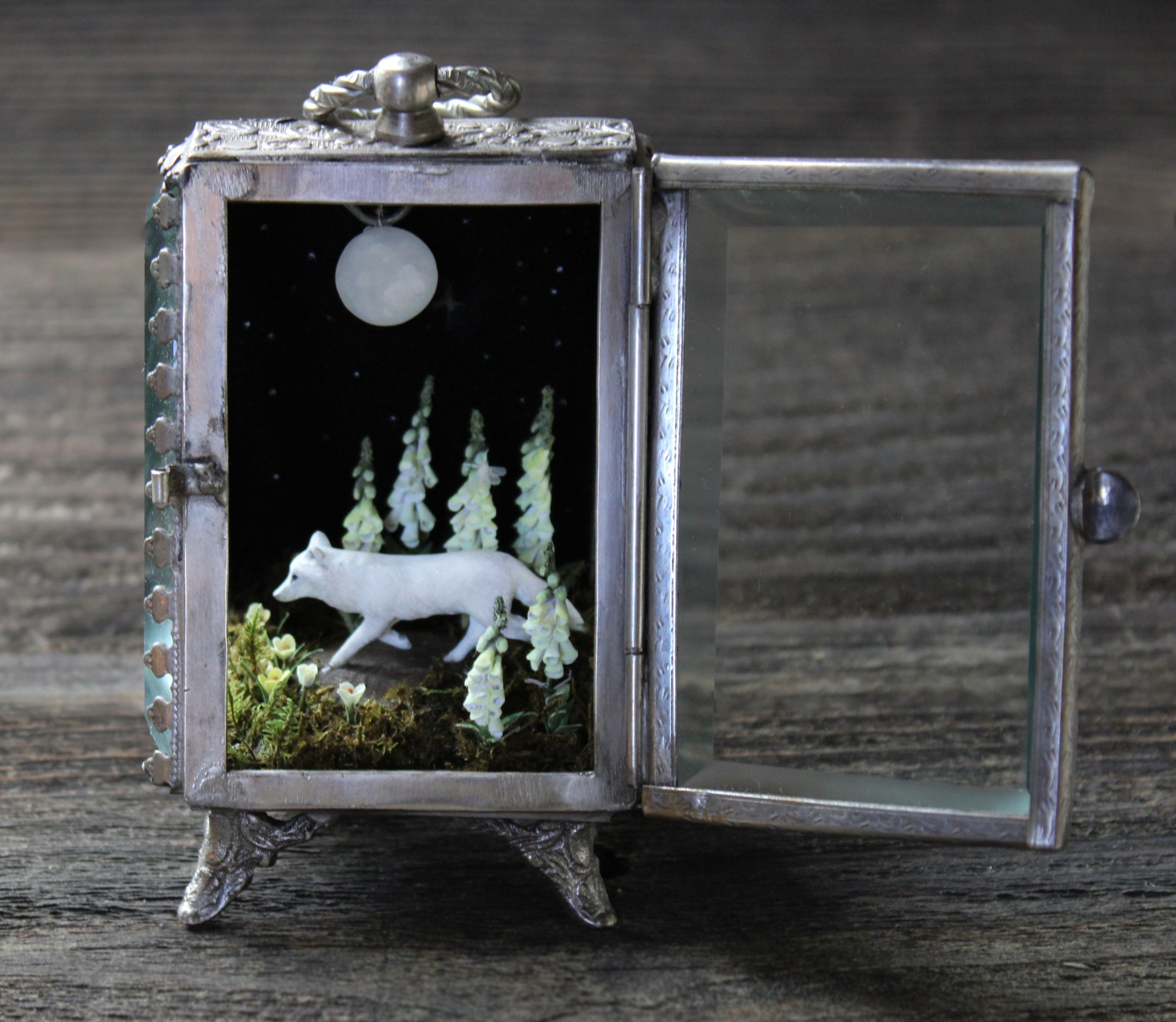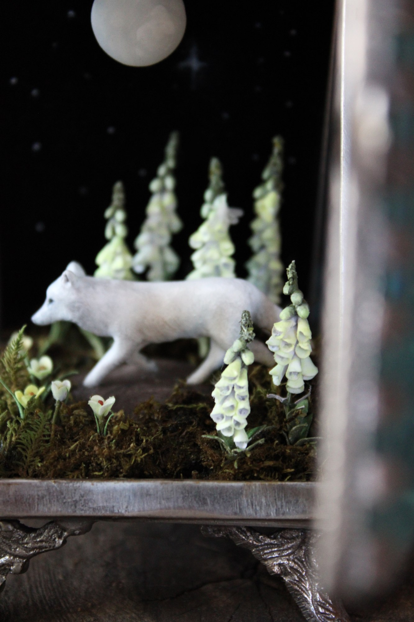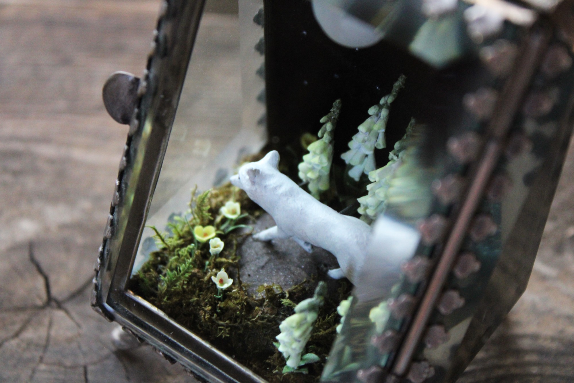 - Mixed media; glass shadow box, polymer clay and acrylic paint, paper moth, paper flowers, preserved moss