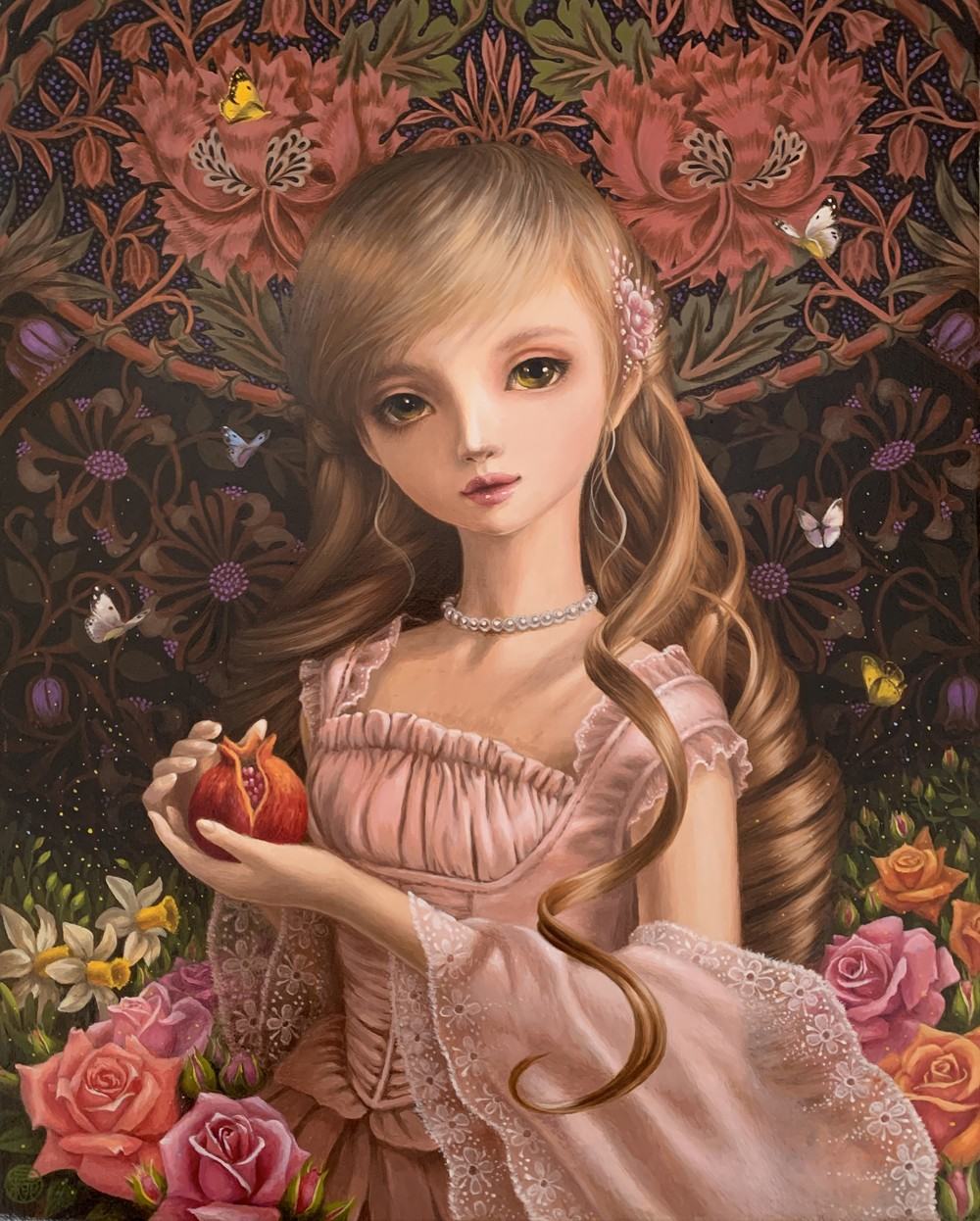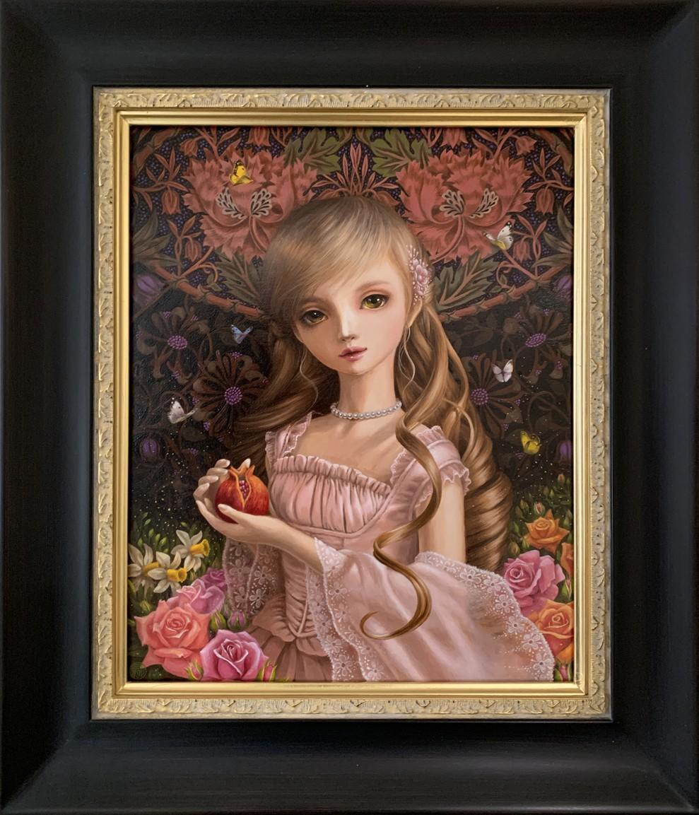 This work incorporates William Morris's "Honeysuckle" design and is a painting with two meanings: "Persephone" and "Titania, the Queen of the Fairies." It is a work that evokes the arrival of spring