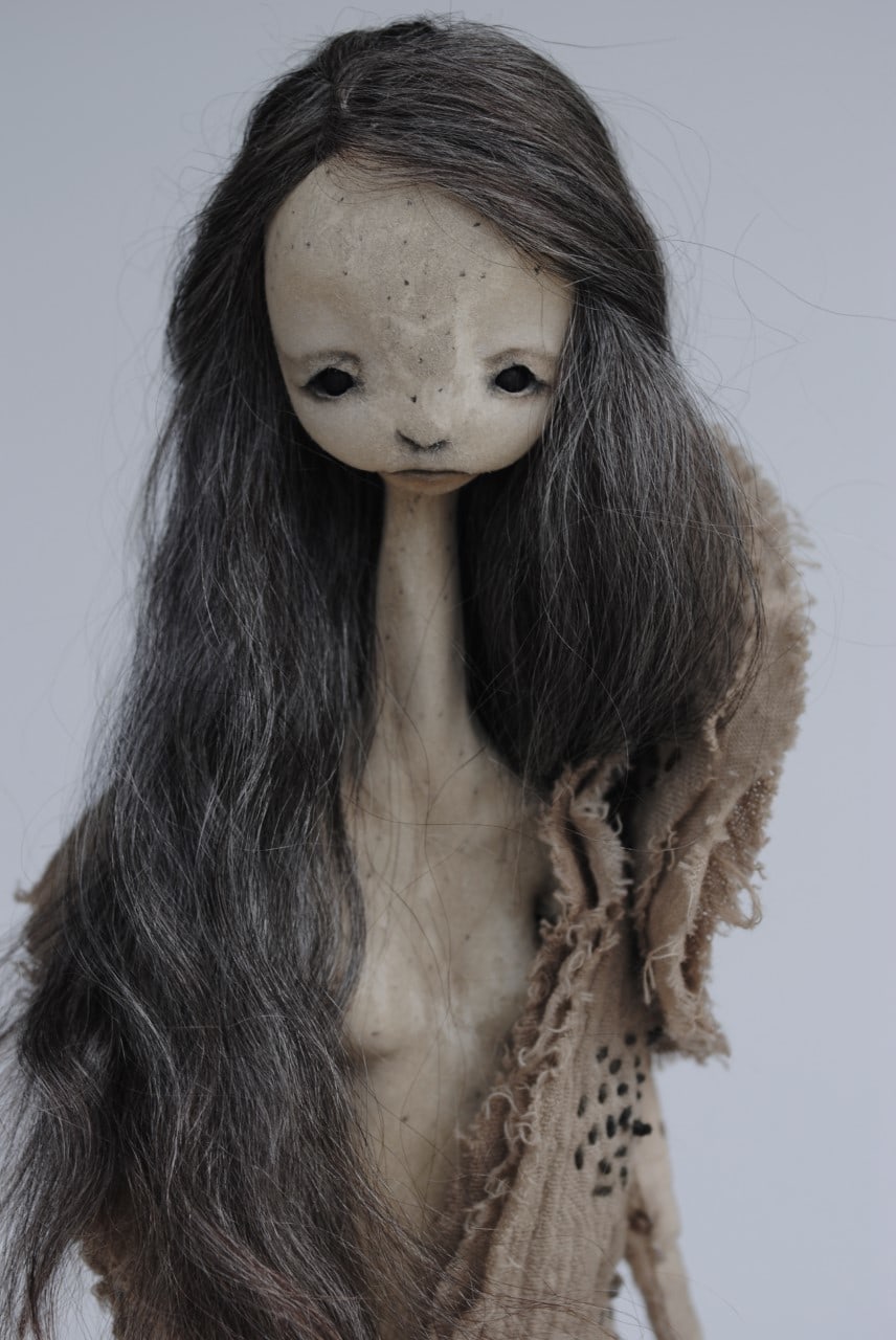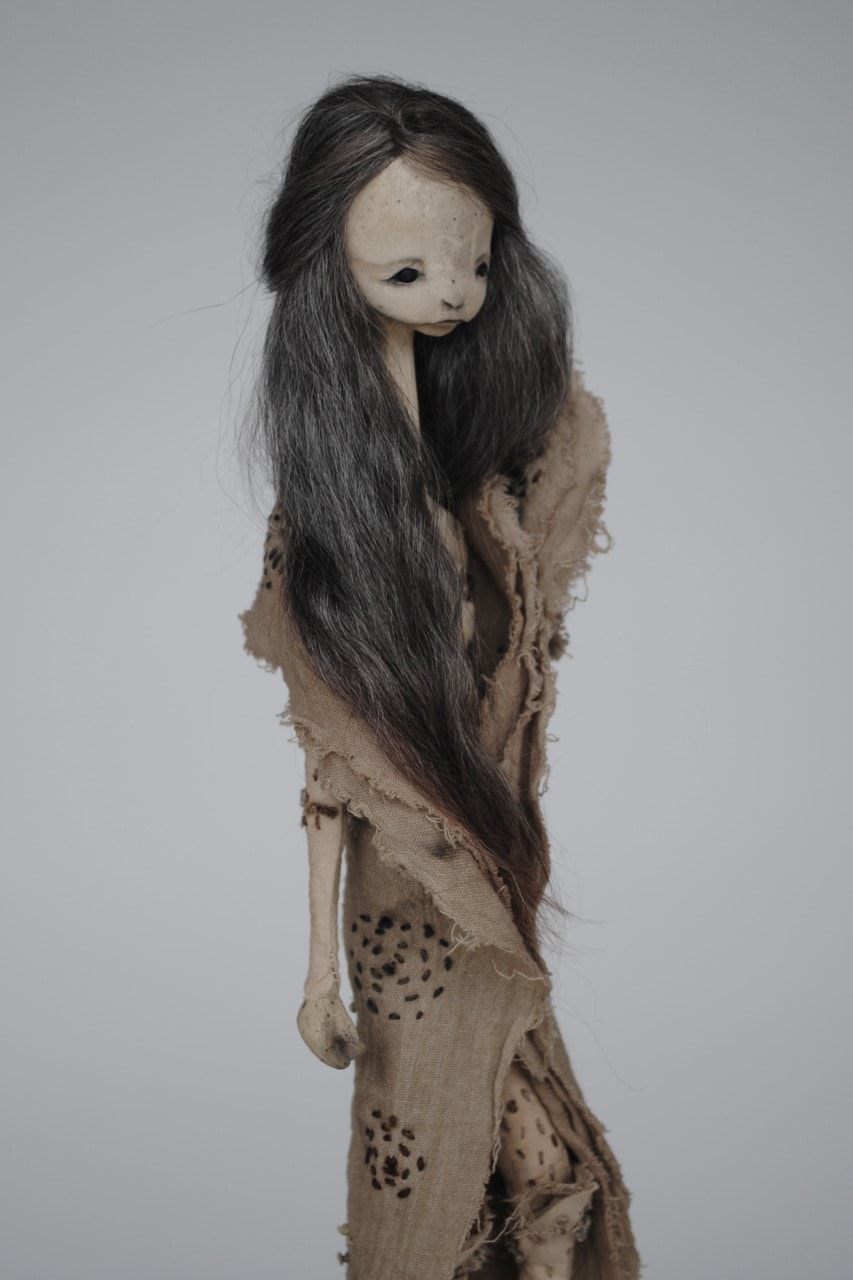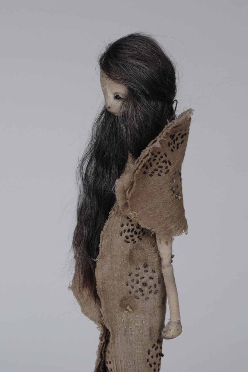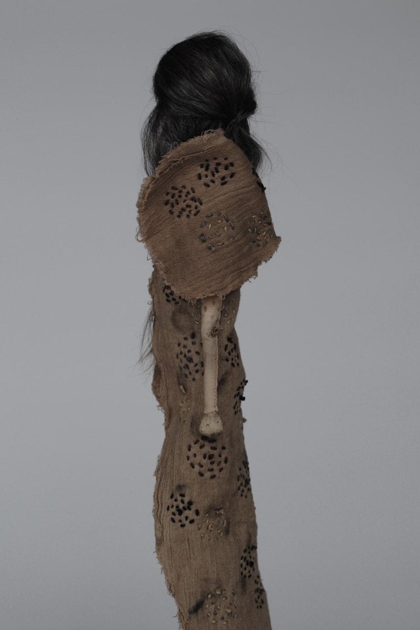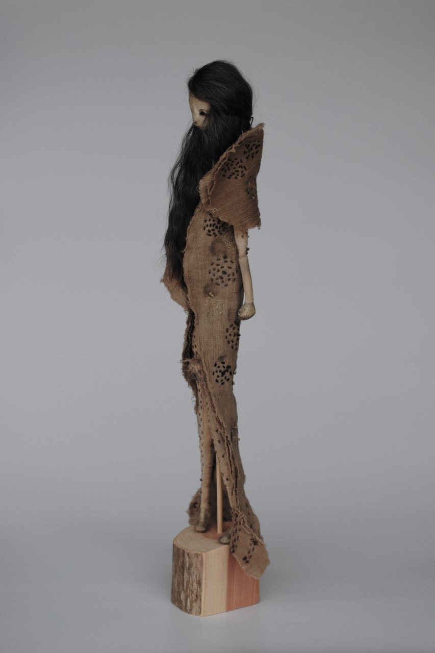 - stone clay, mohair fiber, iron dyed and embroidered cotton gauze and muslin, cedar wood