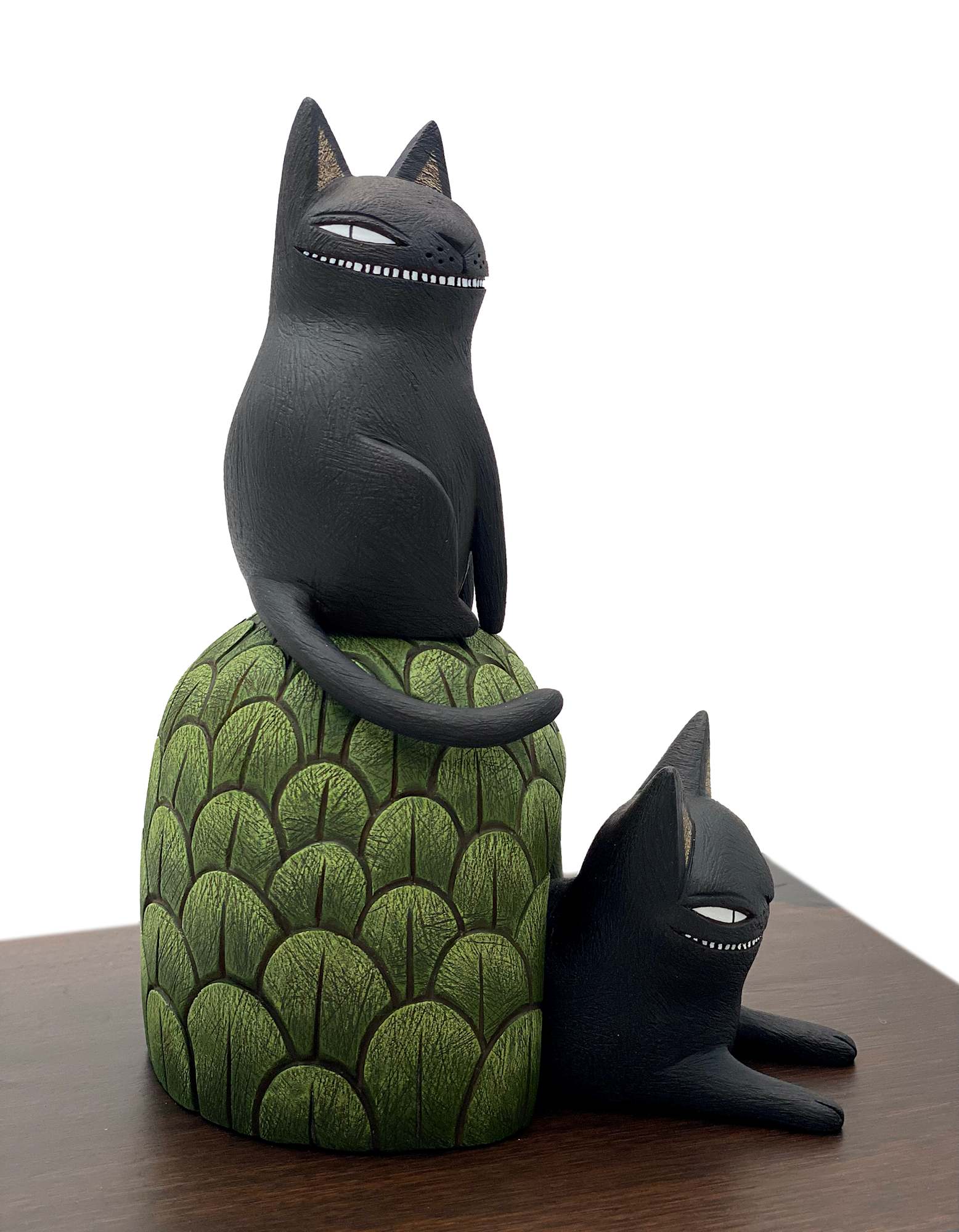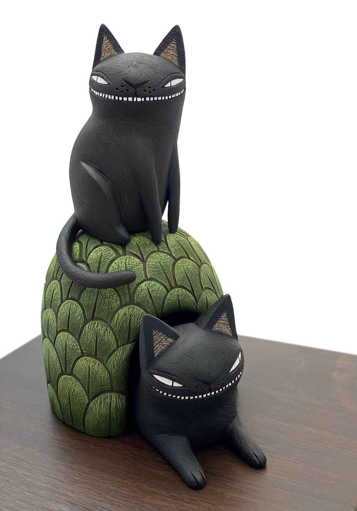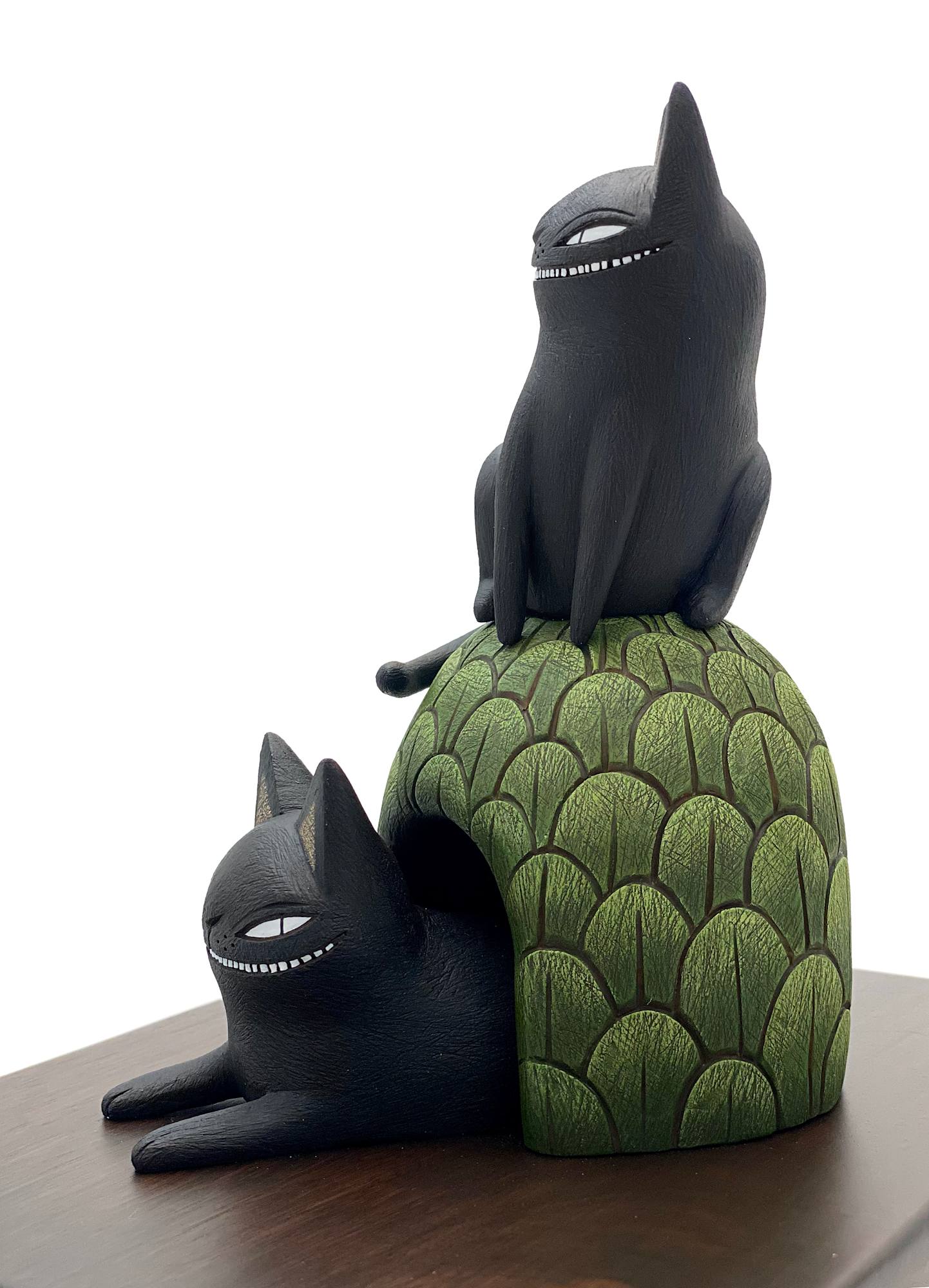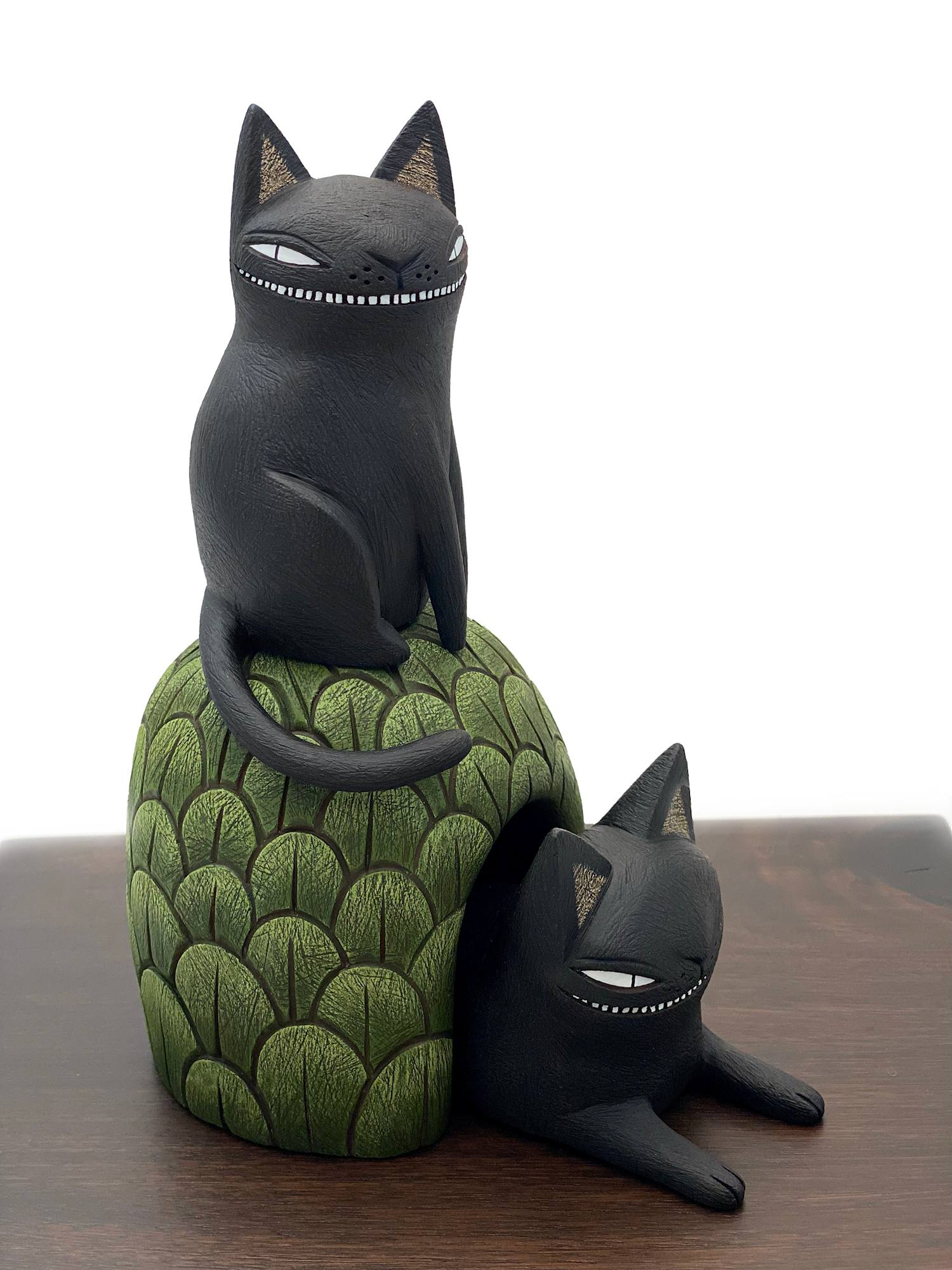 A black cat perches atop a green hill while another reclines, partially obscured underneath.