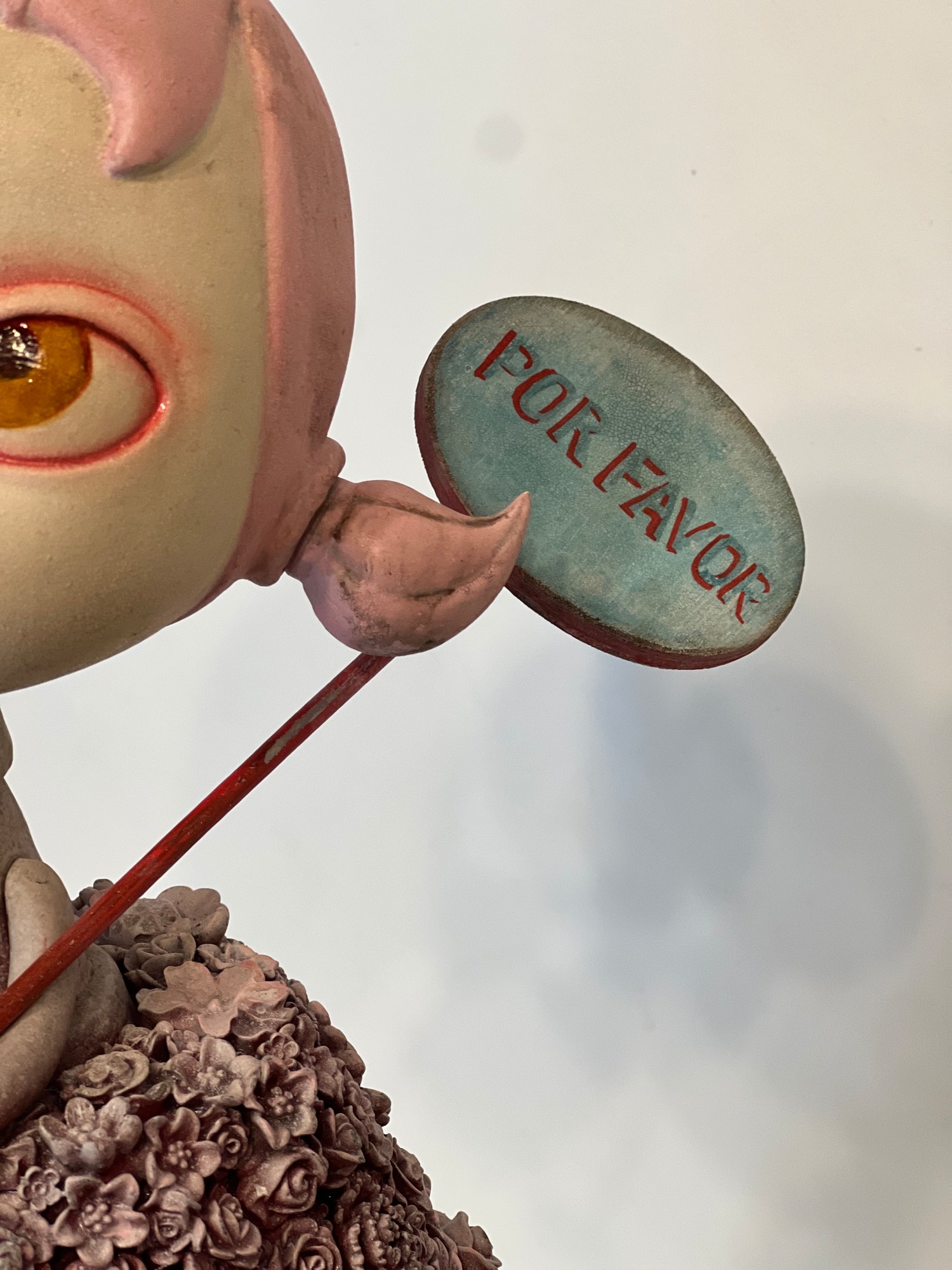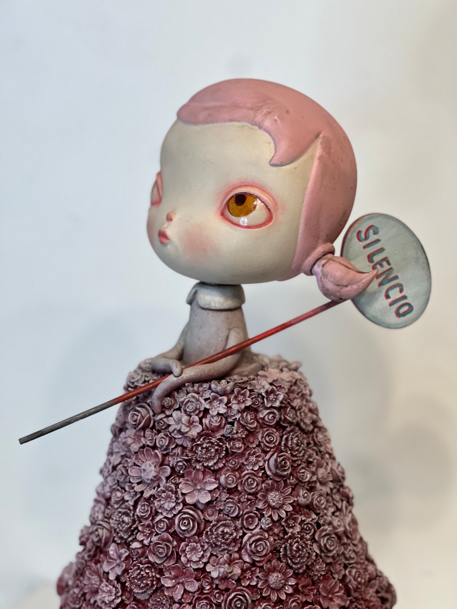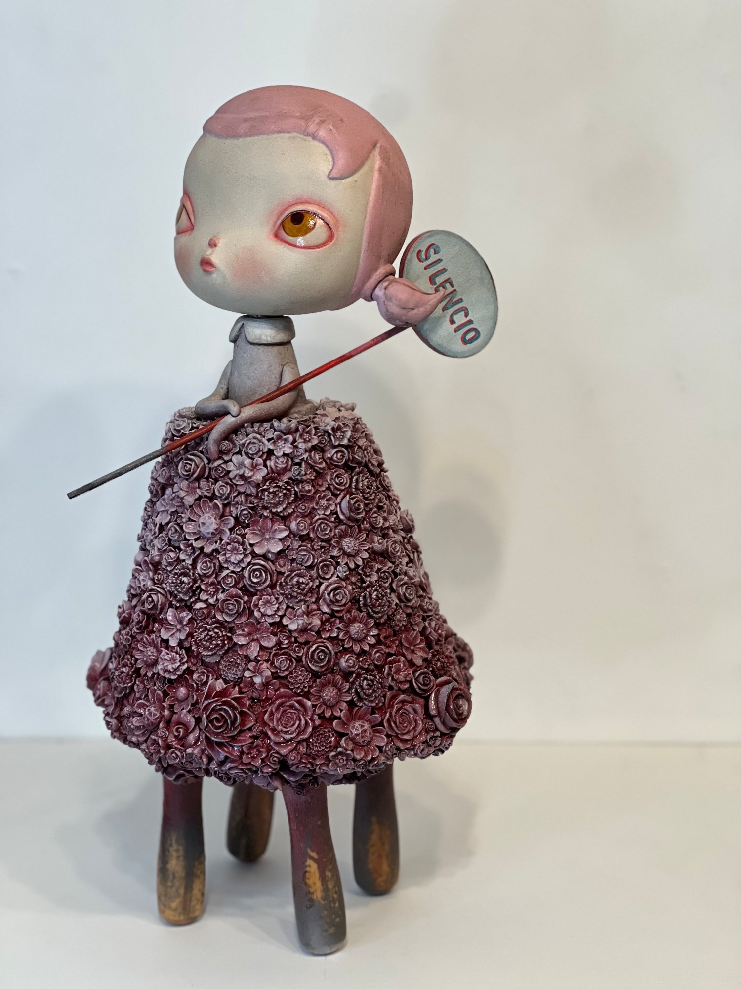 Sign reads “silencio” on one side , “por favor” on the reverse. Head articulates. Pigtails can be repositioned.