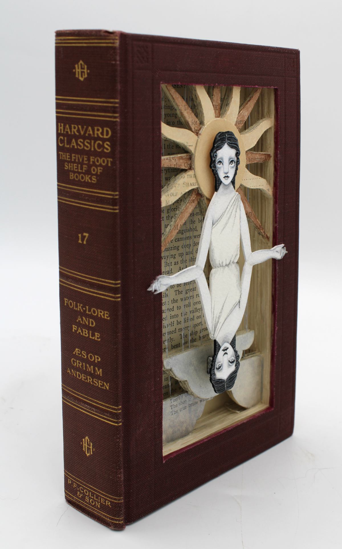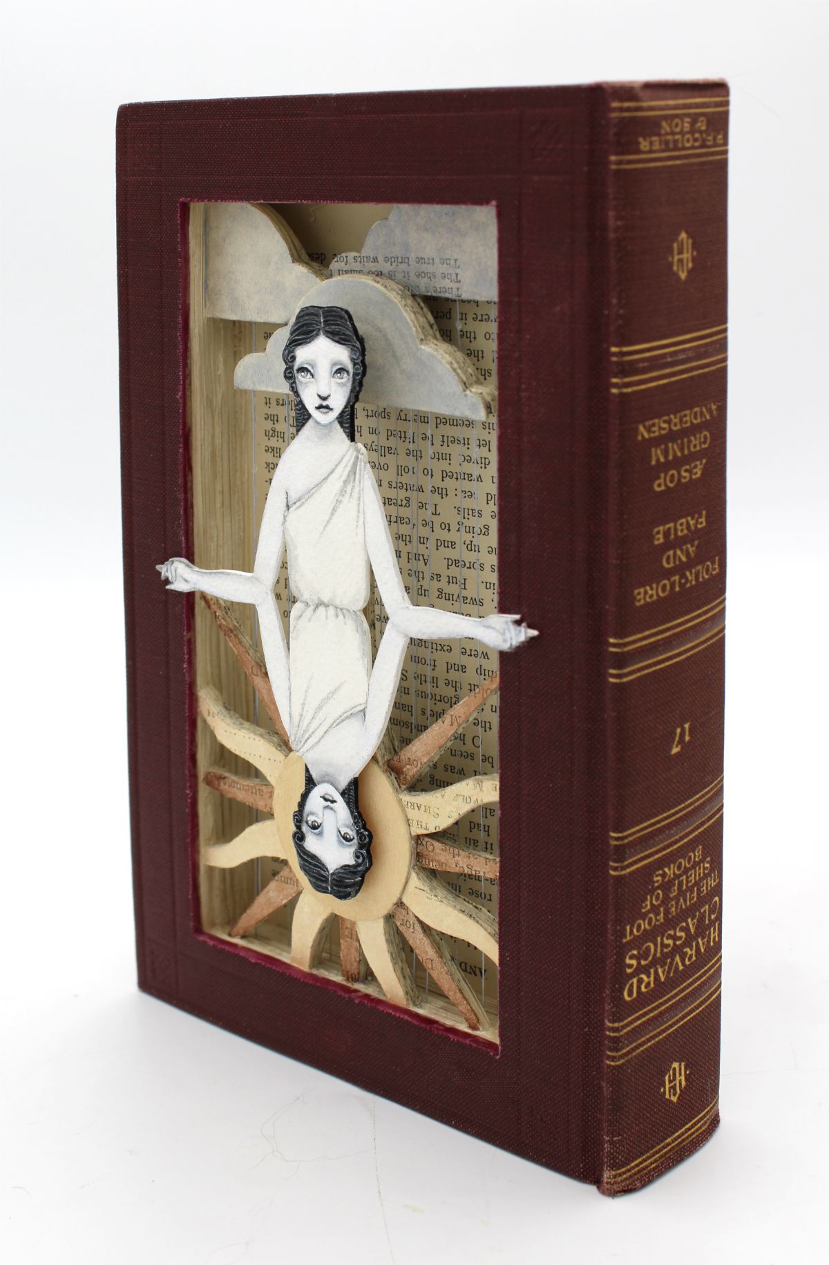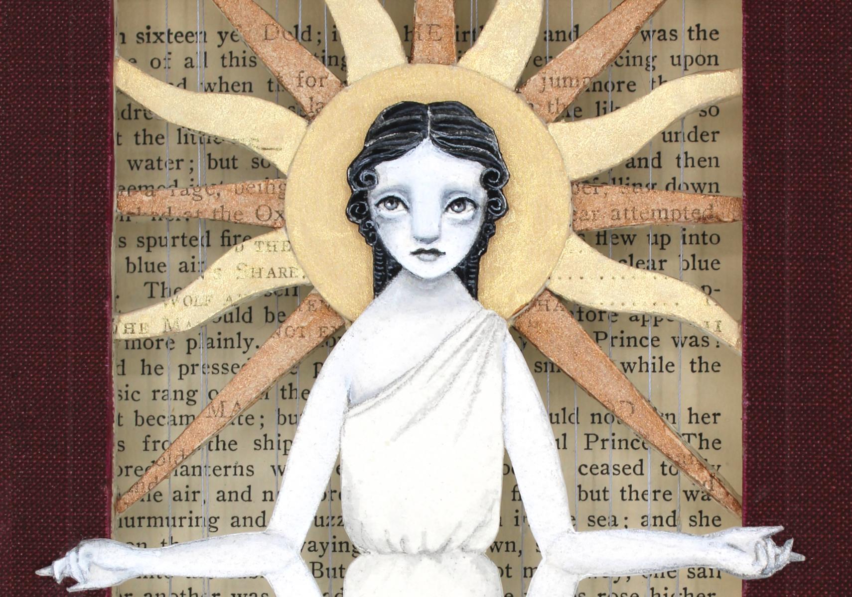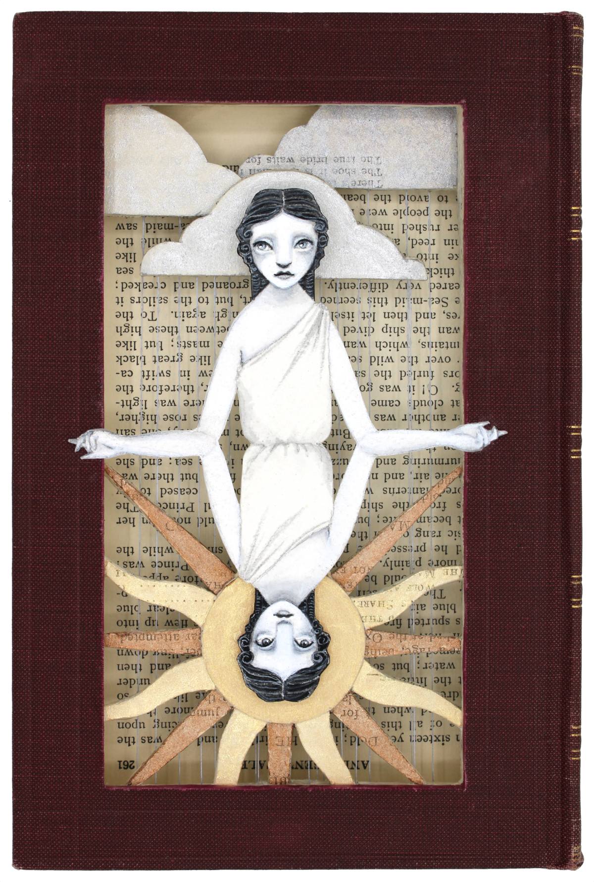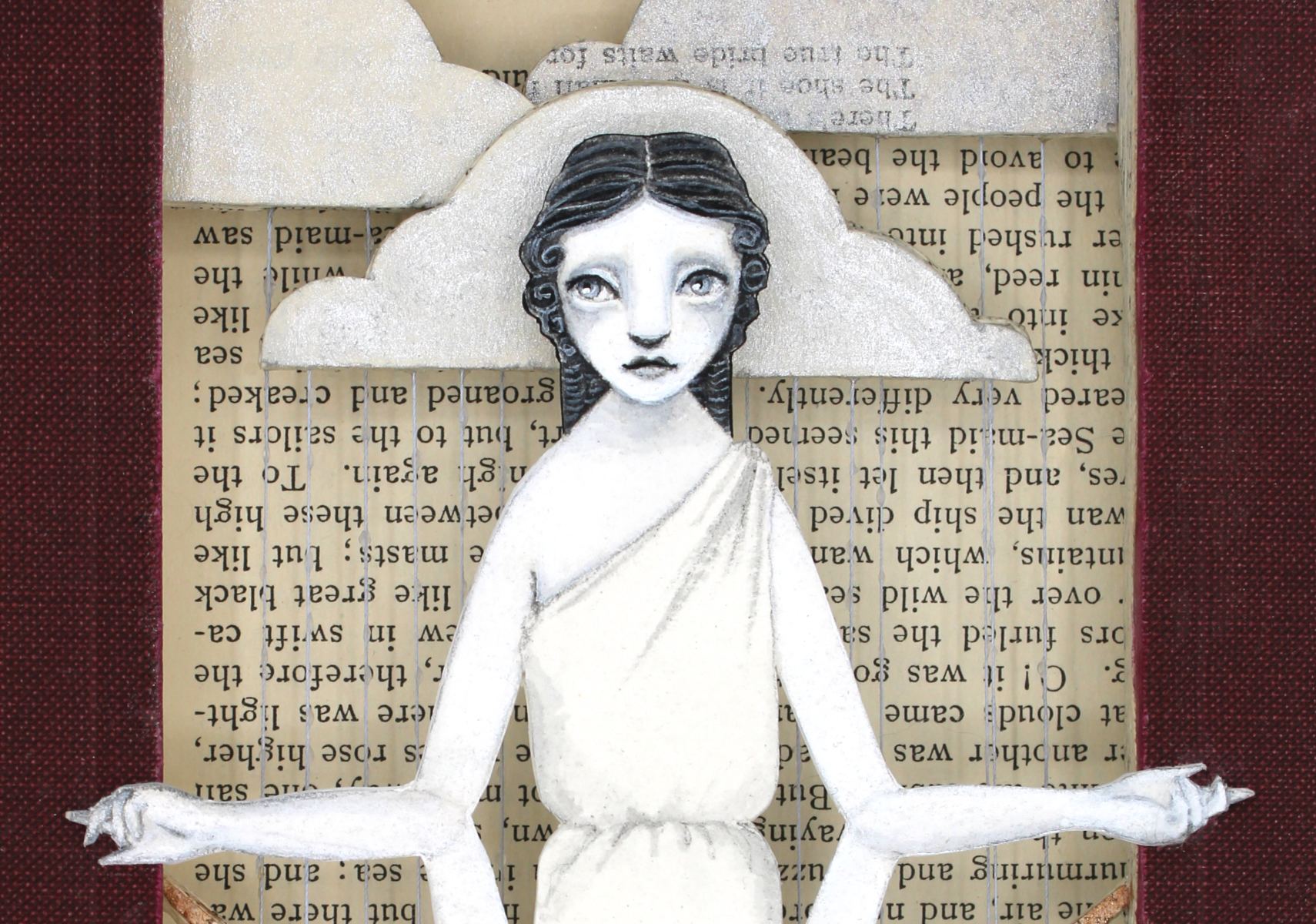 • Acryla gouache, watercolor, vintage thread, hand cut altered book