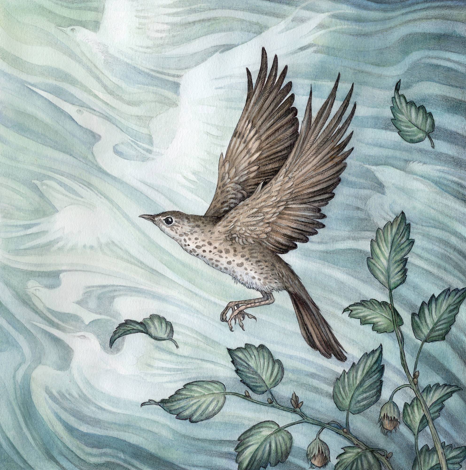 The wind collects stories and memories and, in its attempts to form living beings it can imitate that which it observes. Here it is playing with a small Thrush, flying along side and forming the shapes of other birds it has met on its travels. This piece has been used by the British folk band ‘The Wilderness Yet’ as the cover art for their latest album ‘Westlin Winds’ which I strongly recommend you check out.
