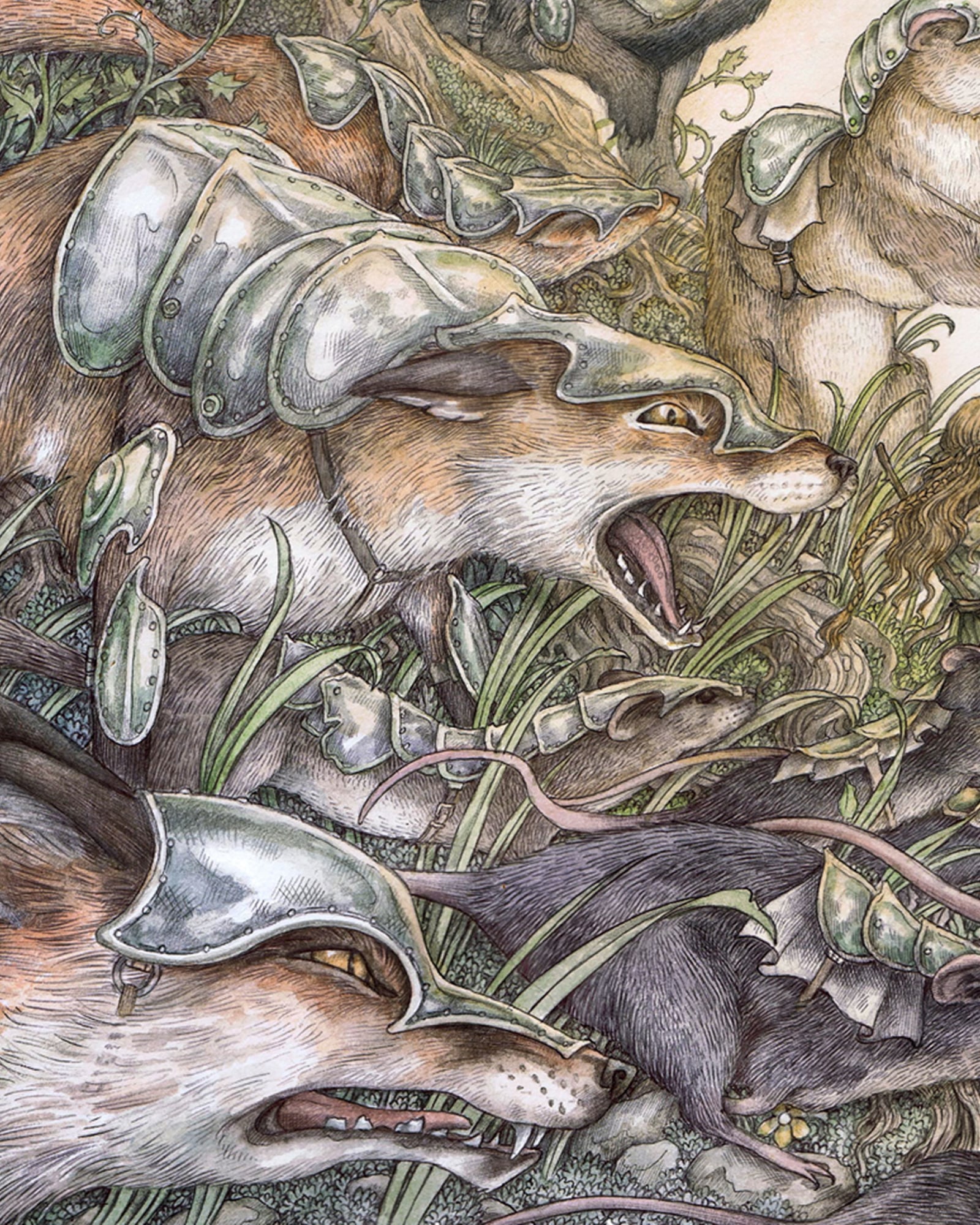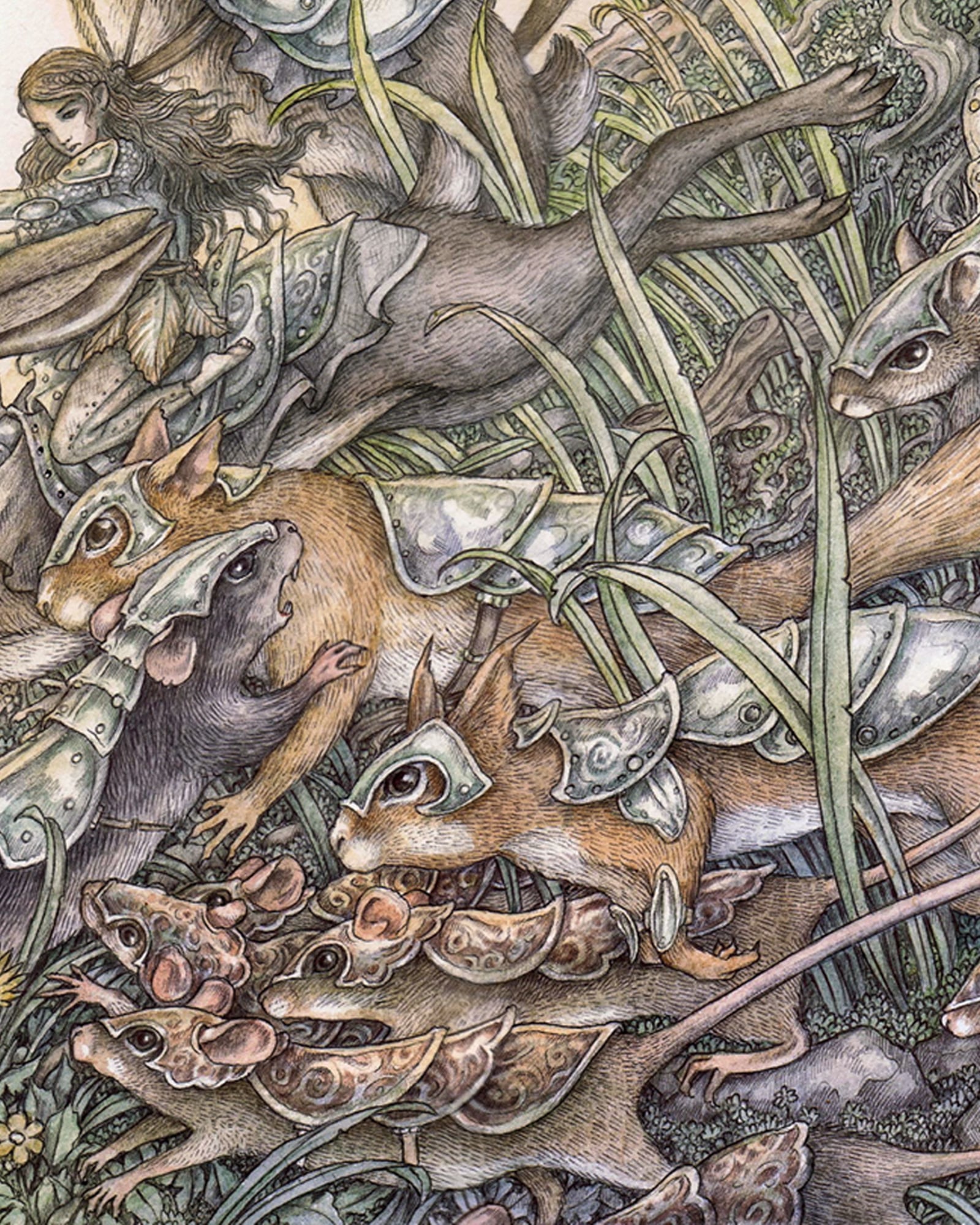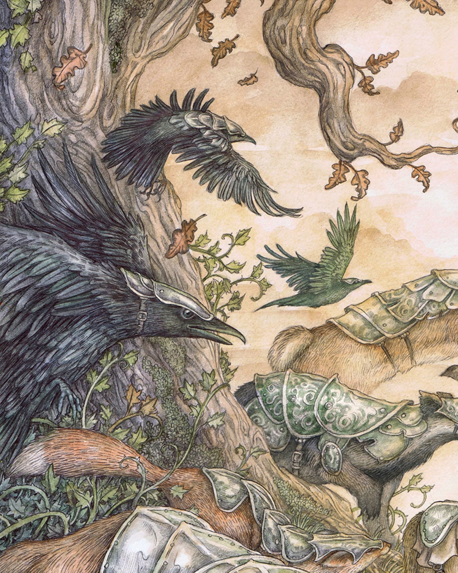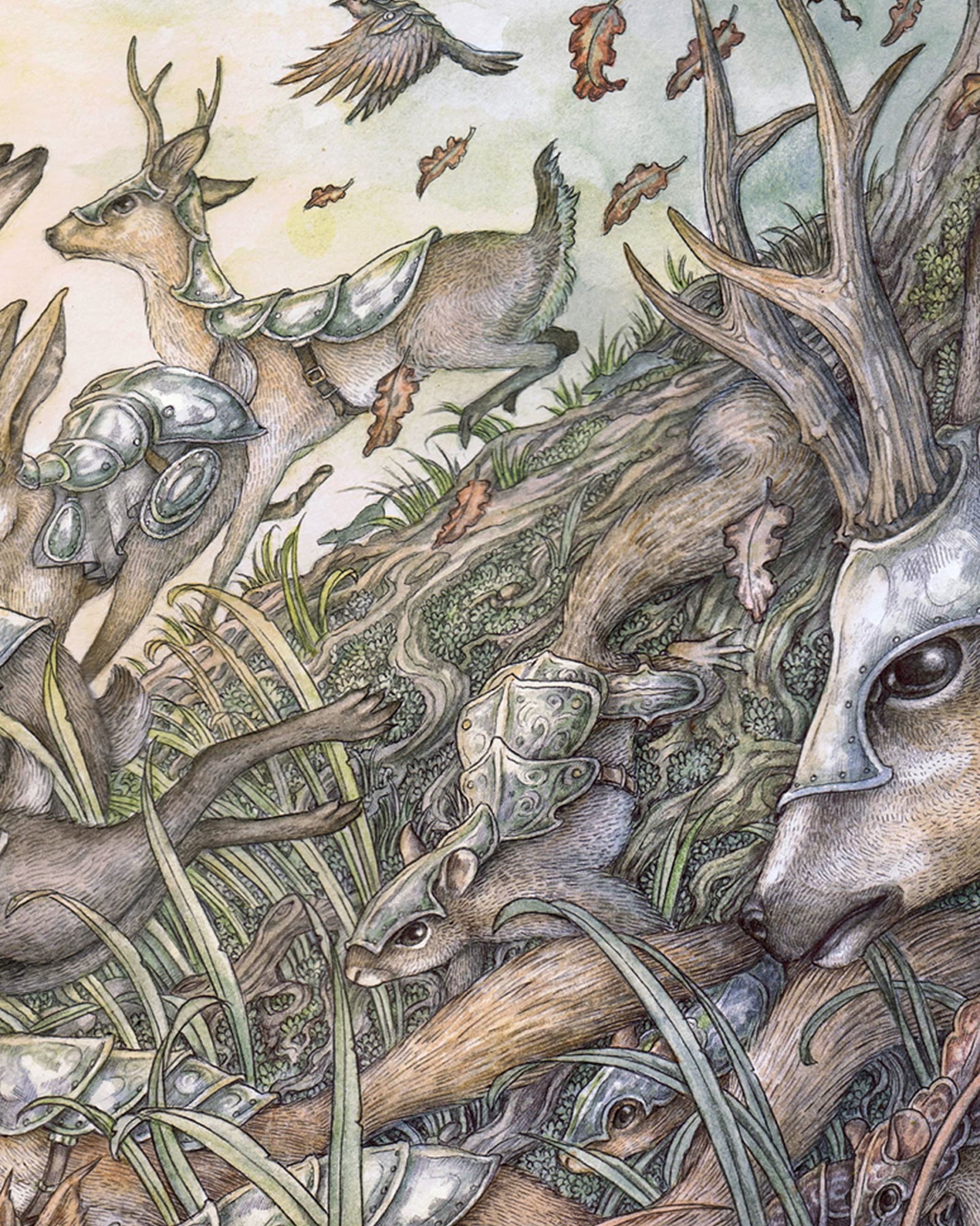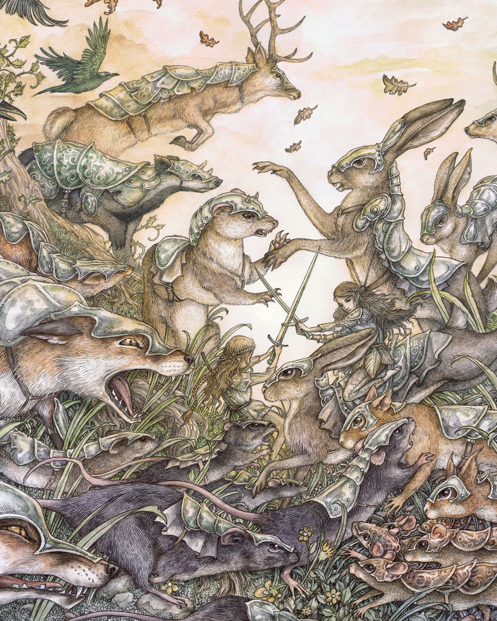 'The Battle of Twin Oaks' is the most invoved piece I've worked on for many many years. It shows the meeting of two armies across the battle field at theTwin Oaks. The two armies are fronted by their chosen warriors and the oposing sides are mainly made up of Hunters v's Prey. Though not all may be as it seems, as there is no Good or Evil within Nature. I have plans to expolre this story further in order to shed light on the events which lead to this battle.