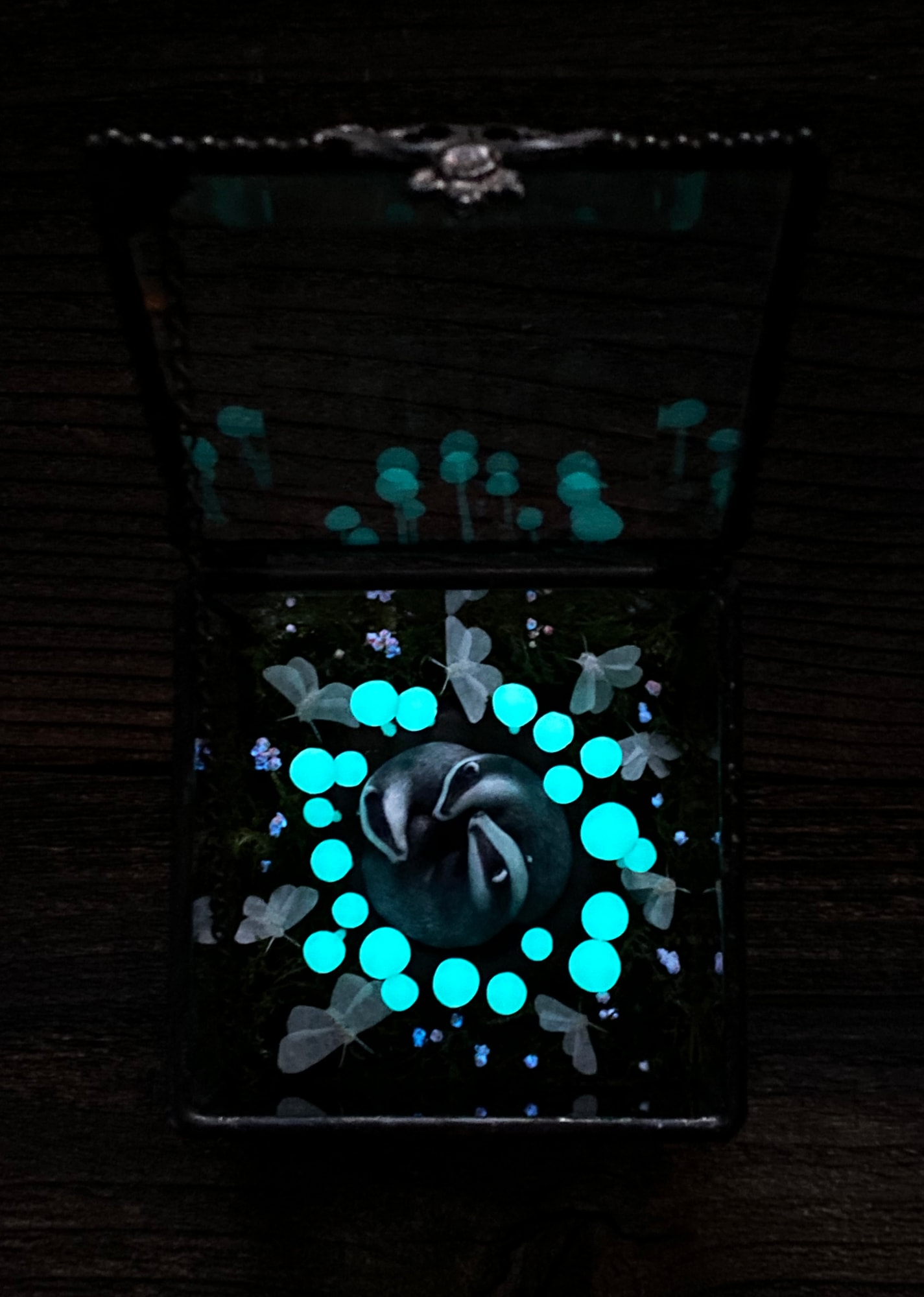 • Mixed media; glass shadow box, polymer clay and acrylic paint, paper moths, preserved moss and flowers, paper clay