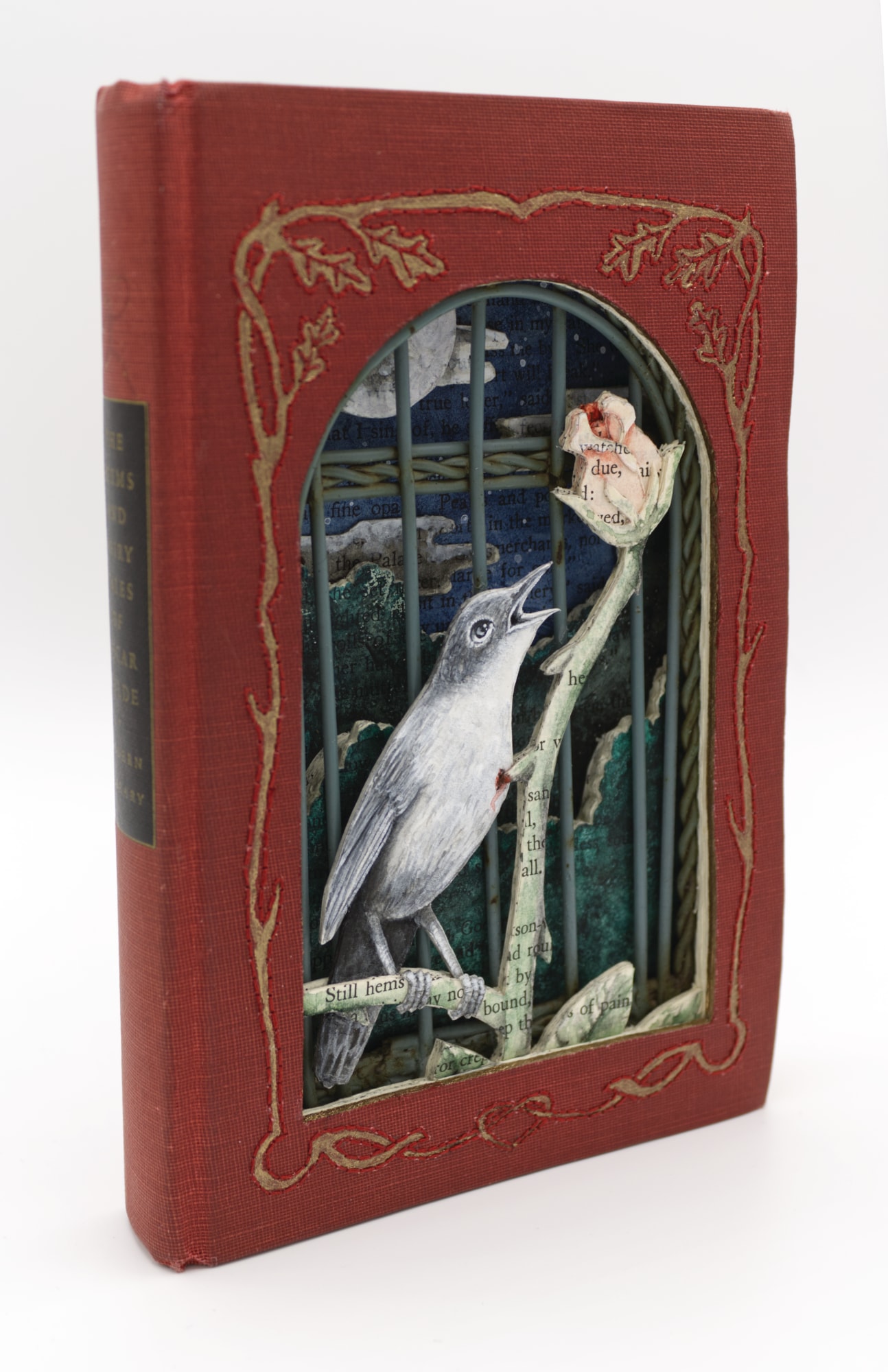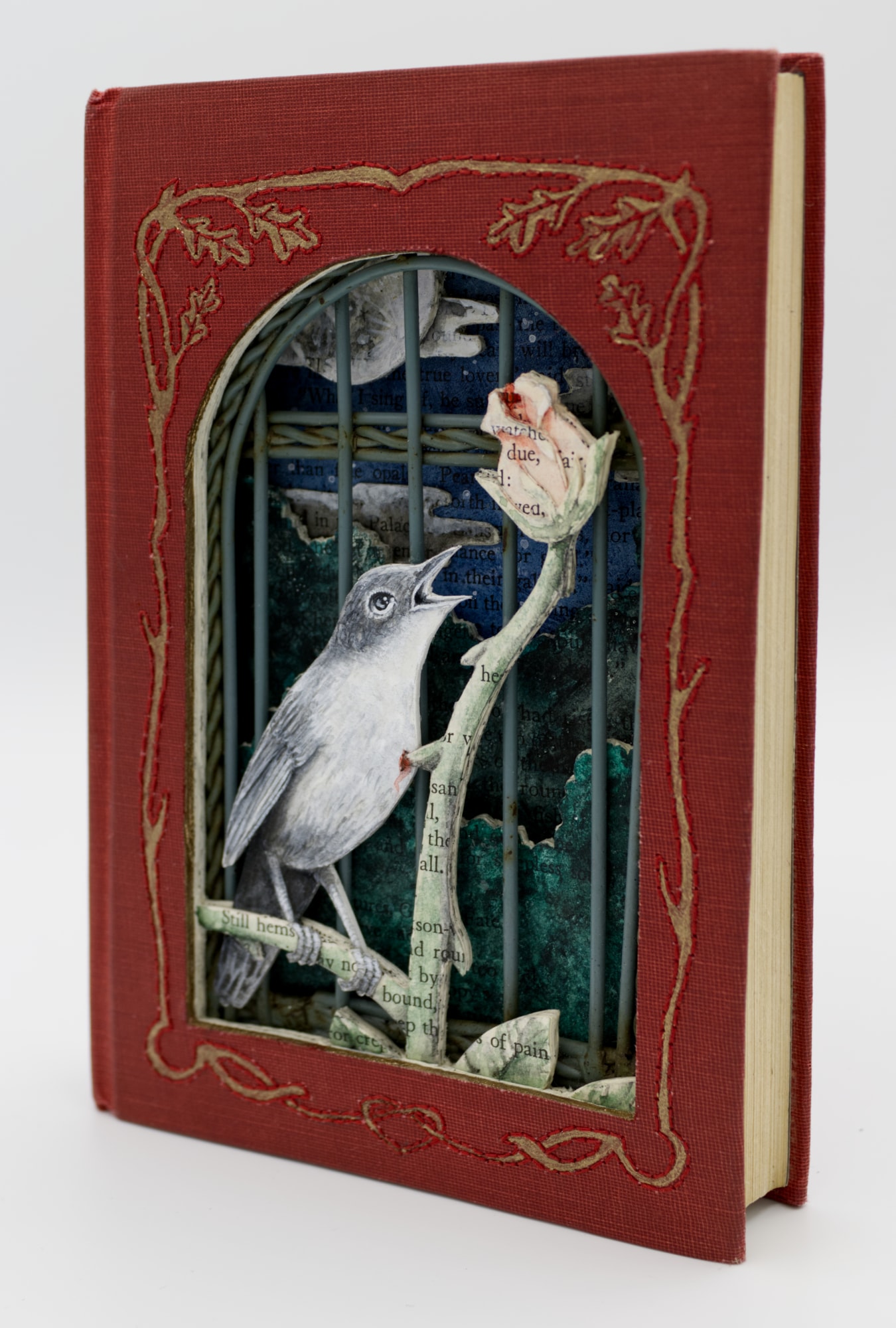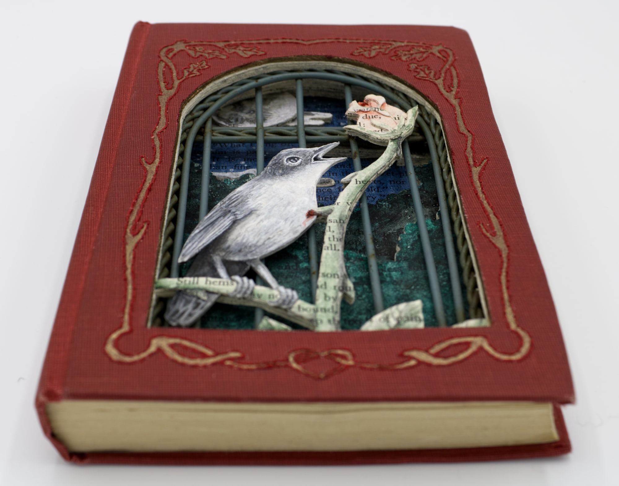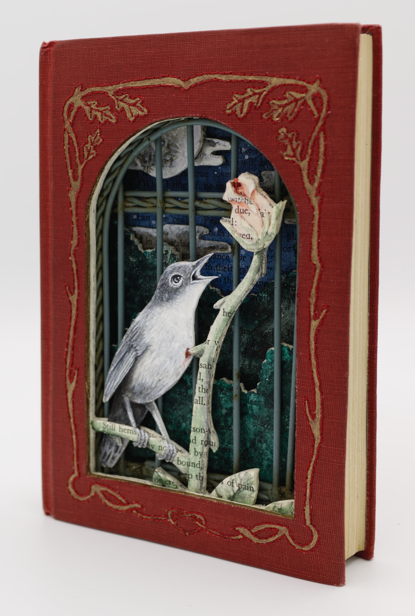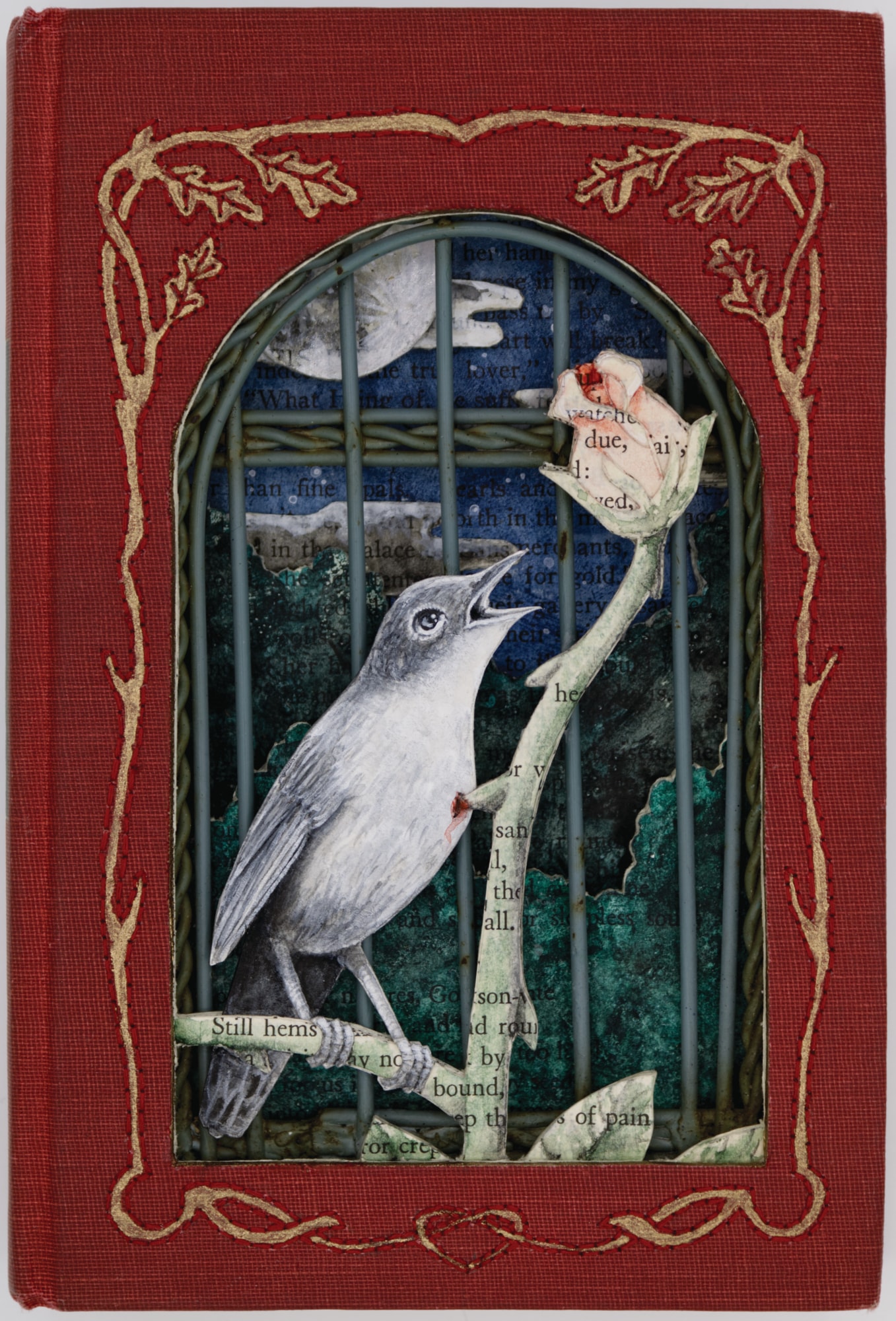 - Hand cut altered book (The Poems and Fairy Tales of Oscar Wilde published by Modern Library, 1930), acrylic, watercolor, acryla gouache, thread, metal birdcage door