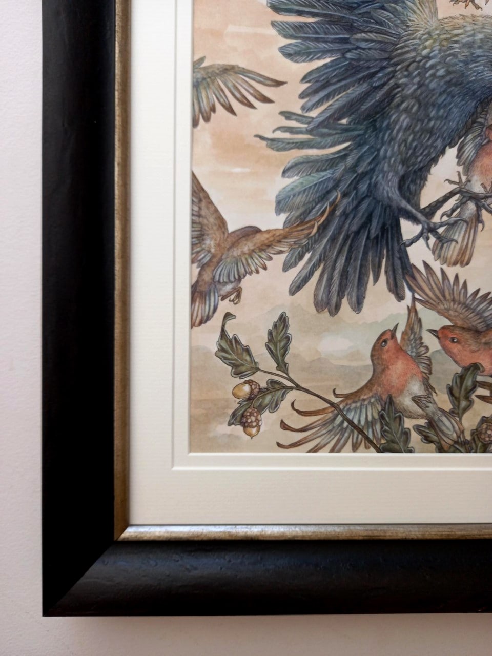 - Signature: This piece is signed in gold pen, central to the illustration and hidden under the mount. It is also named and signed on the back of the frame.