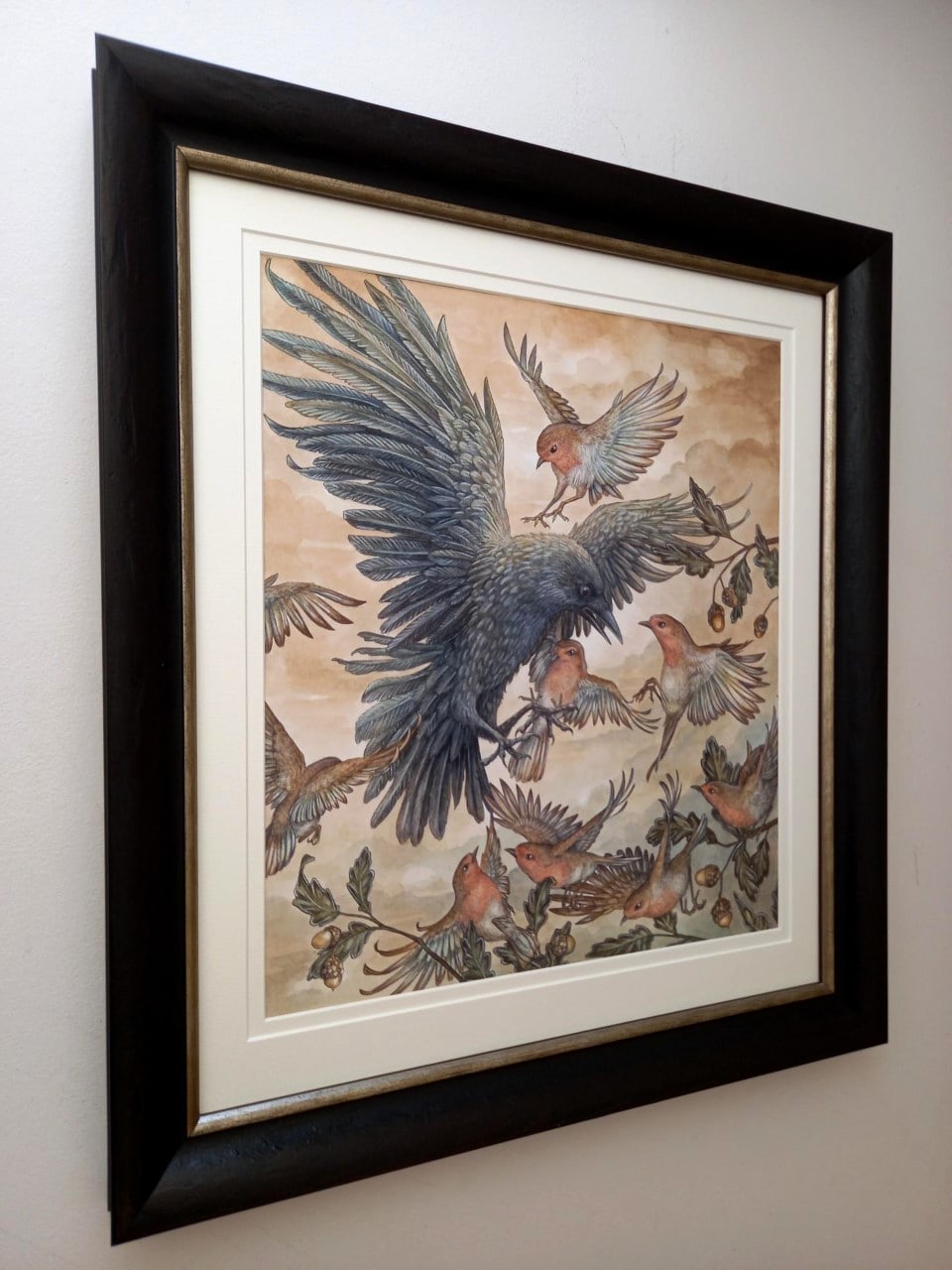 This piece depicts part of the arial battle which accompanies 'The Battle of Twin Oaks'. It shows a brave rabble of robins, banding together to defeat a mighty foe. Though they are small, they are many.
