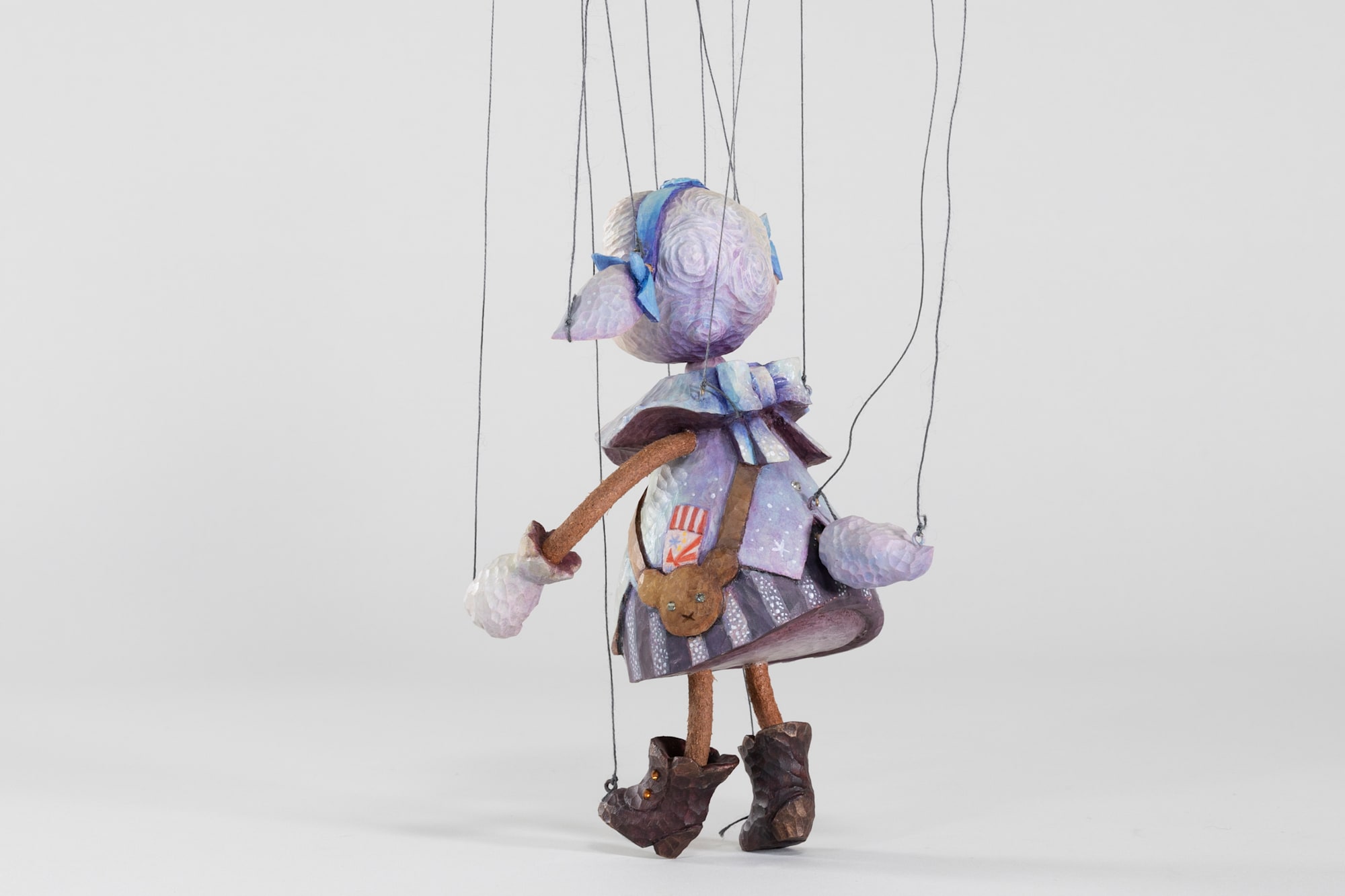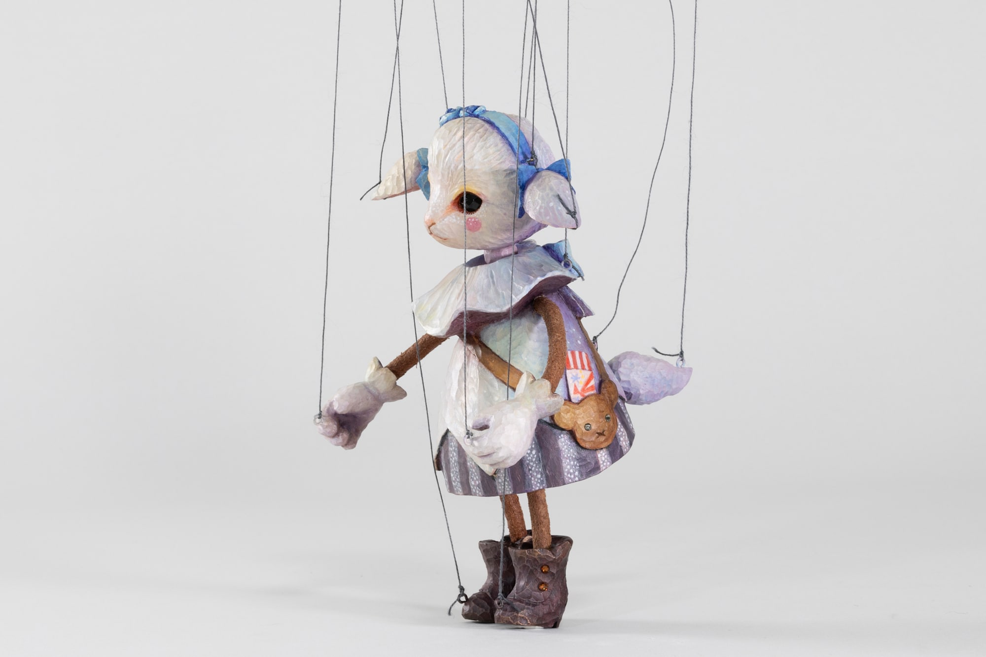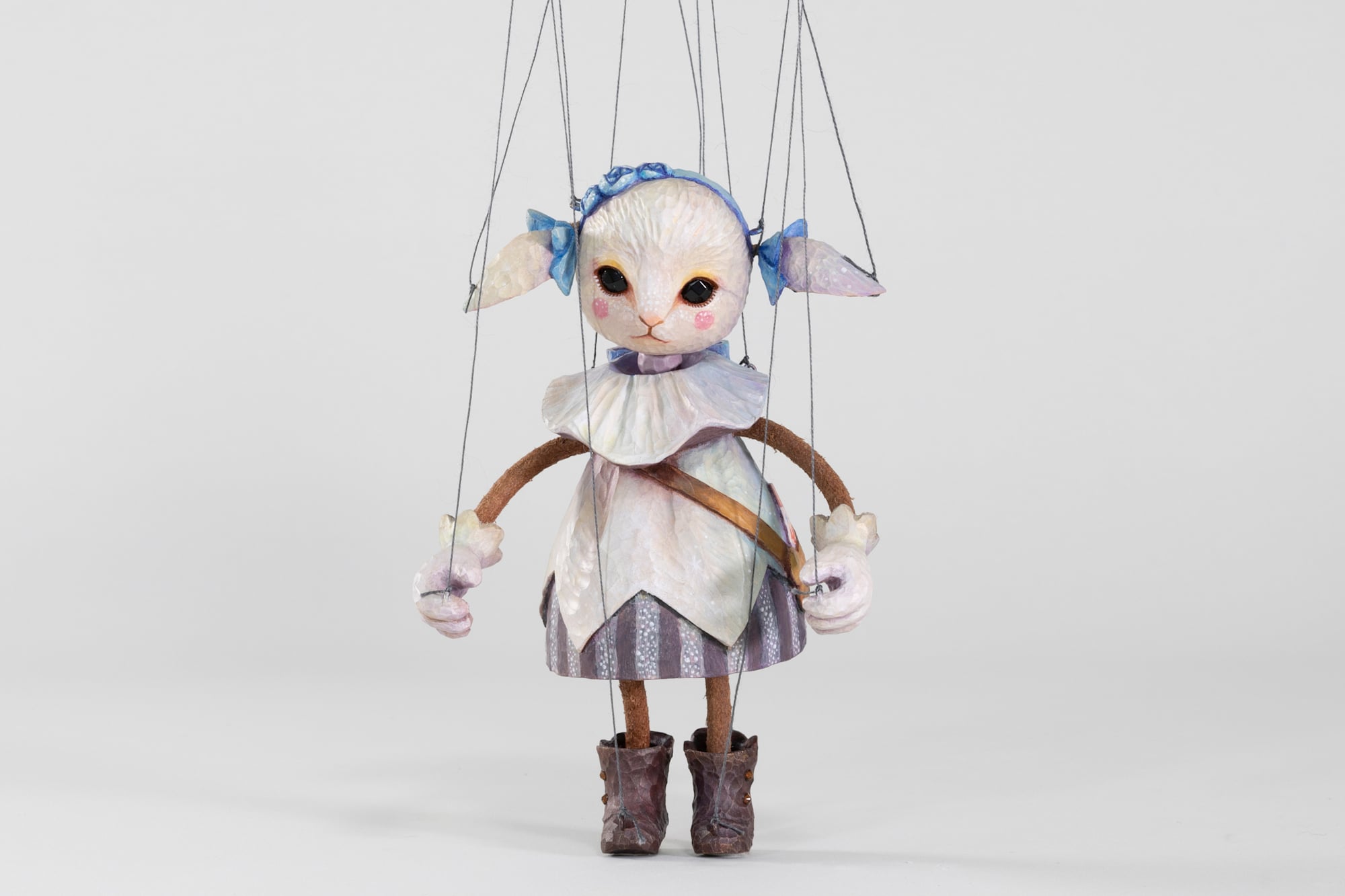 This marionette depicts a lamb from a wealthy but emotionally fractured home. With an endearing yet anxious expression, she represents the isolation of a child who has material abundance but no place to belong. The twilight colors reflected on her clothing symbolize the liminal time when children should be heading home—a time that becomes unsettling for those without a welcoming place to return to.
