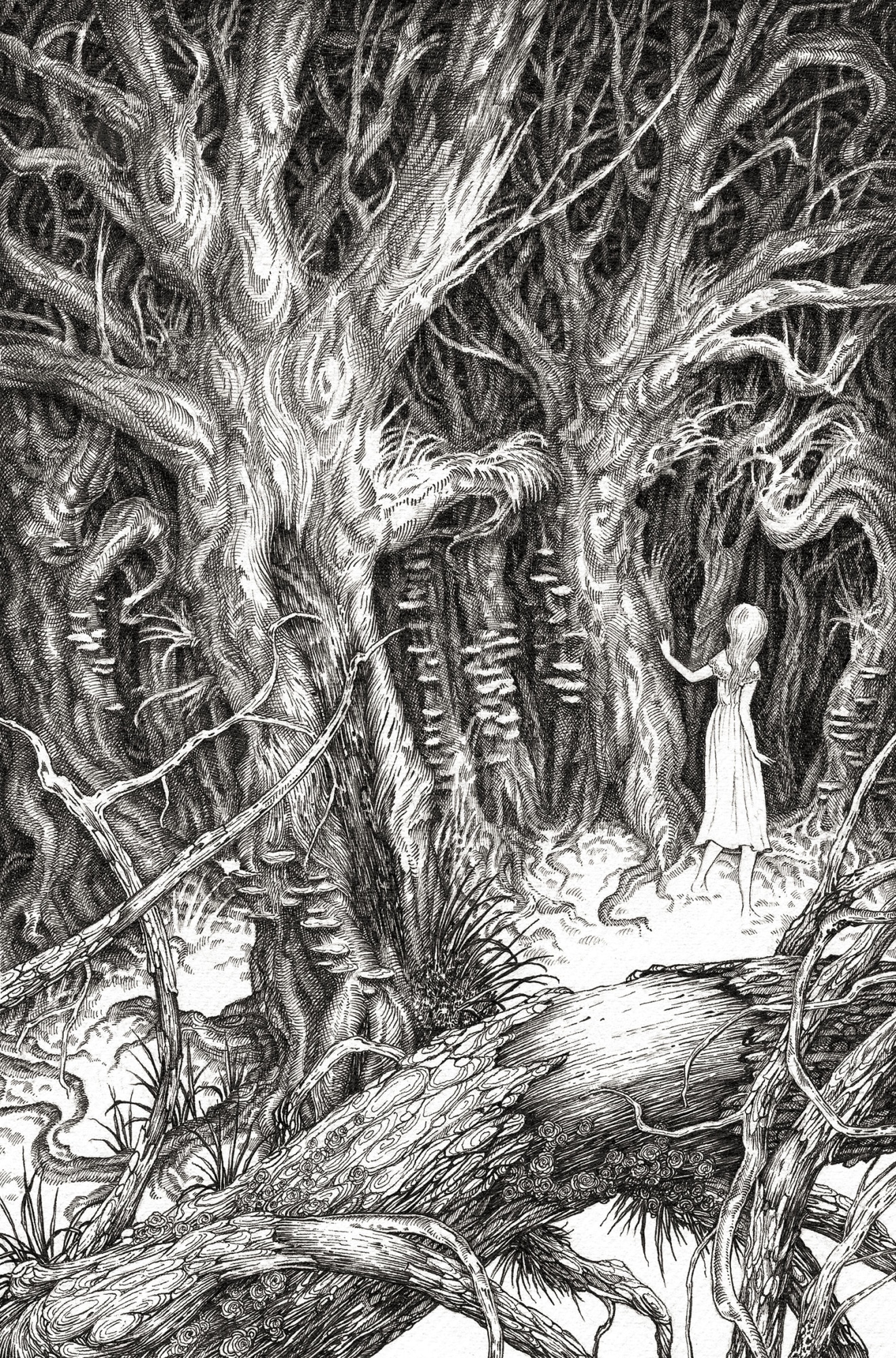 This is the final piece in my collection of three black and white crosshatched pieces. 'The Woodland Door' shows an explorer who has stumbled across the woodland protal to the Wildered Lands, as she journeys through the twisted branches and trunks she will find herself lost in the Wildered lands and faced with strange and wonderful magic.
