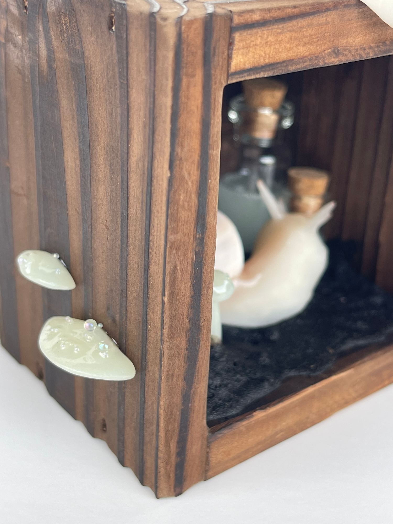 Two snails collecting bioluminescence from mushrooms.