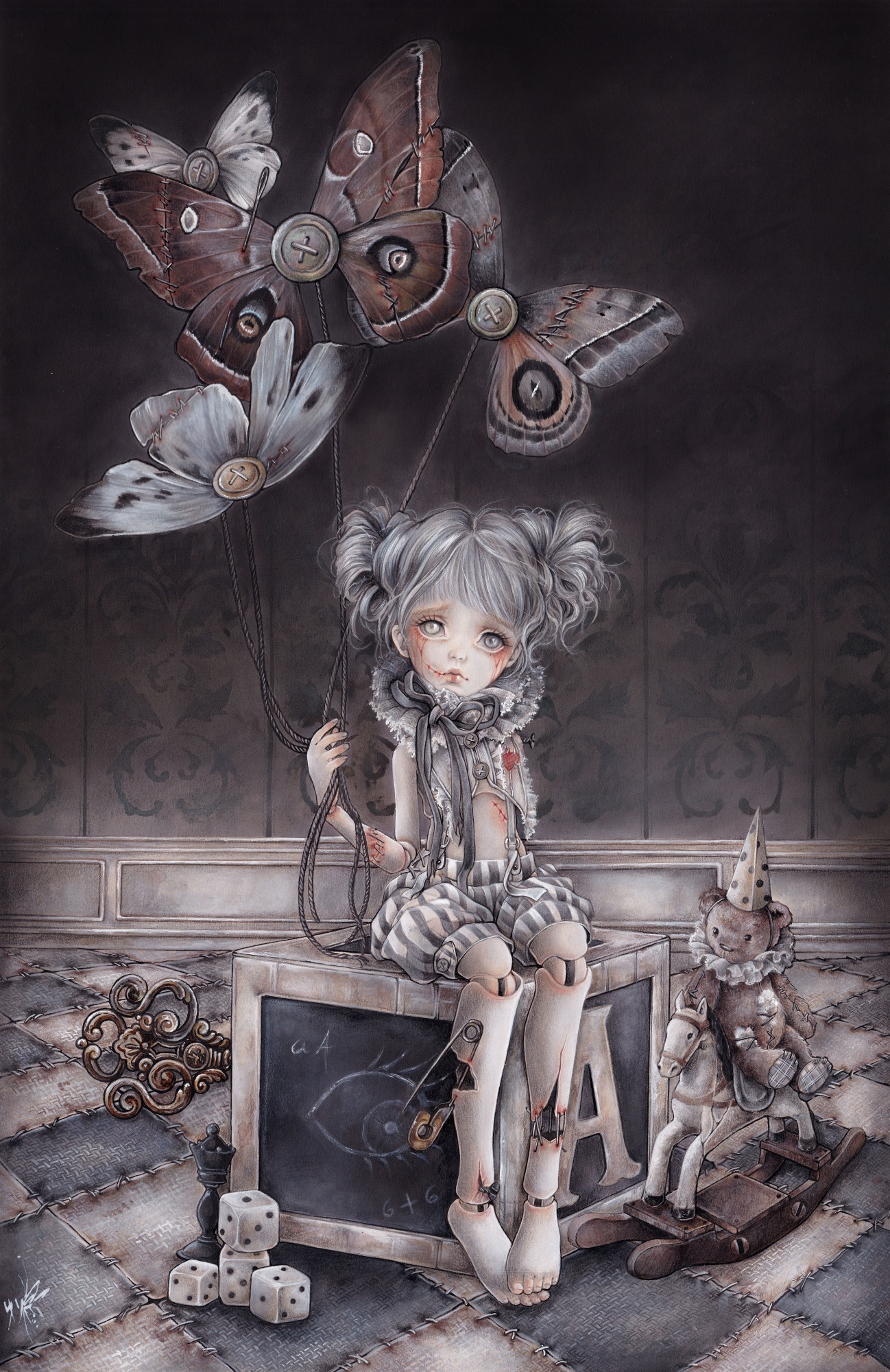 - Mixed, watercolor, acrylic, gouache, inks, markers, pastel and colored pencils on cardboard