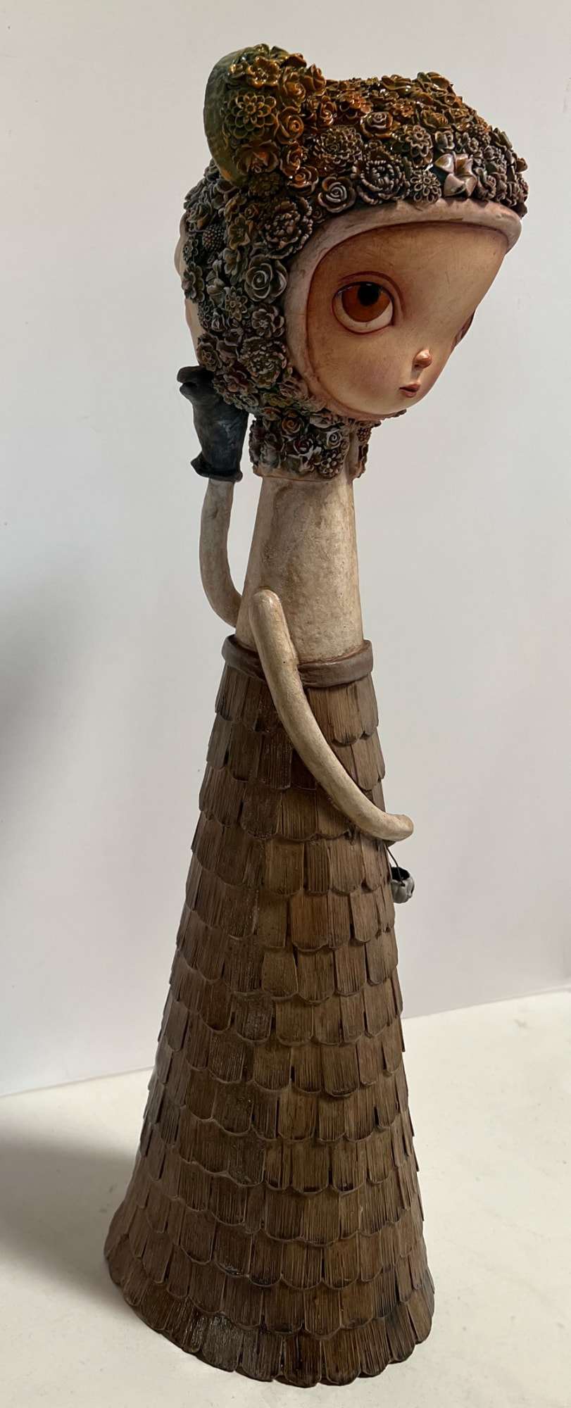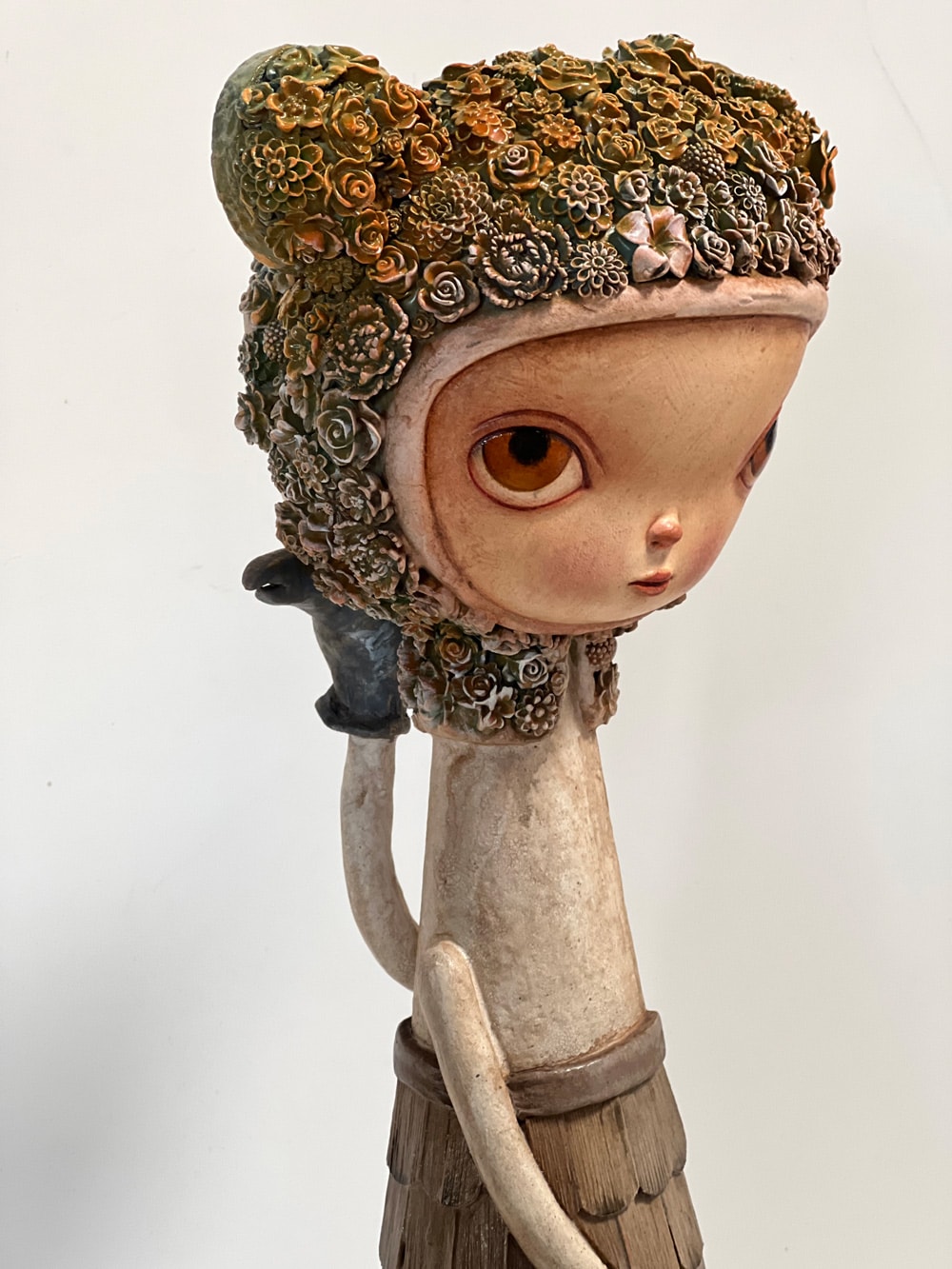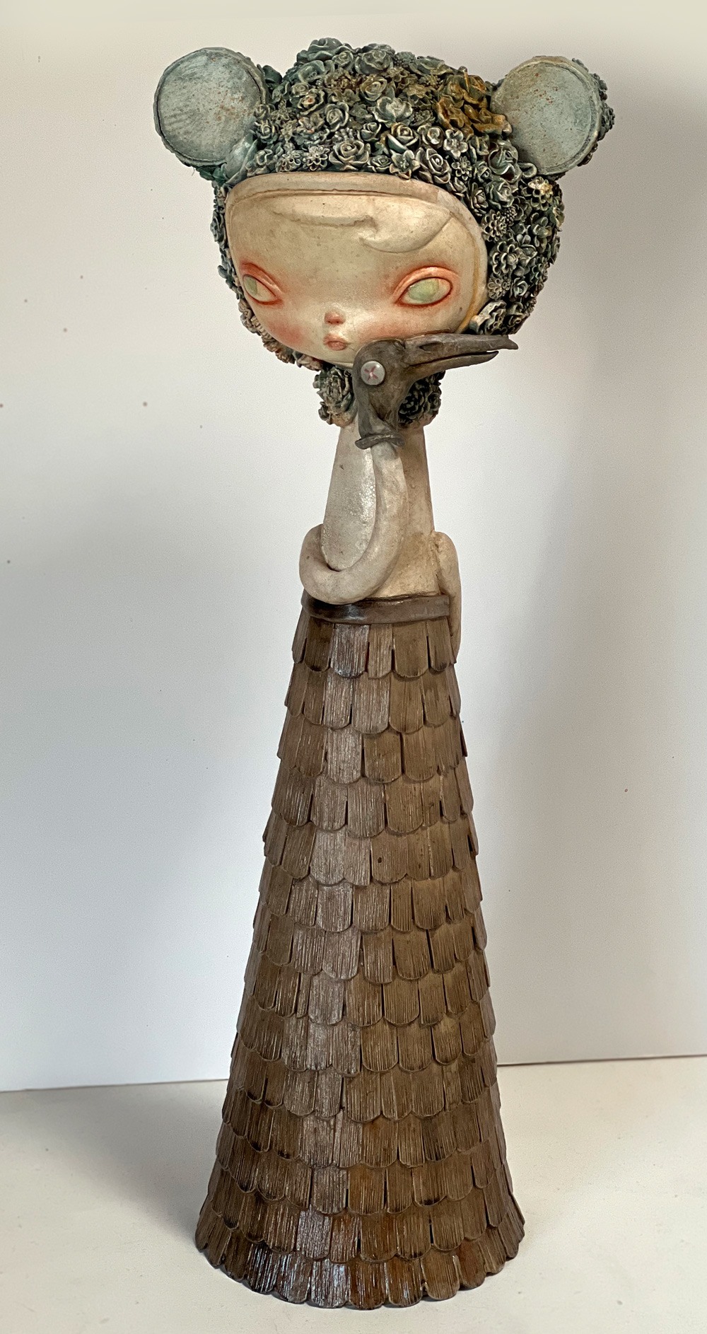 Two faced girl with wooden shingle dress and aqua Flora bear hood. Ghost face side holding a crow puppet to her cheek; other side holds tiny pumpkin skull bucket.